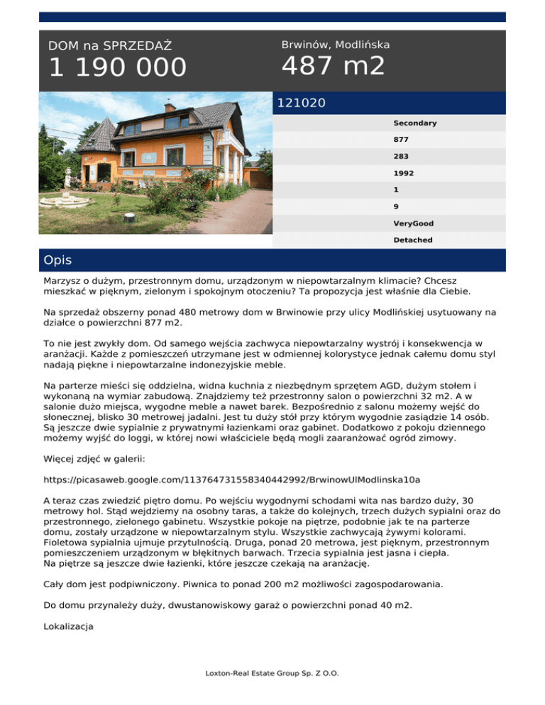 DOM na SPRZEDAŻ 1 190 000 Brwinów, Modlińska 487 m2 121020 Secondary 877 283 1992 1 9 VeryGood Detached Opis Marzysz o dużym, przestronnym domu, urządzonym w niepowtarzalnym klimacie? Chcesz mieszkać w pięknym, zielonym i spokojnym otoczeniu? Ta propozycja jest właśnie dla Ciebie. Na sprzedaż obszerny ponad 480 metrowy dom w Brwinowie przy ulicy Modlińskiej usytuowany na działce o powierzchni 877 m2. To nie jest zwykły dom. Od samego wejścia zachwyca niepowtarzalny wystrój i konsekwencja w aranżacji. Każde z pomieszczeń utrzymane jest w odmiennej kolorystyce jednak całemu domu styl nadają piękne i niepowtarzalne indonezyjskie meble. Na parterze mieści się oddzielna, widna kuchnia z niezbędnym sprzętem AGD, dużym stołem i wykonaną na wymiar zabudową. Znajdziemy też przestronny salon o powierzchni 32 m2. A w salonie dużo miejsca, wygodne meble a nawet barek. Bezpośrednio z salonu możemy wejść do słonecznej, blisko 30 metrowej jadalni. Jest tu duży stół przy którym wygodnie zasiądzie 14 osób. Są jeszcze dwie sypialnie z prywatnymi łazienkami oraz gabinet. Dodatkowo z pokoju dziennego możemy wyjść do loggi, w której nowi właściciele będą mogli zaaranżować ogród zimowy. Więcej zdjęć w galerii: https://picasaweb.google.com/113764731558340442992/BrwinowUlModlinska10a A teraz czas zwiedzić piętro domu. Po wejściu wygodnymi schodami wita nas bardzo duży, 30 metrowy hol. Stąd wejdziemy na osobny taras, a także do kolejnych, trzech dużych sypialni oraz do przestronnego, zielonego gabinetu. Wszystkie pokoje na piętrze, podobnie jak te na parterze domu, zostały urządzone w niepowtarzalnym stylu. Wszystkie zachwycają żywymi kolorami. Fioletowa sypialnia ujmuje przytulnością. Druga, ponad 20 metrowa, jest pięknym, przestronnym pomieszczeniem urządzonym w błękitnych barwach. Trzecia sypialnia jest jasna i ciepła. Na piętrze są jeszcze dwie łazienki, które jeszcze czekają na aranżację. Cały dom jest podpiwniczony. Piwnica to ponad 200 m2 możliwości zagospodarowania. Do domu przynależy duży, dwustanowiskowy garaż o powierzchni ponad 40 m2. Lokalizacja Loxton-Real Estate Group Sp. Z O.O. Dom położony jest w cichej, zielonej i spokojnej okolicy domów jednorodzinnych. Dojazd do Warszawy trasą A2 zajmuje około 35 minut. Nieruchomość od centrum Brwinowa dzieli jedyne 1,5 kilometra. O tym domu można by jeszcze długo pisać, jednak trzeba go zobaczyć. Zapraszam do oglądania tej niezwykłej nieruchomości. W celu umówienia się na prezentację proszę o kontakt telefoniczny. Gorąco polecam. Oferujemy także bezpłatną pomoc przy uzyskaniu kredytu: określeniu zdolności kredytowych i uzyskaniu jak najlepszych warunków kredytowania, we wszystkich dostępnych bankach. Loxton-Real Estate Group Sp. Z O.O. tel. 22 40 44 006 email: [email protected] Loxton-Real Estate Group Sp. Z O.O. Powered by TCPDF (www.tcpdf.org)