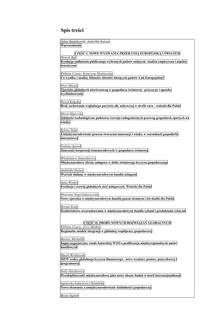 Spis treści Adam Budnikowski, Andżelika Kuźnar Wprowadzenie CZĘŚĆ I. NOWE WYZWANIA PRZED UNIĄ EUROPEJSKĄ I ŚWIATEM Henryk Bąk Ewolucja zadłużenia publicznego wybranych państw unijnych. Analiza empiryczna i aspekty teoretyczne Elżbieta Czarny, Katarzyna Śledziewska Co wynika z analizy bilansów obrotów bieżących państw Unii Europejskiej? Piotr Misztal Zjawisko globalnych nierównowag w gospodarce światowej - przyczyny i sposoby wyeliminowania Paweł Kulpaka Brak zachowania względnego parytetu siły nabywczej w strefie euro - wnioski dla Polski Maria Majewska Zdolności technologiczne podstawą rozwoju endogenicznych przewag gospodarek opartych na wiedzy Sylwia Talar Umiędzynarodowienie procesu tworzenia innowacji i wiedzy w warunkach gospodarki internetowej Tadeusz Sporek Znaczenie korporacji transnarodowych w gospodarce światowej Włodzimierz Januszkiewicz Międzynarodowe obroty usługowe w dobie światowego kryzysu gospodarczego Andżelika Kuźnar Wartość dodana w międzynarodowym handlu usługami Anna Wróbel Ewolucja i rozwój globalnych sieci usługowych. Wnioski dla Polski Honorata Nyga-Łukaszewska Nowe zjawiska w międzynarodowym handlu gazem ziemnym i ich skutki dla Polski Renata Knap Środowiskowe uwarunkowania w międzynarodowym handlu rybami i produktami rybnymi CZĘŚĆ II. PROBY NOWYCH ROZWIĄZAŃ GLOBALNYCH Elżbieta Czarny, Jerzy Menkes Regionalne modele integracji w globalnej współpracy gospodarczej Bartosz Michalski Impas negocjacyjny rundy katarskiej WTO a proliferacja międzyregionalnych umów handlowych Marek Wróblewski MFW wobec globalnego kryzysu finansowego - nowe wymiary pomocy pożyczkowej i programowej Nelly Daszkiewicz Przedsiębiorczość międzynarodowa jako nowy obszar badań w teorii internacjonalizacji Agnieszka Łukasiewicz-Kamińska Nowa ekonomia a umiędzynarodowienie działalności gospodarczej Beata Stępień Hybrydowe strategie zarządzania wartością dla klienta w skali międzynarodowej - przyczyny, przejawy, konsekwencje Marcin Gryczka Rozwój społeczny i technologiczny a przepływy bezpośrednich inwestycji zagranicznych w świetle nowego paradygmatu rozwoju J.H. Dunninga Andrzej Geise Modelowanie zmienności cen ropy na rynku ropy naftowej oraz kursów walutowych, stop procentowych i indeksów giełdowych w krajach Europy Środkowej i Wschodniej oraz w strefie euro CZĘŚĆ III. PRÓBY ROZWIĄZAŃ REGIONALNYCH I NARODOWYCH Edward Molendowski, Małgorzata Żmuda Rola powiązań międzynarodowych w kształtowaniu przewagi konkurencyjnej - Polska na tle krajów Grupy Wyszehradzkiej w latach 2004-2011 Patryk Toporowski Ewolucja miejsca państw Grupy Wyszehradzkiej w handlu europejskim Łukasz Ambroziak Zmiany w handlu wewnątrzgałęziowym wyrobami przemysłu motoryzacyjnego w Unii Europejskiej Alina Szypulewska-Porczyńska Nowy system podatku VAT w handlu usługami cyfrowymi na rynku wewnętrznym UE Bożena Pera Preferencyjne porozumienia handlowe Unii Europejskiej i ich skutki dla wymiany handlowej Polski Jerzy Grabowiecki Abenomika jako nowa polityka gospodarcza przezwyciężenia stagnacji w Japonii Mieczysław Szostak Postsowieckie kraje Azji Środkowej jako nowe państwa przyjmujące bezpośrednie inwestycje zagraniczne Arkadiusz Michał Kowalski Handel międzynarodowy i bezpośrednie inwestycje zagraniczne jako zewnętrzne czynniki innowacyjności gospodarki Irlandii Eliza Chilimoniuk-Przeździecka Wpływ bezpośrednich inwestycji zagranicznych na eksport usług biznesowych z Polski Aleksandra Nacewska-Twardowska Rozwój stosunków bilateralnych w handlu międzynarodowym - skutki dla Polski Anna Odrobina Znaczenie globalnych sieci innowacji dla polskiej gospodarki Ewa Jastrzębska, Paulina Legutko-Kobus Polityka klimatyczna Unii Europejskiej a dobre praktyki biznesu w Polsce Katarzyna Czech Znaczenie zielonej gospodarki dla realizacji celów zrównoważonego rozwoju - wnioski dla Polski
