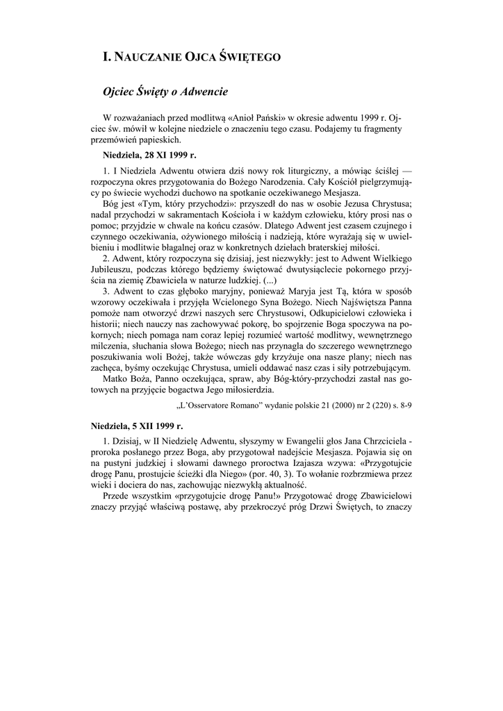 I. NAUCZANIE OJCA ŚWIĘTEGO Ojciec Święty o Adwencie W rozważaniach przed modlitwą «Anioł Pański» w okresie adwentu 1999 r. Ojciec św. mówił w kolejne niedziele o znaczeniu tego czasu. Podajemy tu fragmenty przemówień papieskich. Niedziela, 28 XI 1999 r. 1. I Niedziela Adwentu otwiera dziś nowy rok liturgiczny, a mówiąc ściślej — rozpoczyna okres przygotowania do Bożego Narodzenia. Cały Kościół pielgrzymujący po świecie wychodzi duchowo na spotkanie oczekiwanego Mesjasza. Bóg jest «Tym, który przychodzi»: przyszedł do nas w osobie Jezusa Chrystusa; nadal przychodzi w sakramentach Kościoła i w każdym człowieku, który prosi nas o pomoc; przyjdzie w chwale na końcu czasów. Dlatego Adwent jest czasem czujnego i czynnego oczekiwania, ożywionego miłością i nadzieją, które wyrażają się w uwielbieniu i modlitwie błagalnej oraz w konkretnych dziełach braterskiej miłości. 2. Adwent, który rozpoczyna się dzisiaj, jest niezwykły: jest to Adwent Wielkiego Jubileuszu, podczas którego będziemy świętować dwutysiąclecie pokornego przyjścia na ziemię Zbawiciela w naturze ludzkiej. (...) 3. Adwent to czas głęboko maryjny, ponieważ Maryja jest Tą, która w sposób wzorowy oczekiwała i przyjęła Wcielonego Syna Bożego. Niech Najświętsza Panna pomoże nam otworzyć drzwi naszych serc Chrystusowi, Odkupicielowi człowieka i historii; niech nauczy nas zachowywać pokorę, bo spojrzenie Boga spoczywa na pokornych; niech pomaga nam coraz lepiej rozumieć wartość modlitwy, wewnętrznego milczenia, słuchania słowa Bożego; niech nas przynagla do szczerego wewnętrznego poszukiwania woli Bożej, także wówczas gdy krzyżuje ona nasze plany; niech nas zachęca, byśmy oczekując Chrystusa, umieli oddawać nasz czas i siły potrzebującym. Matko Boża, Panno oczekująca, spraw, aby Bóg-który-przychodzi zastał nas gotowych na przyjęcie bogactwa Jego miłosierdzia. „L’Osservatore Romano” wydanie polskie 21 (2000) nr 2 (220) s. 8-9 Niedziela, 5 XII 1999 r. 1. Dzisiaj, w II Niedzielę Adwentu, słyszymy w Ewangelii głos Jana Chrzciciela proroka posłanego przez Boga, aby przygotował nadejście Mesjasza. Pojawia się on na pustyni judzkiej i słowami dawnego proroctwa Izajasza wzywa: «Przygotujcie drogę Panu, prostujcie ścieżki dla Niego» (por. 40, 3). To wołanie rozbrzmiewa przez wieki i dociera do nas, zachowując niezwykłą aktualność. Przede wszystkim «przygotujcie drogę Panu!» Przygotować drogę Zbawicielowi znaczy przyjąć właściwą postawę, aby przekroczyć próg Drzwi Świętych, to znaczy 6 Anamnesis 28 przyjąć przeobfitą łaskę, którą Chrystus przyniósł światu, a która w Roku Jubileuszowym stanie się dostępna dla wszystkich. (...) 2. «Prostujcie ścieżki dla Niego». Aby spotkać się z naszym Odkupicielem, musimy się «nawrócić», to znaczy wyjść Mu naprzeciw z radosną wiarą, porzucając mentalność i styl życia, które nie pozwalają nam w pełni naśladować Chrystusa. (...) „L’Osservatore Romano” wydanie polskie wydanie polskie 21 (2000) nr 2 (220) s.9 Niedziela, 12 XII 1999 r. 1. Liturgia wzywa nas dziś do radości, ponieważ «Pan jest blisko!» (Flp 4, 5). Bliskie jest już Jego narodzenie i stajemy na progu Wielkiego Jubileuszu, który będzie jak gdyby całorocznym świętem tajemnicy wcielenia, obchodzonym w dwa tysiące lat po przyjściu na świat Syna Bożego w uniżeniu naszej ludzkiej natury. Sam Chrystus wskazuje motywy tej radości słowami proroka Izajasza: «Duch Pański spoczywa na Mnie - ogłasza - ponieważ Mnie namaścił i posłał Mnie, abym ubogim niósł dobrą nowinę, więźniom głosił wolność, a niewidomym przejrzenie; abym uciśnionych odsyłał wolnymi» (Łk 4, 18; por. Iz 61, 1). W wigilię nowego tysiąclecia Kościół znów ogłasza to orędzie nadziei i obwieszcza «rok łaski Pańskiej» (Iz 61, 2), wzywając wszystkich, aby obficie czerpali z samego źródła łaski - z Jezusa Chrystusa, Boga-Człowieka, Odkupiciela człowieka i Pana historii. 2. Jednym z przejawów tego radosnego oczekiwania na Boże Narodzenie jest ludowy zwyczaj przygotowywania szopek przez rodziny. W tych dniach w chrześcijańskich domach umieszcza się w wybranym miejscu różne figurki, pozostawiając między Maryją i Józefem wolną przestrzeń dla Dzieciątka. Myśląc o wszystkich chrześcijańskich rodzinach przygotowujących swoje szopki, z serca błogosławię wam, drodzy chłopcy i dziewczęta Rzymu, którzy przybyliście tu w licznej grupie, zorganizowanej przez Centrum Oratoriów Rzymskich, i przynieśliście figurki Dzieciątka. Niech bliskie już Boże Narodzenie, początek Wielkiego Jubileuszu, skłoni wszystkich wierzących na całym świecie do przygotowania godnego mieszkania dla Chrystusa. (...) 3. Na tej drodze wiodącej ku Świętej Nocy towarzyszy nam Maryja - Ta, która strzeże tajemnicy radości. Jej Niepokalane Serce pełne jest radosnego oczekiwania na przyjście Boga i na spełnienie Jego obietnic. W szopce postać Maryi przyciąga naszą szczególną uwagę. Widzimy w Niej obraz matek, które przygotowują się do wydania na świat dziecka. Rozpoznajemy w Niej wszystkie kobiety, które z miłością i troską przyjmują wielką tajemnicę życia. Niech Matka Pana pomoże nam przygotować się na Boże Narodzenie i otworzyć serca na przyjęcie Jezusa. „L’Osservatore Romano” wydanie polskie wydanie polskie 21 (2000) nr 2 (220) s. 11-12