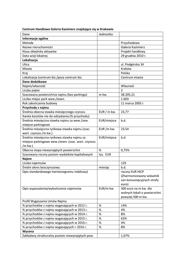 Centrum Handlowe Galeria Kazimierz znajdujące się w Krakowie Dane Jednostka Informacje ogólne Metoda Nazwa nieruchomości Klasa składnika aktywów Data wizji lokalnej Lokalizacja Ulica Miasto Kraj Lokalizacja (centrum biz./poza centrum biz. Dane dodatkowe Najem/własność Liczba pięter Szacowana powierzchnia najmu (bez parkingu) m kw. Liczba miejsc park wew./zewn. Rok zakończenia budowy Przychody z najmu Średnia obecna stawka miesięcznego czynszu EUR / m kw. Kwota kosztów nie do odzyskania (% przychodu) Średnia miesięczna stawka najmu za wew./zew. EUR/miejsce miejsce parkingowe Średnia miesięczna rynkowa stawka najmu (szac. EUR /m kw. wart. czynszu /m kw.) Średnia miesięczna rynkowa stawka najmu za EUR/miejsce miejsce parkingowe wew./zewn. (szac. wart. czynszu /m kw.) Obecna stopa niewynajętych powierzchni % Szacowany roczny poziom wydatków kapitałowych tys. EUR Najem Liczba najemców Średni okres bezczynszowy miesiąc Opis standardowego harmonogramu indeksacji Opis wyposażenia/wykończenia najemców Profil Wygaszania Umów Najmu % przychodów z najmu wygasających w 2012 r. % przychodów z najmu wygasających w 2013 r. % przychodów z najmu wygasających w 2014 r. % przychodów z najmu wygasających w 2015 r. % przychodów z najmu wygasających w 2016 r. % przychodów z najmu wygasających > 2016 r. Wycena Zakładany strukturalny poziom niewynajętych pow. EUR/m kw. % % % % % % Przychodowa Galeria Kazimierz Projekt handlowy 29 grudnia 2010 r. ul. Podgórska 34 Kraków Polska Centrum miasta Własność 2 38.205,21 1.603 11 marca 2005 r. 23,77 b.d. 23,54 b.d. 0,75% 129 b.d. roczny EUR HICP (Zharmonizowany wskaźnik cen konsumpcyjnych strefy euro) 300 euro na m kw. dla wolnych lokali o powierzchni powyżej 500 m kw. 14% 4% 8% 62% 4% 8% 1,67% Zakładana data wyjścia Stopa dyskonta Prognozowana stopa kapitalizacji wyjścia i/lub ekwiwalent stopy kapitalizacji Wartość rynkowa (przy podstawie 100%) na dzień 31.12.2011 r. Komentarze % % % tys. EUR b.d. b.d. b.d. 6,50% 164 300
