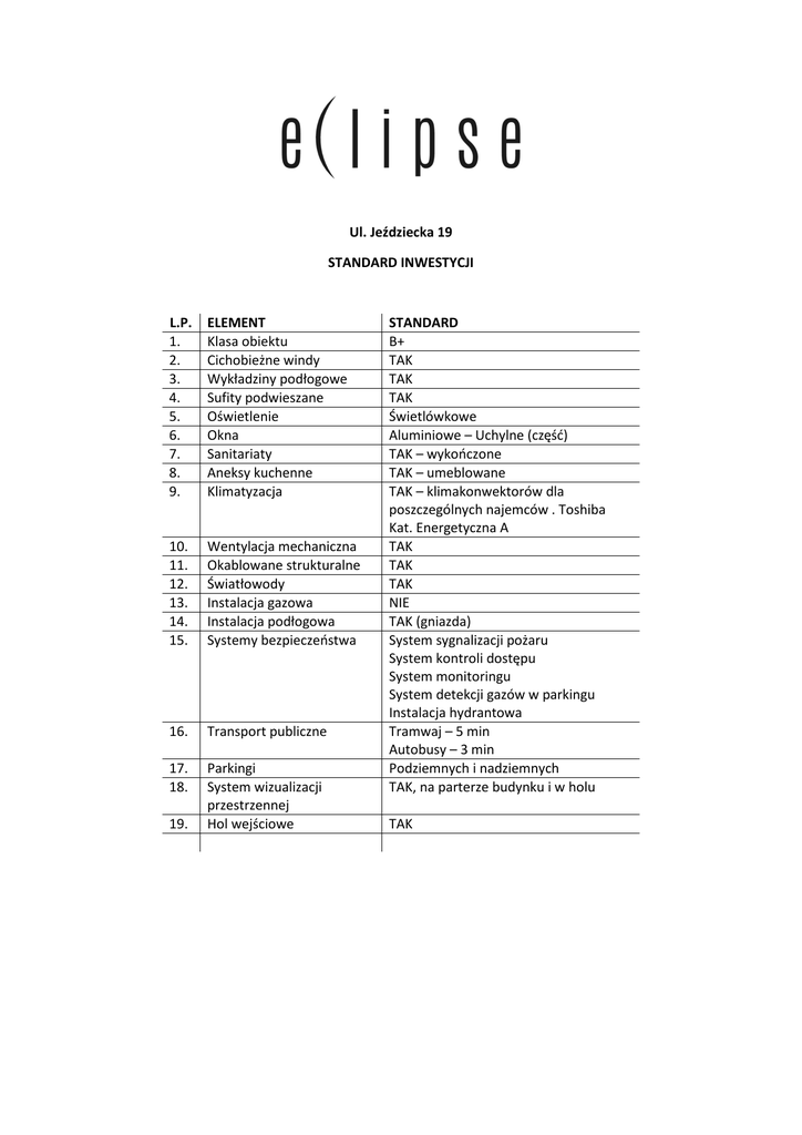 Ul. Jeździecka 19 STANDARD INWESTYCJI L.P. 1. 2. 3. 4. 5. 6. 7. 8. 9. ELEMENT Klasa obiektu Cichobieżne windy Wykładziny podłogowe Sufity podwieszane Oświetlenie Okna Sanitariaty Aneksy kuchenne Klimatyzacja 10. 11. 12. 13. 14. 15. Wentylacja mechaniczna Okablowane strukturalne Światłowody Instalacja gazowa Instalacja podłogowa Systemy bezpieczeństwa 16. Transport publiczne 17. 18. Parkingi System wizualizacji przestrzennej Hol wejściowe 19. STANDARD B+ TAK TAK TAK Świetlówkowe Aluminiowe – Uchylne (część) TAK – wykończone TAK – umeblowane TAK – klimakonwektorów dla poszczególnych najemców . Toshiba Kat. Energetyczna A TAK TAK TAK NIE TAK (gniazda) System sygnalizacji pożaru System kontroli dostępu System monitoringu System detekcji gazów w parkingu Instalacja hydrantowa Tramwaj – 5 min Autobusy – 3 min Podziemnych i nadziemnych TAK, na parterze budynku i w holu TAK