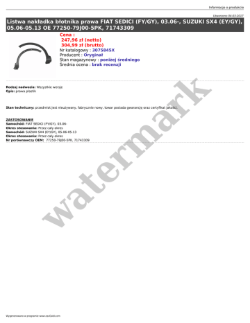 Informacje o produkcie Utworzono 04-03-2017 Listwa nakładka błotnika prawa FIAT SEDICI (FY/GY), 03.06-, SUZUKI SX4 (EY/GY), 05.06-05.13 OE 77250-79J00-5PK, 71743309 Cena : 247,96 zł (netto) 304,99 zł (brutto) Rodzaj nadwozia: Wszystkie wersje Opis: prawa plastik er m ar k Nr katalogowy : 3075845X Producent : Oryginał Stan magazynowy : poniżej średniego Średnia ocena : brak recenzji Stan techniczny: przedmiot jest nieużywany, fabrycznie nowy, towar posiada gwarancję oraz certyfikat jakości. w at ZASTOSOWANIE Samochód: FIAT SEDICI (FY/GY), 03.06Okres stosowania: Przez cały okres Samochód: SUZUKI SX4 (EY/GY), 05.06-05.13 Okres stosowania: Przez cały okres Nr porównawczy OEM: 77250-79J00-5PK, 71743309 Wygenerowano w programie www.oscGold.com
