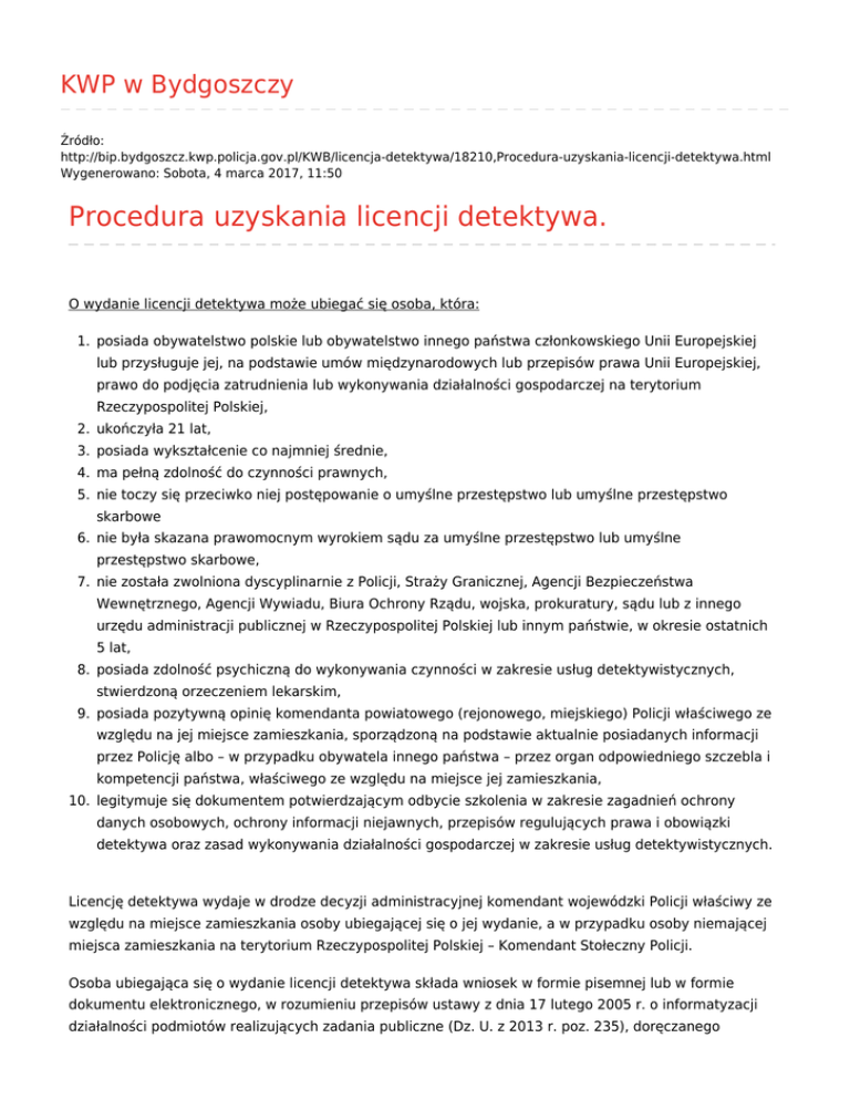 KWP w Bydgoszczy Źródło: http://bip.bydgoszcz.kwp.policja.gov.pl/KWB/licencja-detektywa/18210,Procedura-uzyskania-licencji-detektywa.html Wygenerowano: Sobota, 4 marca 2017, 11:50 Procedura uzyskania licencji detektywa. O wydanie licencji detektywa może ubiegać się osoba, która: 1. posiada obywatelstwo polskie lub obywatelstwo innego państwa członkowskiego Unii Europejskiej lub przysługuje jej, na podstawie umów międzynarodowych lub przepisów prawa Unii Europejskiej, prawo do podjęcia zatrudnienia lub wykonywania działalności gospodarczej na terytorium Rzeczypospolitej Polskiej, 2. ukończyła 21 lat, 3. posiada wykształcenie co najmniej średnie, 4. ma pełną zdolność do czynności prawnych, 5. nie toczy się przeciwko niej postępowanie o umyślne przestępstwo lub umyślne przestępstwo skarbowe 6. nie była skazana prawomocnym wyrokiem sądu za umyślne przestępstwo lub umyślne przestępstwo skarbowe, 7. nie została zwolniona dyscyplinarnie z Policji, Straży Granicznej, Agencji Bezpieczeństwa Wewnętrznego, Agencji Wywiadu, Biura Ochrony Rządu, wojska, prokuratury, sądu lub z innego urzędu administracji publicznej w Rzeczypospolitej Polskiej lub innym państwie, w okresie ostatnich 5 lat, 8. posiada zdolność psychiczną do wykonywania czynności w zakresie usług detektywistycznych, stwierdzoną orzeczeniem lekarskim, 9. posiada pozytywną opinię komendanta powiatowego (rejonowego, miejskiego) Policji właściwego ze względu na jej miejsce zamieszkania, sporządzoną na podstawie aktualnie posiadanych informacji przez Policję albo – w przypadku obywatela innego państwa – przez organ odpowiedniego szczebla i kompetencji państwa, właściwego ze względu na miejsce jej zamieszkania, 10. legitymuje się dokumentem potwierdzającym odbycie szkolenia w zakresie zagadnień ochrony danych osobowych, ochrony informacji niejawnych, przepisów regulujących prawa i obowiązki detektywa oraz zasad wykonywania działalności gospodarczej w zakresie usług detektywistycznych. Licencję detektywa wydaje w drodze decyzji administracyjnej komendant wojewódzki Policji właściwy ze względu na miejsce zamieszkania osoby ubiegającej się o jej wydanie, a w przypadku osoby niemającej miejsca zamieszkania na terytorium Rzeczypospolitej Polskiej – Komendant Stołeczny Policji. Osoba ubiegająca się o wydanie licencji detektywa składa wniosek w formie pisemnej lub w formie dokumentu elektronicznego, w rozumieniu przepisów ustawy z dnia 17 lutego 2005 r. o informatyzacji działalności podmiotów realizujących zadania publiczne (Dz. U. z 2013 r. poz. 235), doręczanego środkami komunikacji elektronicznej do: 1) właściwego ze względu na swoje miejsce zamieszkania komendanta wojewódzkiego Policji albo 2) Komendanta Stołecznego Policji – w przypadku nieposiadania miejsca zamieszkania na terytorium Rzeczypospolitej Polskiej Wniosek powinien zawierać imię, nazwisko, adres oraz podpis osoby ubiegającej się o wydanie licencji. Osoba ubiegająca się o wydanie licencji detektywa do wniosku powinna dołączyć: 1. pisemne oświadczenie o pełnej zdolności do czynności prawnych, 2. pisemne oświadczenie, iż nie toczy się przeciwko niej postępowanie karne lub postępowanie w sprawach o przestępstwa skarbowe popełnione z winy umyślnej, 3. pisemne oświadczenie, że nie była skazana prawomocnym wyrokiem sądu za przestępstwo lub przestępstwo skarbowe popełnione z winy umyślnej, 4. pisemne oświadczenie, iż nie została zwolniona dyscyplinarnie z Policji, Straży Granicznej, Urzędu Ochrony Państwa, wojska, prokuratury, sądu lub innego urzędu administracji publicznej w RP lub innym państwie w okresie ostatnich 5 lat, 5. zaświadczenie o niekaralności, 6. kopie stron dowodu osobistego albo dokument stwierdzający posiadane obywatelstwo innego państwa członkowskiego Unii Europejskiej, zawierający imię, nazwisko, datę i miejsce urodzenia lub dokument potwierdzający przysługujące, na podstawie umów międzynarodowych lub przepisów prawa Unii Europejskiej, prawo do podjęcia zatrudnienia lub wykonywania działalności gospodarczej na terytorium Rzeczypospolitej Polskiej, zawierający imię, nazwisko, datę i miejsce urodzenia (oryginał do wglądu), 7. kopię świadectwa lub dyplomu potwierdzającego posiadanie co najmniej średniego wykształcenia (oryginał do wglądu), 8. dwie fotografie o wym. 2,5 x 3,5 cm, 9. zaświadczenie o odbyciu szkolenia w zakresie zagadnień ochrony danych osobowych, ochrony informacji niejawnych, przepisów regulujących prawa i obowiązki detektywa oraz zasad wykonywania działalności gospodarczej w zakresie usług detektywistycznych, 10. orzeczenie lekarskie stwierdzające posiadanie zdolności psychicznej do wykonywania czynności w zakresie usług detektywistycznych, zgodne ze wzorem określonym w załączniku do rozporządzenia Ministra Zdrowia z dnia 3 listopada 2011 r. w sprawie badań lekarskich i psychologicznych osób ubiegających się o wydanie albo posiadających licencję detektywa (Dz. U. z 2011 r. Nr 251, poz. 1511). Zgodnie z § 1 ust. 1 rozporządzenia Ministra Spraw Wewnętrznych i Administracji z dnia 5 listopada 2002 r. w sprawie wysokości i trybu wnoszenia opłaty za wydanie licencji detektywa (Dz. U. z 2002 r. Nr 186, poz. 1557 z późniejszymi zmianami), za wydanie licencji detektywa należy wnieść opłatę w wysokości 50 % przeciętnego miesięcznego wynagrodzenia z ostatniego kwartału ogłaszanego przez Prezesa Głównego Urzędu Statystycznego w Dzienniku Urzędowym Rzeczypospolitej Polskiej „Monitor Polski”. Opłatę za wydanie licencji detektywa należy wnieść bezpośrednio do kasy Komendy Wojewódzkiej Policji w Bydgoszczy lub na rachunek bankowy Komendy Wojewódzkiej Policji w Bydgoszczy: NBP Oddział Bydgoszcz nr 09 1010 1078 0077 4822 3100 0000, z dopiskiem "za licencję detektywa". Zgodnie z § 3 ust. 1 i 2 rozporządzenia Ministra Spraw Wewnętrznych i Administra