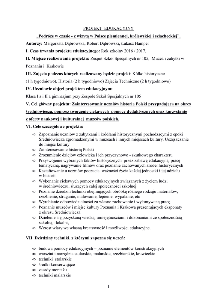 PROJEKT EDUKACYJNY „Podróże w czasie - z wizytą w Polsce plemiennej, królewskiej i szlacheckiej”. Autorzy: Małgorzata Dąbrowska, Robert Dąbrowski, Łukasz Hampel I. Czas trwania projektu edukacyjnego: Rok szkolny 2016 / 2017, II. Miejsce realizowania projektu: Zespół Szkół Specjalnych nr 105, Muzea i zabytki w Poznaniu i Krakowie III. Zajęcia podczas których realizowany będzie projekt: Kółko historyczne (1 h tygodniowo), Historia (2 h tygodniowo) Zajęcia Techniczne (2 h tygodniowo) IV. Uczniowie objęci projektem edukacyjnym: Klasa I a i II a gimnazjum przy Zespole Szkół Specjalnych nr 105 V. Cel główny projektu: Zainteresowanie uczniów historią Polski przypadającą na okres średniowiecza, poprzez tworzenie ciekawych pomocy dydaktycznych oraz korzystanie z oferty naukowej i kulturalnej muzeów polskich. VI. Cele szczegółowe projektu: • Zapoznanie uczniów z zabytkami i źródłami historycznymi pochodzącymi z epoki Średniowiecza zgromadzonymi w muzeach i innych miejscach kultury. Uczęszczanie do miejsc kultury • Zainteresowanie historią Polski • Zrozumienie dziejów człowieka i ich przyczynowo - skutkowego charakteru • Przyswojenie wybranych faktów historycznych przez zabawę edukacyjną, pracę tematyczną, nagrywanie filmów oraz poznanie zachowanych źródeł historycznych • Kształtowanie u uczniów poczucia ważności życia każdej jednostki i jej udziału w historii. • Wykonanie ciekawych pomocy edukacyjnych związanych z życiem ludzi w średniowieczu, służących całej społeczności szkolnej • Poznanie dziedzin techniki obejmujących obróbkę różnego rodzaju materiałów, rzeźbienie, struganie, malowanie, lepienie, wypalanie, etc • Wyrabianie odpowiedzialności za własne zachowanie i wykonywaną pracę. • Poznanie muzeów i miejsc kultury Poznania i Krakowa prezentujących eksponaty z okresu Średniowiecza • Dzielenie się pozyskaną wiedzą, umiejętnościami i dokonaniami ze społecznością szkolną i lokalną • Wzrost wiary we własną kreatywność i możliwości edukacyjne. VII. Dziedziny techniki, z którymi zapozna się uczeń: • • • • • • budowa pomocy edukacyjnych – poznanie elementów konstrukcyjnych warsztat i narzędzia stolarskie, malarskie, rzeźbiarskie, krawieckie techniki stolarskie środki konserwujące zasady montażu techniki malarskie 1 • • • • • elementy ceramiki elementy krawiectwa element zdobnictwa gotowanie, pieczenie zasady BHP i P-Poż, VIII. Merytoryczne uzasadnienie projektu: Główne założenie projektu „Podróże w czasie - z wizytą w Polsce plemiennej, królewskiej i szlacheckiej” to zainteresowanie uczniów historią Polski przypadającą na okres Średniowiecza. Ze względu na abstrakcyjność zagadnienia: odległy czas, a także specyficzną terminologię historyczną postanowiliśmy dostarczyć uczniom, jak najwięcej bodźców służących poznaniu, zrozumieniu i przeżyciu przedstawionego materiału nauczania. Dlatego postawiliśmy na naukę poprzez działanie i emocjonalne przeżycie. Stąd mnogość takich form zajęć, jak: wycieczki do muzeów, gromadzenie ciekawostek, własnoręczne wykonanie kopii artefaktów historycznych, szycie elementów strojów z epoki, układanie scenariuszy i odgrywanie scen historycznych, filmowanie scenek. Uczniowie będą poznawać epokę Średniowiecza tworząc razem z nami opowieści o Mieszku i jego wojach, królu Jagielle i krzyżackich mieczach, życiu w średniowiecznym zakonie, mieszkańcach średniowiecznego miasta i ich zajęciach oraz obyczajach panujących na szlacheckim dworze. Odegrane scenki zostaną uwiecznione na kamerze, a następnie wykorzystane do stworzenia multimedialnych filmików, będących pomocą dydaktyczną na lekcjach Historii, lekcjach wychowawczych, zajęciach kółka historycznego, uroczystościach szkolnych. W ten sposób powstanie ciekawa pomoc dydaktyczna do nauki kolejnych roczników uczniów. Nasz projekt realizowany jest w oparciu o kalendarium projektowe, opisujące realizowaną tematykę zajęć , ważne zagadnienia, metody i formy pracy, niezbędne materiały i narzędzia, planowane zadania i terminy ich realizacji. O przebiegu projektu informowana jest na bieżąco społeczność szkoły oraz rodzice uczniów. Dokonujemy tego poprzez wiadomości i dokumentację zdjęciową zamieszczoną na stronie szkoły, pokazy filmów oraz wykorzystanie na lekcjach Historii wykonanych pomocy dydaktycznych. Pracownia historyczna wzbogaci się o wykonane przez uczestników projektu: makiety, gliniane naczynia, bursztynowe intarsje, repliki insygniów królewskich, średniowieczne zeszyty z drewna i wosku, dokumenty pisane gęsim piórem i lakowane pieczęciami, uszyte stroje plemienne, mieszczańskie i szlacheckie. Aby poznać prawdziwe średniowieczne zabytki zwiedzimy zabytki i muzea Poznania: Katedrę poznańską, Rezerwat Archeologiczny,Interaktywne Centrum Historii Ostrowa Tumskiego, zamek Przemysła w Poznaniu. Planujemy także wycieczkę do Krakowa, gdzie obejrzymy zabytki i muzealne ekspozycje z czasów Średniowiecza: Wawel, Kościół Mariacki, Sukiennice, Barbakan, Drogę Królewską, bramy i baszty miejskie, Uniwersytet Jagielloński. Stosowane w projekcie metody, to metody aktywne, oparte na zaangażowaniu i działaniu uczniów: tworzymy mapy pojęciowe, organizujemy różnego typu warsztaty, kreujemy symulacje, nagrywamy filmy itp. Dzięki temu uczniowie nabywają szereg nowych doświadczeń, umiejętności i wiadomości z zakresu Historii, sztuki, techniki, teatru. Tak podawana Historia jest przygodą, wyzwaniem i nauką w którą angażują się o wiele bardziej. Świadomość tego, że tworzą dla swoich kolegów wiele pomocy dydaktycznych i są bohaterami kręconych filmików powoduje, że czują się potrzebni, bardziej świadomi, otwarci i zaangażowani. Zwieńczeniem projektu będzie: wystawa wykonanych pomocy edukacyjnych, pokaz zrealizowanych filmów o postaciach