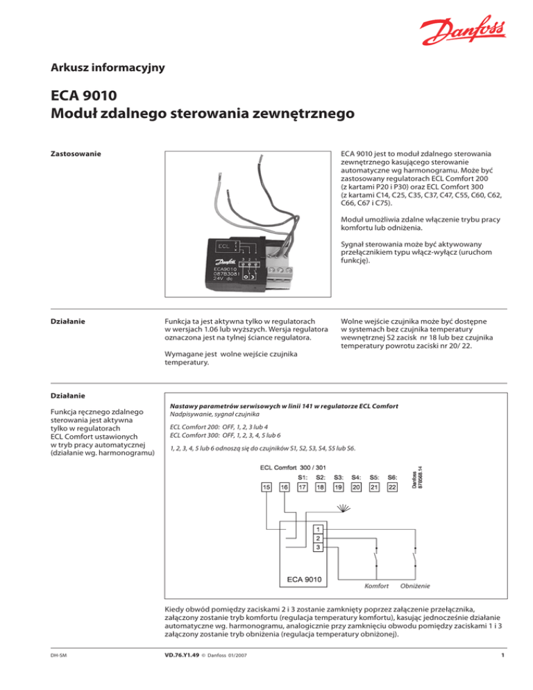 Arkusz informacyjny ECA 9010 Moduł zdalnego sterowania zewnętrznego Zastosowanie ECA 9010 jest to moduł zdalnego sterowania zewnętrznego kasującego sterowanie automatyczne wg harmonogramu. Może być zastosowany regulatorach ECL Comfort 200 (z kartami P20 i P30) oraz ECL Comfort 300 (z kartami C14, C25, C35, C37, C47, C55, C60, C62, C66, C67 i C75). Moduł umożliwia zdalne włączenie trybu pracy komfortu lub odniżenia. Sygnał sterowania może być aktywowany przełącznikiem typu włącz-wyłącz (uruchom funkcję). Działanie Funkcja ta jest aktywna tylko w regulatorach w wersjach 1.06 lub wyższych. Wersja regulatora oznaczona jest na tylnej ściance regulatora. Wymagane jest wolne wejście czujnika temperatury. Wolne wejście czujnika może być dostępne w systemach bez czujnika temperatury wewnętrznej S2 zacisk nr 18 lub bez czujnika temperatury powrotu zaciski nr 20/ 22. Działanie Funkcja ręcznego zdalnego sterowania jest aktywna tylko w regulatorach ECL Comfort ustawionych w tryb pracy automatycznej (działanie wg. harmonogramu) Nastawy parametrów serwisowych w linii 141 w regulatorze ECL Comfort Nadpisywanie, sygnał czujnika ECL Comfort 200: OFF, 1, 2, 3 lub 4 ECL Comfort 300: OFF, 1, 2, 3, 4, 5 lub 6 1, 2, 3, 4, 5 lub 6 odnoszą się do czujników S1, S2, S3, S4, S5 lub S6. Komfort Obniżenie Kiedy obwód pomiędzy zaciskami 2 i 3 zostanie zamknięty poprzez załączenie przełącznika, załączony zostanie tryb komfortu (regulacja temperatury komfortu), kasując jednocześnie działanie automatyczne wg. harmonogramu, analogicznie przy zamknięciu obwodu pomiędzy zaciskami 1 i 3 załączony zostanie tryb obniżenia (regulacja temperatury obniżonej). DH-SM VD.76.Y1.49 © Danfoss 01/2007 1 Arkusz informacyjny Nr katalogowy i wymiary ECA 9010 moduł zdalnego sterowania zewnętrznego Typ Opis Wymiary Nr kat. ECA 9010 Moduł zdalnego ręcznego sterowania L x W x H (mm) 50 x 35 x 18 087B3081 Montaż Podłączenia elektryczne Max. długość kabla pomiędzy przełącznikiem a modułem wynosi 100 m. Zdalny przełącznik sterowania ręcznego Max. 100 m Danfoss nie ponosi odpowiedzialności za możliwe błędy drukarskie w katalogach, broszurach i innych materiałach drukowanych. Dane techniczne zawarte w broszurze mogą ulec zmianie bez wcześniejszego uprzedzenia, jako efekt stałych ulepszeń i modyfikacji naszych urządzeń. Wszystkie znaki towarowe w tym materiale są własnością odpowiednich spółek. Nazwa Danfoss, logotyp Danfoss są znakami towarowymi Danfoss A/S. Wszelkie prawa zastrzeżone Danfoss LPM Sp. z o.o. Tuchom 147 80-209 Chwaszczyno tel. (48 58) 512 91 00 fax: (48 58) 512 91 05 e-mail: [email protected] http://www.danfoss.pl 2 VD.76.Y1.49 © Danfoss 01/2007 DH-SM