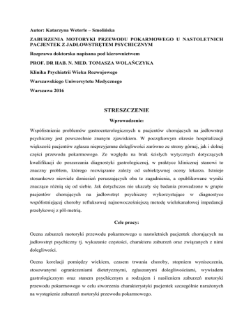 Autor: Katarzyna Weterle – Smolińska ZABURZENIA MOTORYKI PRZEWODU POKARMOWEGO U NASTOLETNICH PACJENTEK Z JADŁOWSTRĘTEM PSYCHICZNYM Rozprawa doktorska napisana pod kierownictwem PROF. DR HAB. N. MED. TOMASZA WOLAŃCZYKA Klinika Psychiatrii Wieku Rozwojowego Warszawskiego Uniwersytetu Medycznego Warszawa 2016 STRESZCZENIE Wprowadzenie: Współistnienie problemów gastroenterologicznych u pacjentów chorujących na jadłowstręt psychiczny jest powszechnie znanym zjawiskiem. W początkowym okresie hospitalizacji większość pacjentów zgłasza nieprzyjemne dolegliwości zarówno ze strony górnej, jak i dolnej części przewodu pokarmowego. Ze względu na brak ścisłych wytycznych dotyczących kwalifikacji do poszerzania diagnostyki gastrologicznej, w praktyce klinicznej stanowi to znaczny problem, którego rozwiązanie zależy od subiektywnej oceny lekarza. Istnieje stosunkowo niewiele doniesień poruszających oba te zagadnienia, a opublikowane wyniki znacząco różnią się od siebie. Jak dotychczas nie ukazały się badania prowadzone w grupie pacjentów chorujących na jadłowstręt psychiczny wykorzystujące w diagnostyce współistniejącej choroby refluksowej najnowocześniejszą metodę wielokanałowej impedancji przełykowej z pH-metrią. Cele pracy: Ocena zaburzeń motoryki przewodu pokarmowego u nastoletnich pacjentek chorujących na jadłowstręt psychiczny tj. wykazanie częstości, charakteru zaburzeń oraz związanych z nimi dolegliwości. Ocena korelacji pomiędzy wiekiem, czasem trwania choroby, stopniem wyniszczenia, stosowanymi ograniczeniami dietetycznymi, zgłaszanymi dolegliwościami, wywiadem gastrologicznym oraz stanem psychicznym a rodzajem i nasileniem zaburzeń motoryki przewodu pokarmowego w celu stworzenia charakterystyki pacjentek szczególnie narażonych na wystąpienie zaburzeń motoryki przewodu pokarmowego. Ocena przydatności wielokanałowej impedancji przełykowej z pH-metrią, jako metody diagnostycznej choroby refluksowej na podstawie analizy poszczególnych epizodów refluksu i związanych z nimi dolegliwości. Materiał i metody: Badaniem objęto dziewczęta w wieku 12-18 lat chorujące na jadłowstręt psychiczny będące pacjentkami Oddziału Psychiatrii Dziecięcej. Projekt realizowano w początkowym okresie rehabilitacji żywieniowej. W pierwszym etapie badania użyto kwestionariusz uwzględniający wiek, niedobór masy ciała, czas chorowania, występujące dolegliwości, stosowaną w czasie choroby dietę, obciążenia gastrologiczne oraz aktualny stan psychiczny. Następnie przeprowadzono wysokiej rozdzielczości manometrię przełyku oraz wielokanałową impedancję przełykową z pH-metrią. Ostatni etap badania stanowiła ocena czasu pasażu jelitowego metodą radiologiczną. Wyniki: Do badania zakwalifikowano 24 dziewczęta, u których przeprowadzono badanie manometryczne. Ze względu na wycofanie zgody na udział w dalszych badaniach pHimpedancję zrealizowano u 23 pacjentek, natomiast czas pasażu jelitowego u 16 chorujących. Średnie BMI przy przyjęciu wynosiło 14 kg/m2, a średni wiek pacjentek zakwalifikowanych do badania 15,4 lat. Dolegliwości ze strony przewodu pokarmowego zgłaszało 87,5% badanych. Najczęściej zgłaszanymi objawami była pełność poposiłkowa (19/24), wzdęcia (17/24) oraz ból w nadbrzuszu (16/24). Rozpoznanie zaburzeń motoryki przełyku diagnozowane badaniem manometrycznym postawiono u 25% badanych, natomiast refluks żołądkowo – przełykowy rozpoznano u 26,1% pacjentek. 63,3% uwidocznionych refluksów stanowiły refluksy niekwaśne, z czego 83,3 to epizody słabo kwaśne, a 16,7% słabo zasadowe. Normy dotyczące refluksów kwaśnych nie zostały przekroczone w żadnym przypadku. Nieprawidłowy czas pasażu jelitowego zdiagnozowano u 50% badanych, z czego u 62,5% był on wydłużony, a u 37,5% przyspieszony. Nie znaleziono korelacji pomiędzy czasem trwania choroby, obciążeniami gastrologicznymi w przeszłości oraz wiekiem badanych a motoryką górnej części przewodu pokarmowego. Wykazano dodatnie korelacje jedynie pomiędzy dwoma parametrami mierzonymi w badaniu manometrycznym (DCI, duże przerwy w ciągłości fali perystaltycznej), a stopniem niedoboru masy ciała. Odkryto szereg ujemnych korelacji pomiędzy dolegliwościami ze strony górnej części przewodu pokarmowego a ciśnieniem w obrębie LES/UES. Dodatnie korelacje wykazano jedynie pomiędzy obecnością bólu w klatce piersiowej i nadbrzuszu a zaburzeniami motoryki przełyku w badaniu manometrycznym (p=0,005, p=0,048). Nie znaleziono korelacji pomiędzy objawami ze strony dolnej części przewodu pokarmowego a czasem pasażu jelitowego. Wykazano natomiast istotną statystycznie ujemną korelację pomiędzy częstotliwością wypróżnień oraz dodatnią pomiędzy wiekiem pacjentki a czasem pasażu jelitowego (p=0,005, p=0,034). Wykazano szereg korelacji pomiędzy stosowaną w czasie choroby dietą oraz działaniami mającymi na celu redukcję masy ciała a motoryką zarówno górnego, jak i dolnego odcinka przewodu pokarmowego. Dodatnie korelacje wykazano pomiędzy wskaźnikiem IRP w manometrii przełyku a oceną nastroju, snu, koncentracji. Ujemne natomiast pomiędzy apetytem a występowaniem nudności i pełności poposiłkowej oraz nieprawidłowościami w zakresie fali perystaltycznej. Dodatnie korelacje wykazano pomiędzy stosowaniem leków p/depresyjnych a występowaniem nudności (p=0,044). Wnioski: Zaburzenia motoryki przełyku są częstym problemem u pacjentek chorujących na jadłowstręt psychiczny wynikającym z osłabionej mięśniówki przewodu pokarmowego i w konsekwencji nieefektywnej pracy; znaczenie kliniczne zjawiska nie jest jednak duże. Refluks żołądkowoprzełykowy wymagający stosowania farmakoterapii dotyczy 26% pacjentek, a w diagnostyce problemu powinno używać się badania pH-impedacyjnego. Objawy sugerujące chorobę refluksową nie są jej właściwym wskaźnikiem. Nieprawidłowy czas pasa