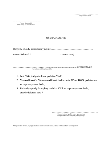 ………………………. miejscowość i data ……………………………………… Pieczęć firmowa lub Dane osoby na oświadczeniu OŚWIADCZENIE Dotyczy szkody komunikacyjnej nr…………………………………………. samochód marki…………………………… o numerze rej. ……………….. …………………………………............................................. oświadcza, że: Nazwa firmy lub Imię i nazwisko 1. Jest / Nie jest płatnikiem podatku VAT, 2. Ma możliwość / Nie ma możliwości odliczania 50% / 100% podatku vat za naprawę samochodu, 3. Zobowiązuje się do wpłaty podatku VAT za naprawę samochodu, przed odbiorem auta * …………………………………………….. Pieczęć imienna i podpis osoby upoważnionej do reprezentowania firmy lub gł. księgowego * Niepotrzebne skreślić, w przypadku braku możliwości odliczania podatku VAT skreślić w całości punkt 3
