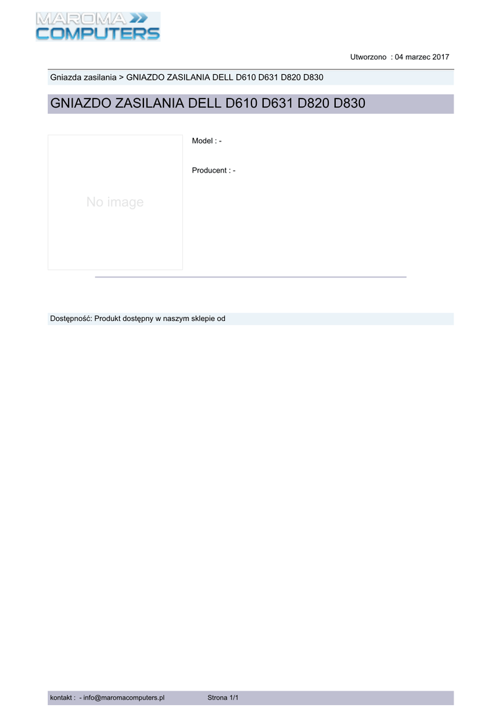 Utworzono : 04 marzec 2017 Gniazda zasilania > GNIAZDO ZASILANIA DELL D610 D631 D820 D830 GNIAZDO ZASILANIA DELL D610 D631 D820 D830 Model : - s r te Producent : - No image C a Dostępność: Produkt dostępny w naszym sklepie od m ro a M kontakt : - [email protected] Strona 1/1 m o u p