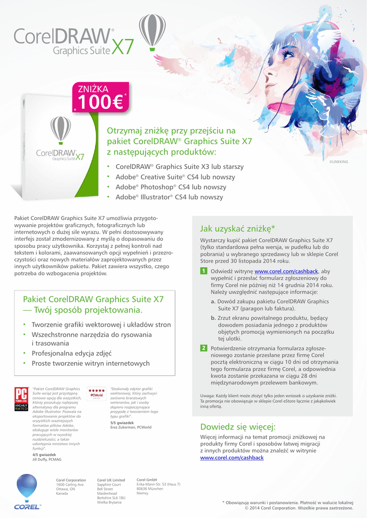 ZNIŻKA 100€ * Otrzymaj zniżkę przy przejściu na pakiet CorelDRAW® Graphics Suite X7 z następujących produktów: CorelDRAW® Graphics Suite X3 lub starszy Ÿ Adobe® Creative Suite® CS4 lub nowszy Ÿ Adobe® Photoshop® CS4 lub nowszy Ÿ Adobe® Illustrator® CS4 lub nowszy Ÿ Pakiet CorelDRAW Graphics Suite X7 umożliwia przygotowywanie projektów graficznych, fotograficznych lub internetowych o dużej sile wyrazu. W pełni dostosowywany interfejs został zmodernizowany z myślą o dopasowaniu do sposobu pracy użytkownika. Korzystaj z pełnej kontroli nad tekstem i kolorami, zaawansowanych opcji wypełnień i przezroczystości oraz nowych materiałów zaprojektowanych przez innych użytkowników pakietu. Pakiet zawiera wszystko, czego potrzeba do wzbogacenia projektów. Pakiet CorelDRAW Graphics Suite X7 — Twój sposób projektowania. Tworzenie grafiki wektorowej i układów stron Ÿ Wszechstronne narzędzia do rysowania i trasowania Ÿ Profesjonalna edycja zdjęć Ÿ Proste tworzenie witryn internetowych Ÿ "Pakiet CorelDRAW Graphics Suite wciąż jest przystępną cenowo opcją dla wszystkich, którzy poszukują najlepszej alternatywy dla programu Adobe Illustrator. Pozwala na eksportowanie projektów do wszystkich ważniejszych formatów plików Adobe, obsługuje wiele monitorów pracujących w wysokiej rozdzielczości, a także udostępnia mnóstwo innych funkcji". "Doskonały edytor grafiki wektorowej, który zachwyci zarówno branżowych weteranów, jak i osoby dopiero rozpoczynające przygodę z tworzeniem tego typu grafiki". 5/5 gwiazdek Erez Zukerman, PCWorld Jak uzyskać zniżkę* Wystarczy kupić pakiet CorelDRAW Graphics Suite X7 (tylko standardowa pełna wersja, w pudełku lub do pobrania) u wybranego sprzedawcy lub w sklepie Corel Store przed 30 listopada 2014 roku. 1 Odwiedź witrynę www.corel.com/cashback, aby wypełnić i przesłać formularz zgłoszeniowy do firmy Corel nie później niż 14 grudnia 2014 roku. Należy uwzględnić następujące informacje: a. Dowód zakupu pakietu CorelDRAW Graphics Suite X7 (paragon lub faktura). b. Zrzut ekranu powitalnego produktu, będący dowodem posiadania jednego z produktów objętych promocją wymienionych na początku tej ulotki. 2 Potwierdzenie otrzymania formularza zgłoszeniowego zostanie przesłane przez firmę Corel pocztą elektroniczną w ciągu 10 dni od otrzymania tego formularza przez firmę Corel, a odpowiednia kwota zostanie przekazana w ciągu 28 dni międzynarodowym przelewem bankowym. Uwaga: Każdy klient może złożyć tylko jeden wniosek o uzyskanie zniżki. Ta promocja nie obowiązuje w sklepie Corel eStore łącznie z jakąkolwiek inną ofertą. Dowiedz się więcej: Więcej informacji na temat promocji zniżkowej na produkty firmy Corel i sposobów łatwej migracji z innych produktów można znaleźć w witrynie www.corel.com/cashback 4/5 gwiazdek Jill Duffy, PCMAG Corel Corporation 1600 Carling Ave. Ottawa, ON Kanada ©LINEKING Corel UK Limited Sapphire Court Bell Street Maidenhead Berkshire SL6 1BU Wielka Brytania Corel GmbH Erika-Mann-Str. 53 (Haus 7) 80636 München Niemcy * Obowiązują warunki i postanowienia. Płatność w walucie lokalnej © 2014 Corel Corporation. Wszelkie prawa zastrzeżone. Warunki i postanowienia – zniżka promocyjna 2014 1. Niniejsza Oferta promocyjna (sprecyzowana poniżej w punkcie 2) jest dostępna wyłącznie dla mieszkańców Arabii Saudyjskiej, Australii, Austrii, Belgii, Czech, Francji, Hiszpanii, Holandii, Kanady, Luksemburga, Meksyku, Niemiec, Nowej Zelandii, Polski, Portugalii, RPA, Szwajcarii, Szwecji, Turcji, USA, Wielkiej Brytanii i Włoch. Z Oferty tej nie mogą skorzystać dystrybutorzy, sprzedawcy detaliczni i inne firmy sprzedające oprogramowanie lub usługi firmy Corel, pracownicy firmy Corel UK Limited, członkowie ich rodzin, podmioty zależne i stowarzyszone z firmą Corel („Corel”), przedstawiciele firmy Corel oraz żadne osoby związane z prowadzeniem niniejszej promocji. Oferta promocyjna nie obowiązuje w sytuacji, gdy zabraniają tego przepisy, prawo lub postanowienia. 2. Uprawnieni klienci mogą otrzymać zniżkę tylko w przypadku zakupu pakietu CorelDRAW Graphics Suite X7 w pełnej wersji w pudełku lub do pobrania („Oferta”). Zakupu należy dokonać w okresie od 4 sierpnia 2014 r. do 30 listopada 2014 r. („Okres promocyjny”). Akceptowany będzie tylko jeden (1) formularz zgłoszeniowy na osobę za zakup jednego produktu. Każda osoba może otrzymać tylko jedną (1) zniżkę. Formularz zgłoszeniowy można pobrać w witrynie www.corel.com/cashback. Dostępne są tam także informacje na temat kwot zniżek. Zgłoszenia muszą dotrzeć do firmy Corel nie później niż o północy (GMT) 14 grudnia 2014 r. („Termin nadsyłania zgłoszeń”). 3. Ponadto uprawnieni klienci muszą być w posiadaniu co najmniej jednego z poniższych produktów: CorelDRAW Graphics Suite w wersji X3 lub poprzedniej (pełna wersja w pudełku lub do pobrania) LUB Adobe Creative Suite w wersji CS4 albo nowszej, Adobe Photoshop w wersji CS4 albo nowszej (jako osobny produkt) lub Adobe Illustrator w wersji CS4 lub nowszej (jako osobny produkt, pełna wersja w pudełku lub do pobrania, albo tylko licencja komercyjna). 4. Niniejsza oferta jest ważna tylko w odniesieniu do pełnych wersji pakietu CorelDRAW® Graphics Suite X7 (w pudełku lub do pobrania) z następującymi kodami produktów: CDGSX7CZPLDB, CDGSX7DEDB, CDGSX7ENDB, CDGSX7FRNLDB, CDGSX7IEDB, CDGSX7ESBPDBAM, CDGSX7ESBPDBEU, ESDCDGSX7DE, ESDCDGSX7ANSEAC, ESDCDGSX7BP, ESDCDGSX7IE, ESDCDGSX7CZPL, ESDCDGSX7EMEA, ESDCDGSX7EN („Oprogramowanie objęte promocją”). Niniejsza Oferta nie dotyczy zakupu pakietów CorelDRAW Graphics Suite w wersji Home and Student, zakupu wersji edukacyjnych, uaktualnień, licencji komercyjnych, subskrypcji, wersji próbnych, OEM oraz nie do odsprzedaży (NFR). 5. Zniżka zostanie udzielona wyłącznie na podstawie prawidłowo wypełnionego formularza zgłoszenia