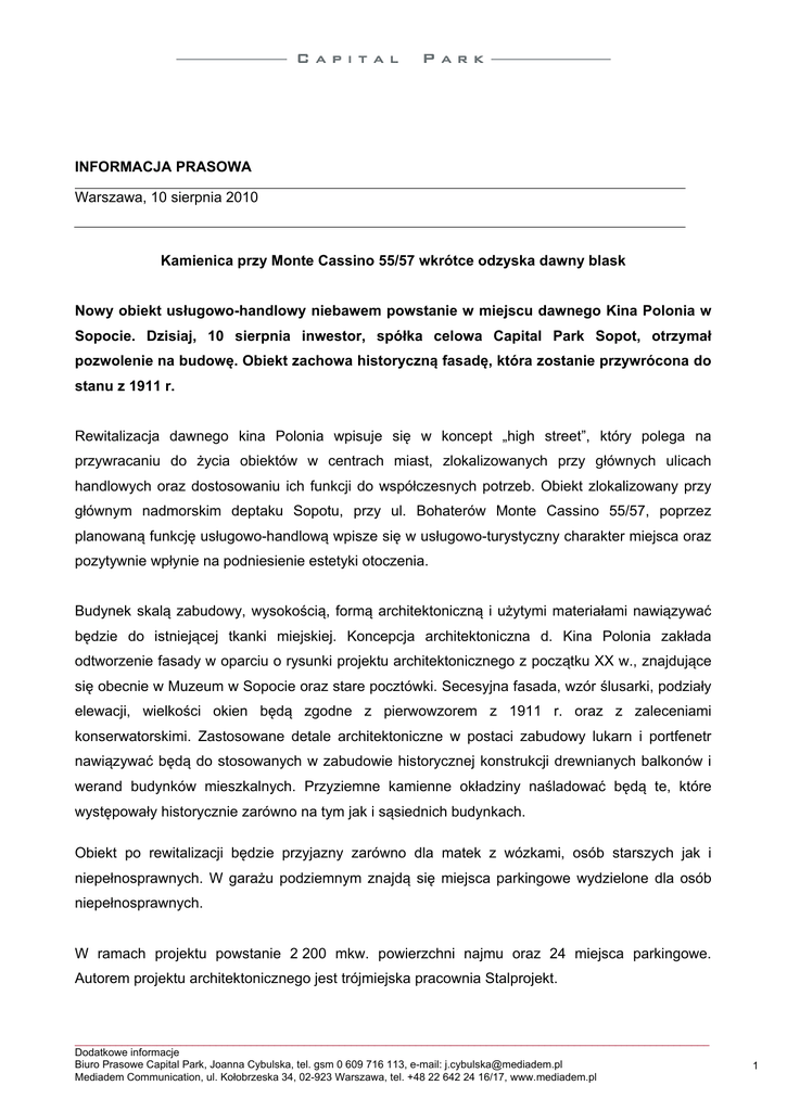 INFORMACJA PRASOWA Warszawa, 10 sierpnia 2010 Kamienica przy Monte Cassino 55/57 wkrótce odzyska dawny blask Nowy obiekt usługowo-handlowy niebawem powstanie w miejscu dawnego Kina Polonia w Sopocie. Dzisiaj, 10 sierpnia inwestor, spółka celowa Capital Park Sopot, otrzymał pozwolenie na budowę. Obiekt zachowa historyczną fasadę, która zostanie przywrócona do stanu z 1911 r. Rewitalizacja dawnego kina Polonia wpisuje się w koncept „high street”, który polega na przywracaniu do życia obiektów w centrach miast, zlokalizowanych przy głównych ulicach handlowych oraz dostosowaniu ich funkcji do współczesnych potrzeb. Obiekt zlokalizowany przy głównym nadmorskim deptaku Sopotu, przy ul. Bohaterów Monte Cassino 55/57, poprzez planowaną funkcję usługowo-handlową wpisze się w usługowo-turystyczny charakter miejsca oraz pozytywnie wpłynie na podniesienie estetyki otoczenia. Budynek skalą zabudowy, wysokością, formą architektoniczną i użytymi materiałami nawiązywać będzie do istniejącej tkanki miejskiej. Koncepcja architektoniczna d. Kina Polonia zakłada odtworzenie fasady w oparciu o rysunki projektu architektonicznego z początku XX w., znajdujące się obecnie w Muzeum w Sopocie oraz stare pocztówki. Secesyjna fasada, wzór ślusarki, podziały elewacji, wielkości okien będą zgodne z pierwowzorem z 1911 r. oraz z zaleceniami konserwatorskimi. Zastosowane detale architektoniczne w postaci zabudowy lukarn i portfenetr nawiązywać będą do stosowanych w zabudowie historycznej konstrukcji drewnianych balkonów i werand budynków mieszkalnych. Przyziemne kamienne okładziny naśladować będą te, które występowały historycznie zarówno na tym jak i sąsiednich budynkach. Obiekt po rewitalizacji będzie przyjazny zarówno dla matek z wózkami, osób starszych jak i niepełnosprawnych. W garażu podziemnym znajdą się miejsca parkingowe wydzielone dla osób niepełnosprawnych. W ramach projektu powstanie 2 200 mkw. powierzchni najmu oraz 24 miejsca parkingowe. Autorem projektu architektonicznego jest trójmiejska pracownia Stalprojekt. ____________________________________________________________________________________________________________ Dodatkowe informacje Biuro Prasowe Capital Park, Joanna Cybulska, tel. gsm 0 609 716 113, e-mail: [email protected] Mediadem Communication, ul. Kołobrzeska 34, 02-923 Warszawa, tel. +48 22 642 24 16/17, www.mediadem.pl 1 Dodatkowe informacje: O inwestorze Grupa Capital Park aktywnie działa na polskim rynku nieruchomości od 2003 roku. Od 2004 inwestuje wspólnie z międzynarodowym funduszem private equity Patron Capital Partners dysponującym kapitałem w kwocie ponad 1,7 mld EUR. W ramach funduszy CP Realty I i CP Realty II Grupa Capital Park i Patron Capital Partners powiększyły portfolio o nieruchomości w centrach miast północnej Polski, zakup budynków biurowych Eurocentrum i terenów inwestycyjnych w Wilanowie i inne. Wzrost rynku, którego impulsem stało się wejście Polski do Unii Europejskiej, przekładał się na decyzje biznesowe Grupy i definiowanie celów działania. Dziś na portfel inwestycyjny Grupy Capital Park składa się na ponad 353 000 mkw. powierzchni biurowej, handlowej, mieszkaniowej w budynkach istniejących i przeznaczonych do realizacji. W trakcie swojej dotychczasowej działalności Grupa Capital Park przeprowadziła proces inwestycyjny i skutecznie sprzedała 22 nieruchomości komercyjne i mieszkaniowe. Grupa od początku zarządzana jest przez doświadczonych inwestorów rynkowych. Posiadają oni ponad piętnastoletnie doświadczenie w inwestycjach na lokalnym i międzynarodowym rynku nieruchomości, ciesząc się szacunkiem i zaufaniem partnerów biznesowych. ____________________________________________________________________________________________________________ Dodatkowe informacje Biuro Prasowe Capital Park, Joanna Cybulska, tel. gsm 0 609 716 113, e-mail: [email protected] Mediadem Communication, ul. Kołobrzeska 34, 02-923 Warszawa, tel. +48 22 642 24 16/17, www.mediadem.pl 2