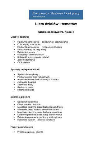 Lista działów i tematów Szkoła podstawowa. Klasa 4 Liczby i działania • • • • • • • • • Rachunki pamięciowe – dodawanie i odejmowanie O ile więcej, o ile mniej Rachunki pamięciowe – mnożenie i dzielenie Ile razy więcej, ile razy mniej Dzielenie z resztą Kwadraty i sześciany liczb Kolejność wykonywania działań Zadania tekstowe Oś liczbowa Systemy zapisywania liczb • • • • • • • System dziesiątkowy Porównywanie liczb naturalnych Rachunki pamięciowe na dużych liczbach Jednostki długości Jednostki masy System rzymski Kalendarz i czas Działania pisemne • • • • • • • • Dodawanie pisemne Odejmowanie pisemne Mnożenie pisemne przez liczby jednocyfrowe Mnożenie przez liczby z zerami na końcu Mnożenie pisemne przez liczby wielocyfrowe Dzielenie pisemne przez liczby jednocyfrowe Dzielenie pisemne przez liczby wielocyfrowe Kolejność działań – zadania tekstowe Figury geometryczne • Proste, półproste, odcinki • • • • • • • • • • Wzajemne położenie prostych i odcinków Mierzenie długości Kąty Mierzenie kątów Wielokąty Prostokąty i kwadraty Obwody prostokątów i kwadratów Koła i okręgi Co to jest skala? Skala na planach i mapach Ułamki zwykłe • • • • • • • • Ułamki i liczby mieszane Ułamki i liczby mieszane na osi liczbowej Porównywanie ułamków Rozszerzanie i skracanie ułamków Ułamki niewłaściwe Ułamek jako wynik dzielenia Dodawanie ułamków zwykłych Odejmowanie ułamków zwykłych Ułamki dziesiętne • • • • • Ułamki o mianownikach 10, 100, 1000, ... Zapisywanie wyrażeń dwumianowanych Porównywanie ułamków dziesiętnych Dodawanie ułamków dziesiętnych Odejmowanie ułamków dziesiętnych Pola figur • • Co to jest pole figury? Jednostki pola. Pole prostokąta Prostopadłościany i sześciany • • • Opis prostopadłościanu Siatki prostopadłościanów Pole powierzchni prostopadłościanu Szkoła podstawowa. Klasa 5 Liczby i działania • • • • • • • Zapisywanie i porównywanie liczb Rachunki pamięciowe Szacowanie wyników działań Działania pisemne – dodawanie i odejmowanie Działania pisemne – mnożenie i dzielenie Kolejność działań Zadania tekstowe Własności liczb naturalnych • • • • • Wielokrotności Dzielniki Cechy podzielności przez 2, 5, 10, 100 oraz przez 3 i 9 Liczby pierwsze i liczby złożone Rozkład liczby na czynniki pierwsze Ułamki zwykłe • • • • • • • • • • • Ułamki zwykłe i liczby mieszane Ułamek jako iloraz Skracanie i rozszerzanie ułamków Porównywanie ułamków Dodawanie i odejmowanie ułamków o jednakowych mianownikach Dodawanie i odejmowanie ułamków o różnych mianownikach Mnożenie ułamków przez liczby naturalne Obliczanie ułamka danej liczby Mnożenie ułamków Dzielenie ułamków przez liczby naturalne Dzielenie ułamków Figury na płaszczyźnie • • • • • • • • • Proste prostopadłe i proste równoległe Kąty Mierzenie kątów Kąty przyległe, wierzchołkowe. Kąty utworzone przez trzy proste Wielokąty Rodzaje trójkątów Konstruowanie trójkąta o danych bokach Miary kątów w trójkątach Prostokąty i kwadraty • • • • • Równoległoboki i romby Miary kątów w równoległobokach Trapezy Miary kątów w trapezach Czworokąty – podsumowanie Ułamki dziesiętne • • • • • • • • • • • • • Zapisywanie ułamków dziesiętnych Porównywanie ułamków dziesiętnych Różne sposoby zapisywania długości i masy Dodawanie i odejmowanie ułamków dziesiętnych Mnożenie ułamków dziesiętnych przez 10, 100, 1000 … Dzielenie ułamków dziesiętnych przez 10, 100, 1000 … Mnożenie ułamków dziesiętnych przez liczby naturalne Mnożenie ułamków dziesiętnych Dzielenie ułamków dziesiętnych przez liczby naturalne Dzielenie ułamków dziesiętnych Szacowanie wyników działań na ułamkach dziesiętnych Działania na ułamkach zwykłych i dziesiętnych Procenty a ułamki Pola figur • • • • • • • Pole prostokąta i kwadratu Zależności między jednostkami pola Pole równoległoboku Pole rombu Pole trójkąta Pole trapezu Pola wielokątów – podsumowanie Liczby całkowite • • • • Liczby ujemne Dodawanie liczb całkowitych Odejmowanie liczb całkowitych Mnożenie i dzielenie liczb całkowitych Graniastosłupy • • • • • Prostopadłościany i sześciany Przykłady graniastosłupów prostych Siatki graniastosłupów prostych Pole powierzchni graniastosłupa prostego Objętość figury. Jednostki objętości • • • Litry i mililitry Objętość prostopadłościanu Objętość graniastosłupa prostego Szkoła podstawowa. Klasa 6 Liczby naturalne i ułamki • • • • • • Rachunki pamięciowe na liczbach naturalnych i ułamkach dziesiętnych Działania pisemne na ułamkach dziesiętnych Potęgowanie liczb Działania na ułamkach zwykłych Ułamki zwykłe i dziesiętne Rozwinięcia dziesiętne ułamków zwykłych Figury na płaszczyźnie • • • • • Proste, odcinki, okręgi, koła Trójkąty, czworokąty i inne wielokąty Kąty Kąty w trójkątach i czworokątach Konstruowanie trójkątów o danych bokach Liczby na co dzień • • • • • • Kalendarz i czas Jednostki długości i jednostki masy Skala na planach i mapach Zaokrąglanie liczb Odczytywanie informacji z tabel i diagramów Odczytywanie danych przedstawionych na wykresach Prędkość, droga, czas • • • Droga Prędkość Czas Pola wielokątów • • Pole prostokąta Pole równoległoboku i rombu • • Pole trójkąta Pole trapezu Procenty • • • • • Procenty i ułamki Jaki to procent? Diagramy procentowe Obliczenia procentowe Obniżki i podwyżki Liczby dodatnie i liczby ujemne • • • Liczby dodatnie i liczby ujemne Dodawanie i odejmowanie Mnożenie i dzielenie Wyrażenia algebraiczne i równania • • • • • • • Zapisywanie wyra