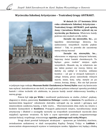 Zespół Szkół Zawodowych im .Kard. Stefana Wyszyńskiego w Dynowie Wycieczka Szkolnej Artystyczno – Teatralnej Grupy ANTRAKT. W dniach 26 -27 kwietnia 2016 roku członkowie Szkolnej Artystyczno – Teatralnej Grupy ANTRAKT, pod opieką Anny i Jarosława Molów wybrali się na wycieczkę po Roztoczu. Właściwie każdy podczas niej znalazł coś dla siebie. Zaczęło się niezwykle, bo… po tygodniu nieustannego deszczu, ku zaskoczeniu wszystkich wyszło piękne słońce! – Tak, to prawda ale zaczniemy naszą relację inaczej! Zaczęło się niezwykle, bo… wkroczono w migocący różnymi kolorami, bajeczny świat baniek choinkowych. To będące „poza realem” miejsce ujęło wszystkich. Okazało się, że właściwie nie ma takiej postaci czy rzeczy, której nie dałoby się zakląć w kruchej, szklanej bombce – od par w strojach ludowych z całego świata, przez samochody różnych marek, misie, koty, ryby, motyle aż po owoce, kwiaty, domy… Kto nie był jeszcze w jedynym tego rodzaju Muzeum Bańki Choinkowej w Nowej Dębie musi się koniecznie tam wybrać. Antraktowicze nie dość, że mogli podczas pokazu zobaczyć sposoby produkcji baniek i różne techniki ich zdobienia, to jeszcze każdy został obdarowany bombką z nazwą grupy. Potem był rejs po Wiśle i możliwość podziwiania ze statku „Celina”, pięknej, skąpanej w słońcu, panoramy Kazimierza Dolnego i zamku w Janowcu. Po spotkaniu „z kazimierskim kogutem” członkowie Antraktu wdrapali się na zamek i górującą nad miasteczkiem zamkową basztę, a było warto… Ukoronowaniem dnia stała się wizyta u hrabiów Zamoyskich w Kozłówce. Przepych pałacowych wnętrz, wyrafinowany smak artystyczny i dbałość o szczegóły wywarły na wszystkich uczestnikach wycieczki (bez wyjątku!) ogromne wrażenie. Oj było o czym opowiadać podczas zorganizowanego zamiast kolacji, wspólnego, wieczornego ogniska, palonego nad rzeką Wieprz. Drugi dzień powitał kolejnymi atrakcjami – spacerem po lubelskiej starówce, zwiedzaniem unikatowej w skali europejskiej Kaplicy Świętej Trójcy w Lublinie i nowocześnie eksponowanych wystaw w tamtejszym zamku. Oglądano też, będący chlubą Zespół Szkół Zawodowych im .Kard. Stefana Wyszyńskiego w Dynowie miasta, ogromny obraz Jana Matejki pt. „Unia lubelska”. Kolejnym punktem programu wycieczki był piękny jak zawsze Zamość. Kiedy antraktowicze zachwycili się już urokiem zamojskiego rynku, kamieniczek i ratusza udali się do kina, w którym dzięki nowoczesnym technikom multimedialnym i pokazom 3D poznali historię miasta. Chłopców zainteresowały szczególnie militaria, eksponowane w zamojskim Arsenale. Ostatnim punktem wycieczki był spacer po ZOO. Trzeba przyznać, że odnowiony, czy „zrewitalizowany” lub jak wolą niektórzy, „będący po liftingu” ogród zoologiczny w Zamościu otrzymał jakby drugie życie. To piękne miejsce, gdzie na niewielkim stosunkowo terenie prezentowane są różne gatunki ciekawych zwierząt. Powstały nowoczesne terraria, akwaria i motylarnia. Szczególnie pięknie prezentowały się niedźwiedzie brunatne, żyrafy i małżeństwo lwów, choć w tym względzie zdania były bardzo podzielone… Jeszcze tylko gromkie (!), chóralne śpiewy, spojrzenie na szczebrzeszyńskiego świerszcza i niepostrzeżenie dla wszystkich wycieczka dobiegła końca. ZA SZYBKO!!! – tu nikt nie miał wątpliwości. Potem był rejs po Wiśle i możliwość podziwiania ze statku „Celina”, pięknej, skąpanej w słońcu, panoramy Kazimierza Dolnego i zamku w Janowcu. Po spotkaniu „z kazimierskim kogutem” członkowie Antraktu wdrapali się na zamek i górującą nad miasteczkiem zamkową basztę, a było warto… Ukoronowaniem dnia stała się wizyta u hrabiów Zamoyskich w Kozłówce. Przepych pałacowych wnętrz, wyrafinowany smak artystyczny i dbałość o szczegóły wywarły na wszystkich uczestnikach wycieczki (bez wyjątku!) ogromne wrażenie. Oj było o czym opowiadać podczas zorganizowanego zamiast kolacji, wspólnego, wieczornego ogniska, palonego nad rzeką Wieprz. Drugi dzień powitał kolejnymi atrakcjami – spacerem po lubelskiej starówce, zwiedzaniem unikatowej w skali europejskiej Kaplicy Świętej Trójcy w Lublinie i nowocześnie eksponowanych wystaw w tamtejszym zamku. Oglądano też, będący chlubą miasta, ogromny obraz Jana Matejki pt. „Unia lubelska”. Kolejnym punktem programu wycieczki był piękny jak zawsze Zamość. Kiedy antraktowicze zachwycili się już urokiem zamojskiego rynku, kamieniczek i ratusza udali się do kina, w którym dzięki nowoczesnym technikom multimedialnym i pokazom 3D poznali historię miasta. Chłopców zainteresowały szczególnie militaria, eksponowane w zamojskim Arsenale. Ostatnim punktem wycieczki był spacer po ZOO. Trzeba przyznać, że odnowiony, czy „zrewitalizowany” lub jak wolą niektórzy, „będący po liftingu” ogród zoologiczny w Zamościu otrzymał jakby drugie życie. To piękne miejsce, gdzie na niewielkim stosunkowo terenie prezentowane są różne gatunki ciekawych zwierząt. Powstały nowoczesne terraria, akwaria i motylarnia. Szczególnie pięknie prezentowały się niedźwiedzie brunatne, żyrafy i małżeństwo lwów, choć w tym względzie zdania były bardzo podzielone… Jeszcze tylko gromkie (!), chóralne śpiewy, spojrzenie na szczebrzeszyńskiego świerszcza i niepostrzeżenie dla wszystkich wycieczka dobiegła końca. ZA SZYBKO!!! – tu nikt nie miał wątpliwości.