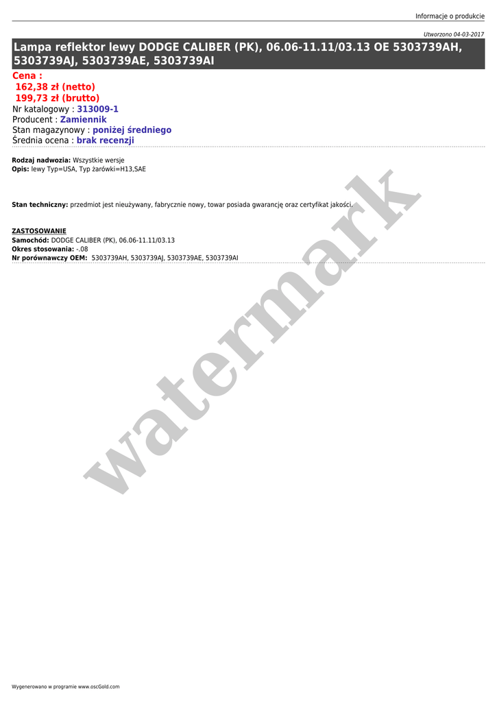 Informacje o produkcie Utworzono 04-03-2017 Lampa reflektor lewy DODGE CALIBER (PK), 06.06-11.11/03.13 OE 5303739AH, 5303739AJ, 5303739AE, 5303739AI Cena : 162,38 zł (netto) 199,73 zł (brutto) Nr katalogowy : 313009-1 Producent : Zamiennik Stan magazynowy : poniżej średniego Średnia ocena : brak recenzji er m ar k Rodzaj nadwozia: Wszystkie wersje Opis: lewy Typ=USA, Typ żarówki=H13,SAE Stan techniczny: przedmiot jest nieużywany, fabrycznie nowy, towar posiada gwarancję oraz certyfikat jakości. w at ZASTOSOWANIE Samochód: DODGE CALIBER (PK), 06.06-11.11/03.13 Okres stosowania: -.08 Nr porównawczy OEM: 5303739AH, 5303739AJ, 5303739AE, 5303739AI Wygenerowano w programie www.oscGold.com