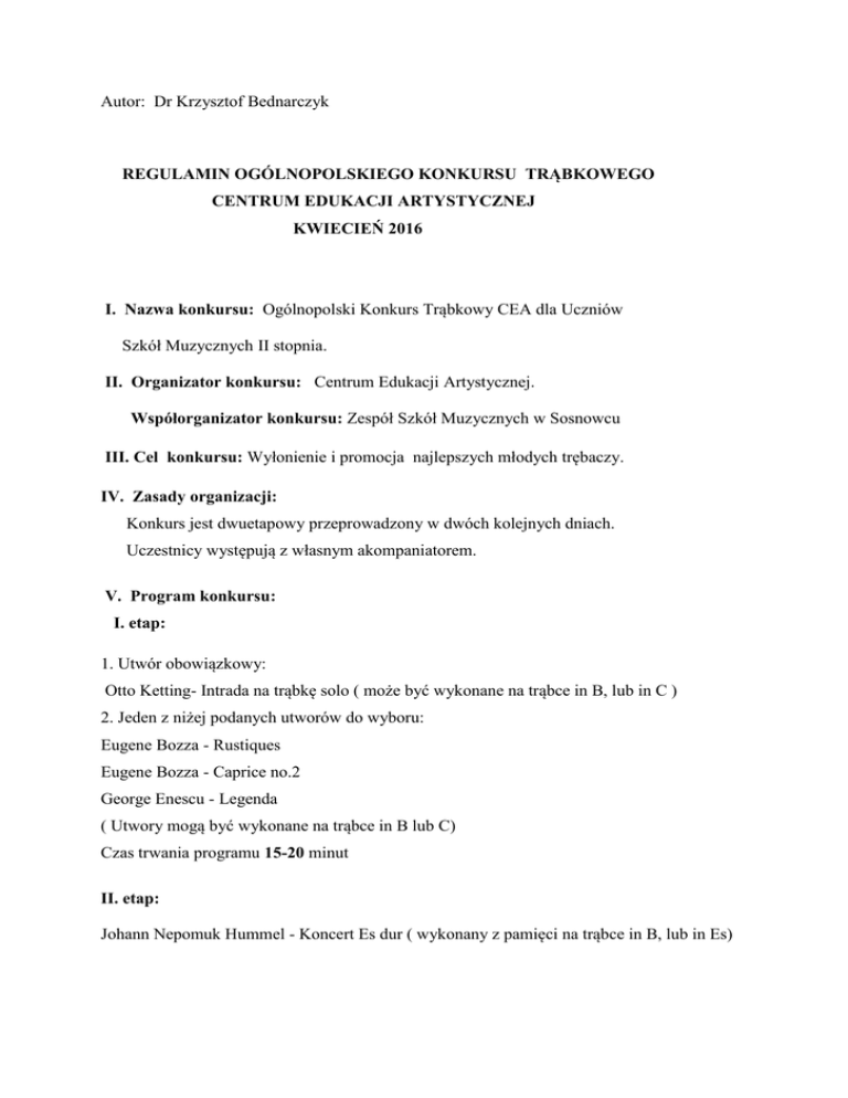 Autor: Dr Krzysztof Bednarczyk REGULAMIN OGÓLNOPOLSKIEGO KONKURSU TRĄBKOWEGO CENTRUM EDUKACJI ARTYSTYCZNEJ KWIECIEŃ 2016 I. Nazwa konkursu: Ogólnopolski Konkurs Trąbkowy CEA dla Uczniów Szkół Muzycznych II stopnia. II. Organizator konkursu: Centrum Edukacji Artystycznej. Współorganizator konkursu: Zespół Szkół Muzycznych w Sosnowcu III. Cel konkursu: Wyłonienie i promocja najlepszych młodych trębaczy. IV. Zasady organizacji: Konkurs jest dwuetapowy przeprowadzony w dwóch kolejnych dniach. Uczestnicy występują z własnym akompaniatorem. V. Program konkursu: I. etap: 1. Utwór obowiązkowy: Otto Ketting- Intrada na trąbkę solo ( może być wykonane na trąbce in B, lub in C ) 2. Jeden z niżej podanych utworów do wyboru: Eugene Bozza - Rustiques Eugene Bozza - Caprice no.2 George Enescu - Legenda ( Utwory mogą być wykonane na trąbce in B lub C) Czas trwania programu 15-20 minut II. etap: Johann Nepomuk Hummel - Koncert Es dur ( wykonany z pamięci na trąbce in B, lub in Es) VI. Kryteria oceny uczestników konkursu: Jury ocenia grę uczestników uwzględniając następujące kryteria: 1. Zgodność z tekstem. 2. Ogólne wrażenia artystyczne ( brzmienie, frazowanie, umiejętność odnalezienia się w stylu muzycznym danego utworu, indywidualne pomysły interpretacyjne) 3. Elementy techniki gry ( ściśle związane też z wrażeniem artystycznym- intonacja, artykulacja, dynamika, puls) VII. Punktacja: Uczestnicy są oceniani w skali od 1- 25. punktów. VIII. Laureaci: Grand Prix otrzymuje uczestnik, którego średnia ocen z obydwu etapów wynosi minimum 24 punkty. I miejsce - 23 pkt. II miejsce - 22 pkt. III miejsce - 21 pkt. Wyróżnienie - 20 pkt. Jury nie przyznaje nagród ex aequo i może nie przyznać którejś z nagród.