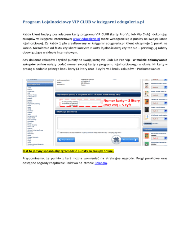 Program Lojalnościowy VIP CLUB w księgarni edugaleria.pl Każdy klient będący posiadaczem karty programu VIP CLUB (karty Pro Vip lub Vip Club) dokonując zakupów w księgarni internetowej www.edugaleria.pl może wzbogacić się o punkty na swojej karcie lojalnościowej. Za każdy 1 pln zrealizowany w księgarni edugaleria.pl Klient otrzymuje 1 punkt na karcie. Niezależnie od faktu czy klient korzysta z karty lojalnościowej czy też nie – przysługują rabaty obowiązujące w sklepie internetowym. Aby dokonać zakupów i zyskać punkty na swoją kartę Vip Club lub Pro Vip- w trakcie dokonywania zakupów online należy podać numer swojej karty z programu lojalnościowego w oknie: Nr karty – proszę o podanie pełnego kodu karty (3 litery oraz 5 cyfr) w 4 kroku zakupów – Podsumowanie: Jest to jedyny sposób aby zgromadzić punkty za zakupy online. Przypominamy, że punkty z kart można wymieniać na atrakcyjne nagrody. Progi punktowe oraz dostępne nagrody znajdziecie Państwo na stronie Polanglo.