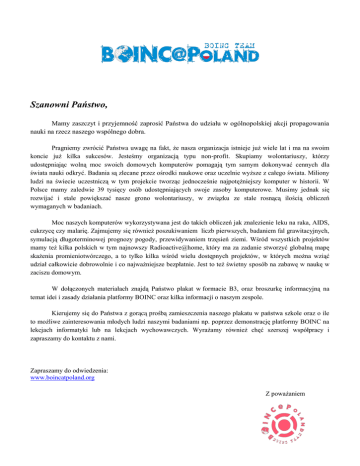Szanowni Państwo, Mamy zaszczyt i przyjemność zaprosić Państwa do udziału w ogólnopolskiej akcji propagowania nauki na rzecz naszego wspólnego dobra. Pragniemy zwrócić Państwa uwagę na fakt, że nasza organizacja istnieje już wiele lat i ma na swoim koncie już kilka sukcesów. Jesteśmy organizacją typu non-profit. Skupiamy wolontariuszy, którzy udostępniając wolną moc swoich domowych komputerów pomagają tym samym dokonywać cennych dla świata nauki odkryć. Badania są zlecane przez ośrodki naukowe oraz uczelnie wyższe z całego świata. Miliony ludzi na świecie uczestniczą w tym projekcie tworząc jednocześnie najpotężniejszy komputer w historii. W Polsce mamy zaledwie 39 tysięcy osób udostępniających swoje zasoby komputerowe. Musimy jednak się rozwijać i stale powiększać nasze grono wolontariuszy, w związku ze stale rosnącą ilością obliczeń wymaganych w badaniach. Moc naszych komputerów wykorzystywana jest do takich obliczeń jak znalezienie leku na raka, AIDS, cukrzycę czy malarię. Zajmujemy się również poszukiwaniem liczb pierwszych, badaniem fal grawitacyjnych, symulacją długoterminowej prognozy pogody, przewidywaniem trzęsień ziemi. Wśród wszystkich projektów mamy też kilka polskich w tym najnowszy Radioactive@home, który ma za zadanie stworzyć globalną mapę skażenia promieniotwórczego, a to tylko kilka wśród wielu dostępnych projektów, w których można wziąć udział całkowicie dobrowolnie i co najważniejsze bezpłatnie. Jest to też świetny sposób na zabawę w naukę w zaciszu domowym. W dołączonych materiałach znajdą Państwo plakat w formacie B3, oraz broszurkę informacyjną na temat idei i zasady działania platformy BOINC oraz kilka informacji o naszym zespole. Kierujemy się do Państwa z gorącą prośbą zamieszczenia naszego plakatu w państwa szkole oraz o ile to możliwe zainteresowania młodych ludzi naszymi badaniami np. poprzez demonstrację platformy BOINC na lekcjach informatyki lub na lekcjach wychowawczych. Wyrażamy również chęć szerszej współpracy i zapraszamy do kontaktu z nami. Zapraszamy do odwiedzenia: www.boincatpoland.org Z poważaniem