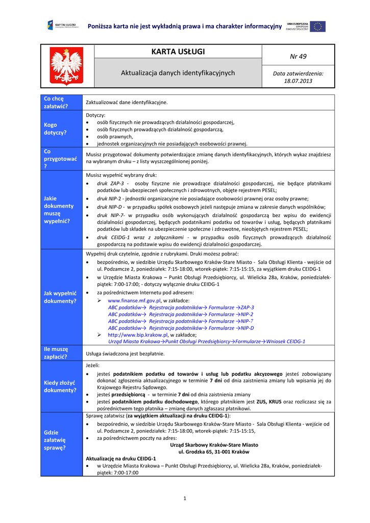 Poniższa karta nie jest wykładnią prawa i ma charakter informacyjny KARTA USŁUGI Aktualizacja danych identyfikacyjnych Nr 49 Data zatwierdzenia: 18.07.2013 Co chcę załatwić? Zaktualizować dane identyfikacyjne. Kogo dotyczy? Dotyczy: osób fizycznych nie prowadzących działalności gospodarczej, osób fizycznych prowadzących działalność gospodarczą, osób prawnych, jednostek organizacyjnych nie posiadających osobowości prawnej. Co przygotować ? Musisz przygotować dokumenty potwierdzające zmianę danych identyfikacyjnych, których wykaz znajdziesz na wybranym druku – z listy wyszczególnionej poniżej. Musisz wypełnić wybrany druk: Jakie dokumenty muszę wypełnić? druk ZAP-3 - osoby fizyczne nie prowadzące działalności gospodarczej, nie będące płatnikami podatków lub ubezpieczeń społecznych i zdrowotnych, objęte rejestrem PESEL; druk NIP-2 - jednostki organizacyjne nie posiadające osobowości prawnej oraz osoby prawne; druk NIP-D - w przypadku spółek osobowych jeżeli następuje zmiana w zakresie danych wspólników; druk NIP-7- w przypadku osób wykonujących działalność gospodarczą bez wpisu do ewidencji działalności gospodarczej, będących podatnikami podatku od towarów i usług, będących płatnikami podatków lub składek na ubezpieczenie społeczne i zdrowotne, nieobjętych rejestrem PESEL; druk CEIDG-1 wraz z załącznikami - w przypadku osób fizycznych prowadzących działalność gospodarczą na podstawie wpisu do ewidencji działalności gospodarczej. Wypełnij druk czytelnie, zgodnie z rubrykami. Druki możesz pobrać: Jak wypełnić dokumenty? Ile muszę zapłacić? bezpośrednio, w siedzibie Urzędu Skarbowego Kraków-Stare Miasto - Sala Obsługi Klienta - wejście od ul. Podzamcze 2, poniedziałek: 7:15-18:00, wtorek-piątek: 7:15-15:15, za wyjątkiem druku CEIDG-1 w Urzędzie Miasta Krakowa – Punkt Obsługi Przedsiębiorcy, ul. Wielicka 28a, Kraków, poniedziałekpiątek: 7:00-17:00; - dotyczy wyłącznie druku CEIDG-1 za pośrednictwem Internetu pod adresem: www.finanse.mf.gov.pl, w zakładce: ABC podatków→ Rejestracja podatników→ Formularze →ZAP-3 ABC podatków→ Rejestracja podatników→ Formularze →NIP-2 ABC podatków→ Rejestracja podatników→ Formularze →NIP-7 ABC podatków→ Rejestracja podatników→ Formularze →NIP-D http://www.bip.krakow.pl, w zakładce; Urząd Miasta Krakowa→Punkt Obsługi Przedsiębiorcy→Formularze→Wniosek CEIDG-1 Usługa świadczona jest bezpłatnie. Jeżeli: Kiedy złożyć dokumenty? Gdzie załatwię sprawę? jesteś podatnikiem podatku od towarów i usług lub podatku akcyzowego jesteś zobowiązany dokonać zgłoszenia aktualizacyjnego w terminie 7 dni od dnia zaistnienia zmiany lub wpisania jej do Krajowego Rejestru Sądowego. jesteś przedsiębiorcą - w terminie 7 dni od dnia zaistnienia zmiany jesteś podatnikiem podatku dochodowego, którego płatnikiem jest ZUS, KRUS oraz rozliczasz się za pośrednictwem tego płatnika – zmianę danych zgłaszasz płatnikowi. Sprawę załatwisz (za wyjątkiem aktualizacji na druku CEIDG-1): bezpośrednio, w siedzibie Urzędu Skarbowego Kraków-Stare Miasto - Sala Obsługi Klienta - wejście od ul. Podzamcze 2, poniedziałek: 7:15-18:00, wtorek-piątek: 7:15-15:15, za pośrednictwem poczty na adres: Urząd Skarbowy Kraków-Stare Miasto ul. Grodzka 65, 31-001 Kraków Aktualizację na druku CEIDG-1 w Urzędzie Miasta Krakowa – Punkt Obsługi Przedsiębiorcy, ul. Wielicka 28a, Kraków, poniedziałekpiątek: 7:00-17:00 . 1 Poniższa karta nie jest wykładnią prawa i ma charakter informacyjny Po otrzymaniu Twoich dokumentów: Co zrobi urząd? Jaki jest czas realizacji? Jak się odwołać? Załatwimy Twoją sprawę bez zbędnej zwłoki, nie później niż w terminie jednego miesiąca. W tym przypadku nie jest przewidziana droga odwoławcza. Informacje dodatkowe Podstawa prawna Zweryfikujemy zgłoszenie aktualizacyjne oraz załączone dokumenty. Jeżeli zgłoszenie aktualizacyjne jest niekompletne wezwiemy Cię do jego uzupełnienia. Jeżeli prawidłowość złożonych dokumentów nie budzi wątpliwości, zaktualizujemy Twoje dane identyfikacyjne. W przypadku zmian: objętych zaświadczeniem o wpisie do centralnej ewidencji działalności gospodarczej, aktualizację danych identyfikacyjnych składa się wyłącznie w Urzędzie Miasta Krakowa w Punkcie Obsługi Przedsiębiorcy ul. Wielicka 28A. Na druku CEIDG-1 możesz zgłosić również zmianę formy opodatkowania (rubryki od nr 18 do 20). Pamiętaj o podaniu numeru telefonu kontaktowego oraz adresu e-mail. Ustawa z dnia 13 października 1995r. o zasadach ewidencji i identyfikacji podatników i płatników (t.j. Dz. U. z 2012r. Nr 1314 ze zm.). Ustawa z dnia 20 sierpnia 1997r. o Krajowym Rejestrze Sądowym (t.j. Dz. U. z 2007r. Nr 168 poz. 1186 ze zm.). Ustawa z dnia 2 lipca 2004r. o swobodzie działalności gospodarczej (t.j. Dz. U. z 2013r. Nr 672 ze zm.). Rozporządzenie Ministra Finansów z dnia 30 grudnia 2010r. w sprawie sposobu przesyłania zgłoszeń oraz rodzajów podpisu elektronicznego, którym powinny być opatrzone (Dz. U. z 2010r. Nr 259 poz. 1768). 2
