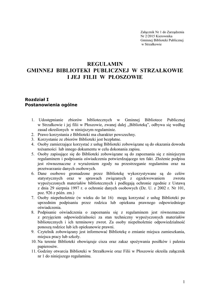 Załącznik Nr 1 do Zarządzenia Nr 2/2015 Kierownika Gminnej Biblioteki Publicznej w Strzałkowie REGULAMIN GMINNEJ BIBLIOTEKI PUBLICZNEJ W STRZAŁKOWIE I JEJ FILII W PŁOSZOWIE Rozdział I Postanowienia ogólne 1. Udostępnianie zbiorów bibliotecznych w Gminnej Bibliotece Publicznej w Strzałkowie i jej filii w Płoszowie, zwanej dalej „Biblioteką”, odbywa się według zasad określonych w niniejszym regulaminie. 2. Prawo korzystania z Biblioteki ma charakter powszechny. 3. Korzystanie ze zbiorów Biblioteki jest bezpłatne. 4. Osoby zamierzające korzystać z usług Biblioteki zobowiązane są do okazania dowodu tożsamości lub innego dokumentu w celu dokonania zapisu. 5. Osoby zapisujące się do Biblioteki zobowiązane są do zapoznania się z niniejszym regulaminem i podpisania oświadczenia potwierdzającego ten fakt. Złożenie podpisu jest równoznaczne z wyrażeniem zgody na przestrzeganie regulaminu oraz na przetwarzanie danych osobowych. 6. Dane osobowe gromadzone przez Bibliotekę wykorzystywane są do celów statystycznych oraz w sprawach związanych z egzekwowaniem zwrotu wypożyczonych materiałów bibliotecznych i podlegają ochronie zgodnie z Ustawą z dnia 29 sierpnia 1997 r. o ochronie danych osobowych (Dz. U. z 2002 r. Nr 101, poz. 926 z późn. zm.) 7. Osoby niepełnoletnie (w wieku do lat 16) mogą korzystać z usług Biblioteki po uprzednim podpisaniu przez rodzica lub opiekuna prawnego odpowiedniego oświadczenia. 8. Podpisanie oświadczenia o zapoznaniu się z regulaminem jest równoznaczne z przyjęciem odpowiedzialności za stan techniczny wypożyczonych materiałów bibliotecznych i ich terminowy zwrot. Za osoby niepełnoletnie odpowiedzialność ponoszą rodzice lub ich opiekunowie prawni. 9. Czytelnik zobowiązany jest informować Bibliotekę o zmianie miejsca zamieszkania, miejsca pracy lub szkoły. 10. Na terenie Biblioteki obowiązuje cisza oraz zakaz spożywania posiłków i palenia papierosów. 11. Godziny otwarcia Biblioteki w Strzałkowie oraz Filii w Płoszowie określa załącznik nr 1 do niniejszego regulaminu. 1 Rozdział II Zasady wypożyczania 1. Czytelnik może jednorazowo wypożyczyć 6 książek na okres nie dłuższy niż 2 miesiące. 2. Bibliotekarz może, na wniosek czytelnika, przedłużyć okres wypożyczenia książki, o ile nie ma na nią zapotrzebowania ze strony innych czytelników. W celu dokonania prolongaty („przedłużenia”), czytelnik powinien zgłosić się z książkami do Biblioteki. 3. Biblioteka może skrócić wymieniony w pkt. 1 termin zwrotu książki, jeśli stanowi ona szczególnie poszukiwaną pozycję. 4. Biblioteka może skrócić wymieniony w pkt. 1 termin zwrotu książki, jeśli stanowi ona szczególnie poszukiwaną pozycję. 5. W razie upływu terminu, na który zostały wypożyczone książki, Biblioteka ma prawo żądać niezwłocznego zwrotu wypożyczonych materiałów bibliotecznych, a w przypadku nie zastosowania się do upomnienia podjąć prawem przewidziane czynności w celu wyegzekwowania wypożyczonej książki lub jej równowartości. 6. W razie braku książki czytelnik może otrzymać informację, w której z najbliższych bibliotek znajduje się poszukiwana przez niego pozycja. 7. Na prośbę czytelnika Biblioteka może rezerwować książki aktualnie wypożyczone przez innych czytelników. 8. Osobom, które podały adres poczty elektronicznej, bibliotekarz może wysłać informację o odebraniu zamówionej książki (nie dotyczy Filii w Płoszowie). W takim wypadku książkę należy odebrać w ciągu 7 dni. 9. Osoby, które z różnych względów nie podały adresu poczty elektronicznej, powinny samodzielnie dowiadywać się, czy zamówiona przez nich książka wróciła do biblioteki. 10. Na prośbę czytelnika Biblioteka sprowadza, w miarę możliwości, książki z drugiej placówki znajdującej się na terenie Gminy Radomsko (z Filii w Płoszowie/ biblioteki w Strzałkowie) w ramach wypożyczeń międzybibliotecznych. Termin zwrotu takiej książki upływa po 30 dniach od jej wypożyczenia. 11. Punkty: 6, 7, 8, 9 i 10 dotyczą tylko tych czytelników, którzy przestrzegają regulaminu biblioteki. 12. Czytelnik może również wypożyczać czasopisma (spis tytułów wywieszony jest na tablicy wewnątrz biblioteki). 13. W Bibliotece obowiązuje wolny dostęp do półek. W związku z tym czytelnik pozostawia torbę lub teczkę w miejscu do tego przeznaczonym lub wskazanym przez bibliotekarza. Rozdział III Poszanowanie książek 1. Czytelnik jest zobowiązany do poszanowania książek oraz terminowego zwrotu wypożyczonych książek. Wszelkie uszkodzenia i defekty wypożyczonych materiałów bibliotecznych należy zgłaszać niezwłocznie po ich zauważeniu. 2. Za szkody wynikłe z zagubienia lub zniszczenia książki odpowiada czytelnik. 3. Czytelnik, który zagubi lub zniszczy wypożyczone materiały biblioteczne, zobowiązany jest odkupić takie same książki lub w porozumieniu z bibliotekarzem – inne książki o identycznej wartości. W przypadku zniszczenia lub zagubienia jednej z części wydawnictwa wieloczęściowego, czytelnik odpowiada jak za całość wydawnictwa. 2 Rozdział IV Regulamin czytelni 1. Z księgozbioru czytelni można korzystać tylko na miejscu. Zbiory udostępnia bibliotekarz. 2. W czytelni obowiązuje cisza oraz zakaz spożywania posiłków i napojów. 3. Materiały własne wnoszone do czytelni, czytelnik zobowiązany jest zgłosić bibliotekarzowi. Rozdział V - dotyczy tylko Siedziby GBP w Strzałkowie Zasady korzystania ze sprzętu komputerowego i Internetu 1. Z czytelni internetowej mogą korzystać wszyscy mieszkańcy gminy w godzinach pracy Biblioteki. 2. Korzystanie z komputerów i Internetu jest bezpłatne. 3. Kierownik biblioteki prowadzi ewidencję osób korzystających ze sprzętu komputerowego. 4. Z jednego stanowiska komputerowego może jednocześnie korzystać tylko jedna osoba. 5. Sprzęt komputerowy udostępniany jest pod nadzorem kierow