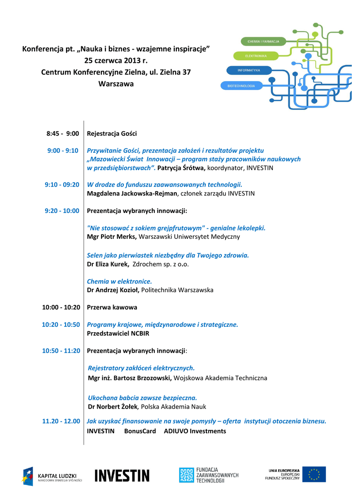 Konferencja pt. „Nauka i biznes - wzajemne inspiracje” 25 czerwca 2013 r. Centrum Konferencyjne Zielna, ul. Zielna 37 Warszawa 8:45 - 9:00 Rejestracja Gości 9:00 - 9:10 Przywitanie Gości, prezentacja założeń i rezultatów projektu „Mazowiecki Świat Innowacji – program staży pracowników naukowych w przedsiębiorstwach”. Patrycja Śrótwa, koordynator, INVESTIN 9:10 - 09:20 W drodze do funduszu zaawansowanych technologii. Magdalena Jackowska-Rejman, członek zarządu INVESTIN 9:20 - 10:00 Prezentacja wybranych innowacji: "Nie stosować z sokiem grejpfrutowym" - genialne lekolepki. Mgr Piotr Merks, Warszawski Uniwersytet Medyczny Selen jako pierwiastek niezbędny dla Twojego zdrowia. Dr Eliza Kurek, Zdrochem sp. z o.o. Chemia w elektronice. Dr Andrzej Kozioł, Politechnika Warszawska 10:00 - 10:20 Przerwa kawowa 10:20 - 10:50 Programy krajowe, międzynarodowe i strategiczne. Przedstawiciel NCBIR 10:50 - 11:20 Prezentacja wybranych innowacji: Rejestratory zakłóceń elektrycznych. Mgr inż. Bartosz Brzozowski, Wojskowa Akademia Techniczna Ukochana babcia zawsze bezpieczna. Dr Norbert Żołek, Polska Akademia Nauk 11.20 - 12.00 Jak uzyskać finansowanie na swoje pomysły – oferta instytucji otoczenia biznesu. INVESTIN BonusCard ADIUVO Investments 12:00 - 12:40 Lunch 12:40 - 13:40 PRO-KREACJA - 6 sekretów ojców innowacji. Tworzenie nowych produktów. Tomasz Rudolf, INNOVATIKA 13:40 - 14:10 Prezentacja wybranych innowacji: Nadzorujemy badania kliniczne. Mgr Anna Kowalik, Warszawski Uniwersytet Medyczny Biotechnologia jako rynek docelowy - marketing aplikacyjny. Ignacy Mościcki, IGHT sp z o.o. Co ma wspólnego suplementacja diety z płodnością? Dr Małgorzata Witkowska-Zimny, Warszawski Uniwersytet Medyczny 14:10 - 14:30 Współpraca innowacyjnej firmy ze środowiskiem akademickim. Dr inż. Jarosław Bułka, SILVERMEDIA 14:30 - 14:40 Podążaj za (x) – Festiwal Młodych Naukowców E(x)plory. Katarzyna Skawińska, koordynator, Fundacja Zaawansowanych Technologii Moderator konferencji - dr Bartosz Walter Patronat medialny: Patronat: