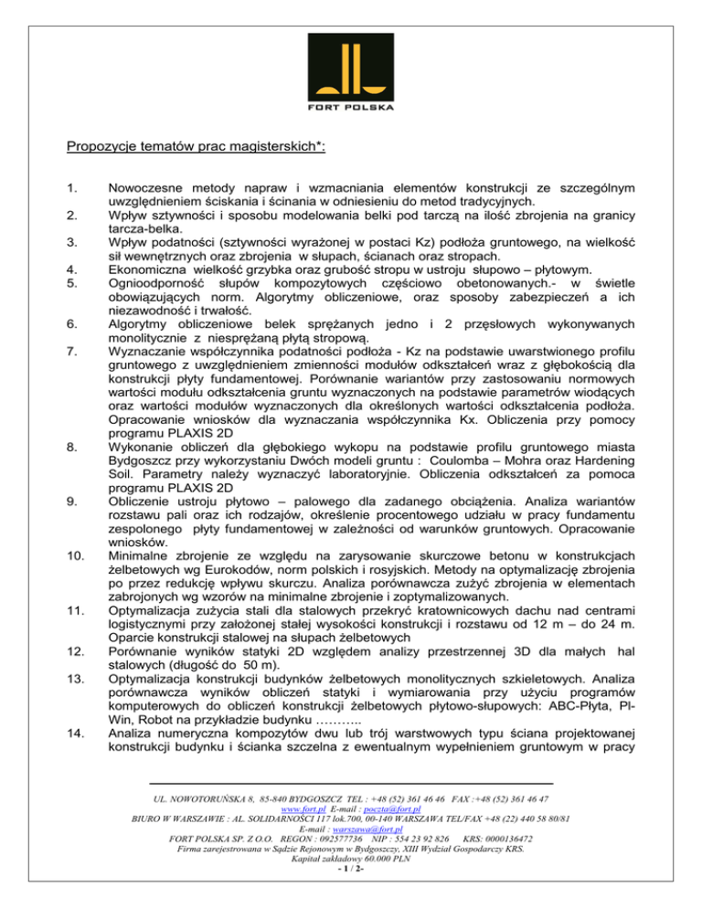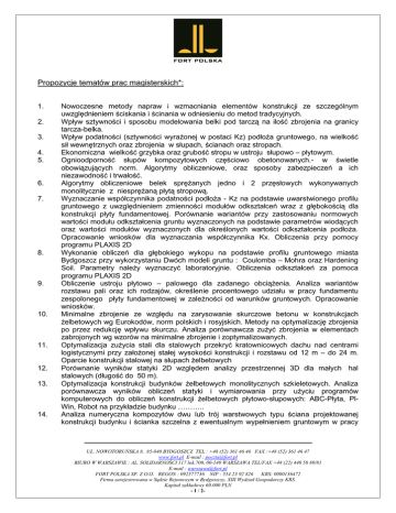 Propozycje tematów prac magisterskich*: 1. 2. 3. 4. 5. 6. 7. 8. 9. 10. 11. 12. 13. 14. Nowoczesne metody napraw i wzmacniania elementów konstrukcji ze szczególnym uwzględnieniem ściskania i ścinania w odniesieniu do metod tradycyjnych. Wpływ sztywności i sposobu modelowania belki pod tarczą na ilość zbrojenia na granicy tarcza-belka. Wpływ podatności (sztywności wyrażonej w postaci Kz) podłoża gruntowego, na wielkość sił wewnętrznych oraz zbrojenia w słupach, ścianach oraz stropach. Ekonomiczna wielkość grzybka oraz grubość stropu w ustroju słupowo – płytowym. Ognioodporność słupów kompozytowych częściowo obetonowanych.- w świetle obowiązujących norm. Algorytmy obliczeniowe, oraz sposoby zabezpieczeń a ich niezawodność i trwałość. Algorytmy obliczeniowe belek sprężanych jedno i 2 przęsłowych wykonywanych monolitycznie z niesprężaną płytą stropową. Wyznaczanie współczynnika podatności podłoża - Kz na podstawie uwarstwionego profilu gruntowego z uwzględnieniem zmienności modułów odkształceń wraz z głębokością dla konstrukcji płyty fundamentowej. Porównanie wariantów przy zastosowaniu normowych wartości modułu odkształcenia gruntu wyznaczonych na podstawie parametrów wiodących oraz wartości modułów wyznaczonych dla określonych wartości odkształcenia podłoża. Opracowanie wniosków dla wyznaczania współczynnika Kx. Obliczenia przy pomocy programu PLAXIS 2D Wykonanie obliczeń dla głębokiego wykopu na podstawie profilu gruntowego miasta Bydgoszcz przy wykorzystaniu Dwóch modeli gruntu : Coulomba – Mohra oraz Hardening Soil. Parametry należy wyznaczyć laboratoryjnie. Obliczenia odkształceń za pomoca programu PLAXIS 2D Obliczenie ustroju płytowo – palowego dla zadanego obciążenia. Analiza wariantów rozstawu pali oraz ich rodzajów, określenie procentowego udziału w pracy fundamentu zespolonego płyty fundamentowej w zależności od warunków gruntowych. Opracowanie wniosków. Minimalne zbrojenie ze względu na zarysowanie skurczowe betonu w konstrukcjach żelbetowych wg Eurokodów, norm polskich i rosyjskich. Metody na optymalizację zbrojenia po przez redukcję wpływu skurczu. Analiza porównawcza zużyć zbrojenia w elementach zabrojonych wg wzorów na minimalne zbrojenie i zoptymalizowanych. Optymalizacja zużycia stali dla stalowych przekryć kratownicowych dachu nad centrami logistycznymi przy założonej stałej wysokości konstrukcji i rozstawu od 12 m – do 24 m. Oparcie konstrukcji stalowej na słupach żelbetowych Porównanie wyników statyki 2D względem analizy przestrzennej 3D dla małych hal stalowych (długość do 50 m). Optymalizacja konstrukcji budynków żelbetowych monolitycznych szkieletowych. Analiza porównawcza wyników obliczeń statyki i wymiarowania przy użyciu programów komputerowych do obliczeń konstrukcji żelbetowych płytowo-słupowych: ABC-Płyta, PlWin, Robot na przykładzie budynku ……….. Analiza numeryczna kompozytów dwu lub trój warstwowych typu ściana projektowanej konstrukcji budynku i ścianka szczelna z ewentualnym wypełnieniem gruntowym w pracy UL. NOWOTORUŃSKA 8, 85-840 BYDGOSZCZ TEL : +48 (52) 361 46 46 FAX :+48 (52) 361 46 47 www.fort.pl E-mail : [email protected] BIURO W WARSZAWIE : AL. SOLIDARNOŚCI 117 lok.700, 00-140 WARSZAWA TEL/FAX +48 (22) 440 58 80/81 E-mail : [email protected] FORT POLSKA SP. Z O.O. REGON : 092577736 NIP : 554 23 92 826 KRS: 0000136472 Firma zarejestrowana w Sądzie Rejonowym w Bydgoszczy, XIII Wydział Gospodarczy KRS. Kapitał zakładowy 60.000 PLN - 1 / 2- 15. 16. 17. ściany oporowej - optymalizacja oporowej konstrukcji trwałej z redystrybucją sił na budynek projektowany. Analiza zachowania geowłóknin i geotkanin w warunkach okresowego przesuszania i nawadniania ze szczególnym uwzględnieniem gradientu początkowego po każdej zmianie nasycenia. Wpływ rozdzielonych poziomów wodonośnych (dwóch lub trzech) na ścianę oporową głębokiego wykopu. Wymiarowanie ścian oporowych z wykorzystaniem różnych modeli w programach wykorzystujących współczynniki podatności bocznej podłoża (np. GGU Retain, Geo5) oraz MES (np. Plaxis). Analiza porównawcza na podstawie wymienionych metod. Projektowanie budynków z użyciem elementów półprefabrykowanych ( ścian oraz belek zespolonych, stropów filigran). Metody obliczeniowe, zalety i wady systemu. *Tematy prac magisterskich są w trakcie weryfikacji przez UTP, mogą ulec niewielkim zmianom. UL. NOWOTORUŃSKA 8, 85-840 BYDGOSZCZ TEL : +48 (52) 361 46 46 FAX :+48 (52) 361 46 47 www.fort.pl E-mail : [email protected] BIURO W WARSZAWIE : AL. SOLIDARNOŚCI 117 lok.700, 00-140 WARSZAWA TEL/FAX +48 (22) 440 58 80/81 E-mail : [email protected] FORT POLSKA SP. Z O.O. REGON : 092577736 NIP : 554 23 92 826 KRS: 0000136472 Firma zarejestrowana w Sądzie Rejonowym w Bydgoszczy, XIII Wydział Gospodarczy KRS. Kapitał zakładowy 60.000 PLN - 2 / 2-