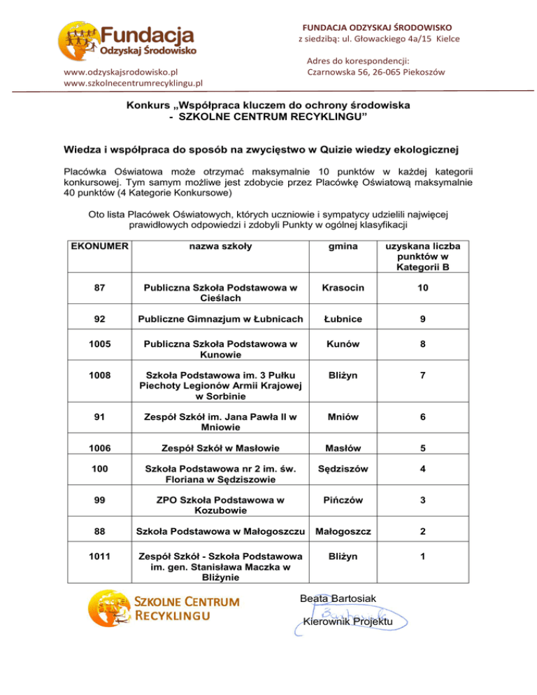 FUNDACJA ODZYSKAJ ŚRODOWISKO z siedzibą: ul. Głowackiego 4a/15 Kielce Adres do korespondencji: Czarnowska 56, 26-065 Piekoszów www.odzyskajsrodowisko.pl www.szkolnecentrumrecyklingu.pl Konkurs „Współpraca kluczem do ochrony środowiska - SZKOLNE CENTRUM RECYKLINGU” Wiedza i współpraca do sposób na zwycięstwo w Quizie wiedzy ekologicznej Placówka Oświatowa może otrzymać maksymalnie 10 punktów w każdej kategorii konkursowej. Tym samym możliwe jest zdobycie przez Placówkę Oświatową maksymalnie 40 punktów (4 Kategorie Konkursowe) Oto lista Placówek Oświatowych, których uczniowie i sympatycy udzielili najwięcej prawidłowych odpowiedzi i zdobyli Punkty w ogólnej klasyfikacji EKONUMER nazwa szkoły gmina uzyskana liczba punktów w Kategorii B 87 Publiczna Szkoła Podstawowa w Cieślach Krasocin 10 92 Publiczne Gimnazjum w Łubnicach Łubnice 9 1005 Publiczna Szkoła Podstawowa w Kunowie Kunów 8 1008 Szkoła Podstawowa im. 3 Pułku Piechoty Legionów Armii Krajowej w Sorbinie Bliżyn 7 91 Zespół Szkół im. Jana Pawła II w Mniowie Mniów 6 1006 Zespół Szkół w Masłowie Masłów 5 100 Szkoła Podstawowa nr 2 im. św. Floriana w Sędziszowie Sędziszów 4 99 ZPO Szkoła Podstawowa w Kozubowie Pińczów 3 88 Szkoła Podstawowa w Małogoszczu Małogoszcz 2 1011 Zespół Szkół - Szkoła Podstawowa im. gen. Stanisława Maczka w Bliżynie Bliżyn 1 Beata Bartosiak Kierownik Projektu