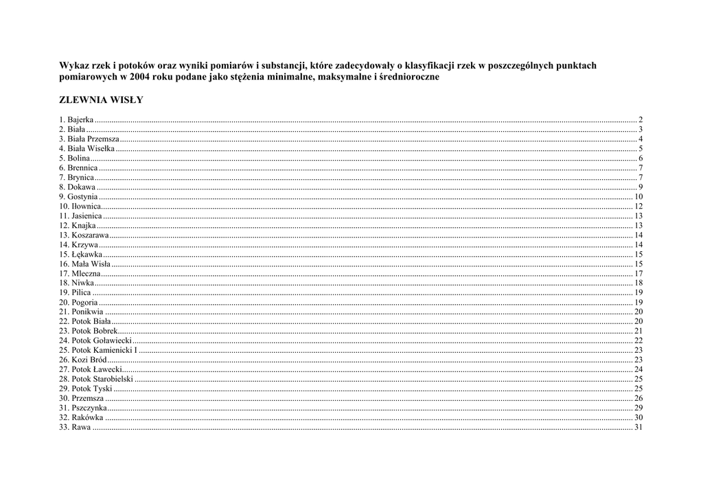 Wykaz rzek i potoków oraz wyniki pomiarów i substancji, które zadecydowały o klasyfikacji rzek w poszczególnych punktach pomiarowych w 2004 roku podane jako stężenia minimalne, maksymalne i średnioroczne ZLEWNIA WISŁY 1. Bajerka .................................................................................................................................................................................................................................................................. 2 2. Biała ...................................................................................................................................................................................................................................................................... 3 3. Biała Przemsza...................................................................................................................................................................................................................................................... 4 4. Biała Wisełka ........................................................................................................................................................................................................................................................ 5 5. Bolina.................................................................................................................................................................................................................................................................... 6 6. Brennica ................................................................................................................................................................................................................................................................ 7 7. Brynica.................................................................................................................................................................................................................................................................. 7 8. Dokawa ................................................................................................................................................................................................................................................................. 9 9. Gostynia .............................................................................................................................................................................................................................................................. 10 10. Iłownica............................................................................................................................................................................................................................................................. 12 11. Jasienica ............................................................................................................................................................................................................................................................ 13 12. Knajka ............................................................................................................................................................................................................................................................... 13 13. Koszarawa......................................................................................................................................................................................................................................................... 14 14. Krzywa.............................................................................................................................................................................................................................................................. 14 15. Łękawka............................................................................................................................................................................................................................................................ 15 16. Mała Wisła ........................................................................................................................................................................................................................................................ 15 17. Mleczna............................................................................................................................................................................................................................................................. 17 18. Niwka................................................................................................................................................................................................................................................................ 18 19. Pilica ................................................................................................................................................................................................................................................................. 19 20. Pogoria .............................................................................................................................................................................................................................................................. 19 21. Ponikwia ........................................................................................................................................................................................................................................................... 20 22. Potok Biała..........................................................................................