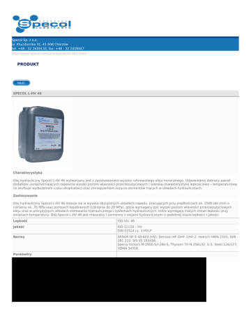 Specol Sp. z o.o. ul. Kluczborska 31, 41-508 Chorzów tel. +48 - 32 2459133, fax: +48 - 32 2459447 http://www.specol.com.pl/ain/produkt/465.html PRODUKT SPECOL L-HV 46 Charakterystyka Olej hydrauliczny Specol L-HV 46 wytwarzany jest z zastosowaniem wysoko rafinowanego oleju mineralnego. Odpowiednio dobrany pakiet dodatków uszlachetniających zapewnia wysoki poziom własności przeciwzużyciowych i szeroką charakterystykę lepkościowo – temperaturową co skutkuje wydłużeniem czasu eksploatacji oraz zmniejszeniem zużycia elementów trących w układach hydraulicznych. Zastosowanie Olej hydrauliczny Specol L-HV 46 stosuje się w wysoko obciążonych układach napędu, pracujących przy prędkościach ok. 2500 obr./min o ciśnieniu ok. 35 MPa oraz pompach łopatkowych (ciśnienie do 20 MPa), gdzie wymagany jest wysoki poziom własności przeciwzużyciowych oleju oraz w precyzyjnych układach sterowania hydraulicznego i systemach hydraulicznych, które wymagają małych zmian lepkości przy zmianach temperatury. Olej Specol L-HV 46 jest mieszalny i zamienny z olejami hydraulicznymi o podobnej klasie lepkości i jakości. Lepkość ISO VG: 46 Jakość ISO 11158 – HV DIN 51524 cz. 3 HVLP Normy AFNOR NF E 48-603 (HV); Denison HF-0/HF-1/HF-2; Hoesch HWN 2333; SEB 181 222; SIS SS 155434; Sperry Vickers M-2950-S/I-286-S; Thyssen TH N-256132; U.S. Steel 126/127; VDMA 24318. Parametry Parametry 46 Lepkość kinematyczna w temp. 40C, [mm2/s] 45 Wskaźnik lepkości 145 Temperatura płynięcia, min. [C] - 30 Temperatura zapłonu, [C] 210 Zawartość wody, % nie zawiera Odporność na pienienie [cm3]: w temp. 25C w temp. 95C w temp. 25C po badaniu w 95C 0/0 0/0 0/0 Działanie korodujące na płytkach z miedzi, stopień korozji (3h/120 C) 1a Własności deemulgujace - czas rozdziału emulsji z Max. 10 min. wodą do uzyskania [min.]: - 40 - 43 ml oleju - 37 - 40 ml wody 54C - 0 - 3 ml emulsji w temperaturze [C] Własności przeciwzużyciowe, (1h/40KG), [mm] 0,5 Opakowania Karta charakterystyk 82C