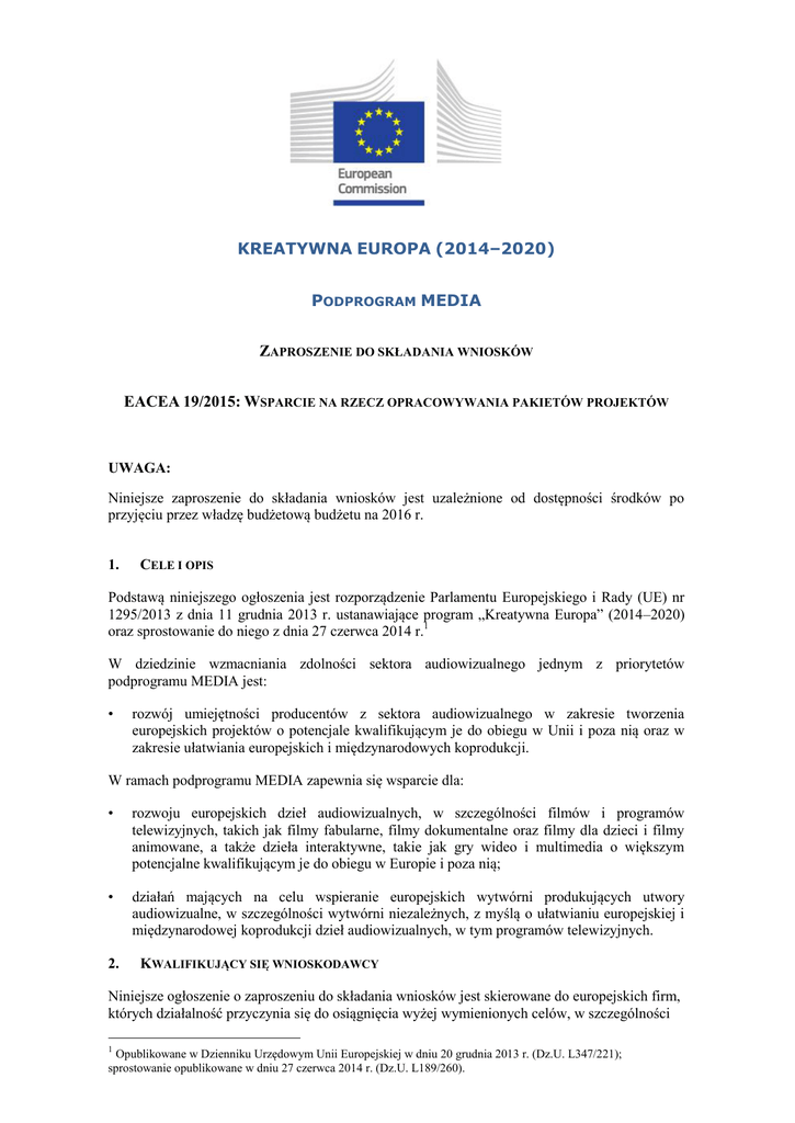 KREATYWNA EUROPA (2014–2020) PODPROGRAM MEDIA ZAPROSZENIE DO SKŁADANIA WNIOSKÓW EACEA 19/2015: WSPARCIE NA RZECZ OPRACOWYWANIA PAKIETÓW PROJEKTÓW UWAGA: Niniejsze zaproszenie do składania wniosków jest uzależnione od dostępności środków po przyjęciu przez władzę budżetową budżetu na 2016 r. 1. CELE I OPIS Podstawą niniejszego ogłoszenia jest rozporządzenie Parlamentu Europejskiego i Rady (UE) nr 1295/2013 z dnia 11 grudnia 2013 r. ustanawiające program „Kreatywna Europa” (2014–2020) oraz sprostowanie do niego z dnia 27 czerwca 2014 r.1 W dziedzinie wzmacniania zdolności sektora audiowizualnego jednym z priorytetów podprogramu MEDIA jest: • rozwój umiejętności producentów z sektora audiowizualnego w zakresie tworzenia europejskich projektów o potencjale kwalifikującym je do obiegu w Unii i poza nią oraz w zakresie ułatwiania europejskich i międzynarodowych koprodukcji. W ramach podprogramu MEDIA zapewnia się wsparcie dla: • rozwoju europejskich dzieł audiowizualnych, w szczególności filmów i programów telewizyjnych, takich jak filmy fabularne, filmy dokumentalne oraz filmy dla dzieci i filmy animowane, a także dzieła interaktywne, takie jak gry wideo i multimedia o większym potencjalne kwalifikującym je do obiegu w Europie i poza nią; • działań mających na celu wspieranie europejskich wytwórni produkujących utwory audiowizualne, w szczególności wytwórni niezależnych, z myślą o ułatwianiu europejskiej i międzynarodowej koprodukcji dzieł audiowizualnych, w tym programów telewizyjnych. 2. KWALIFIKUJĄCY SIĘ WNIOSKODAWCY Niniejsze ogłoszenie o zaproszeniu do składania wniosków jest skierowane do europejskich firm, których działalność przyczynia się do osiągnięcia wyżej wymienionych celów, w szczególności 1 Opublikowane w Dzienniku Urzędowym Unii Europejskiej w dniu 20 grudnia 2013 r. (Dz.U. L347/221); sprostowanie opublikowane w dniu 27 czerwca 2014 r. (Dz.U. L189/260). do niezależnych wytwórni produkujących utwory audiowizualne, które zostały utworzone zgodnie z prawem co najmniej 36 miesięcy przed datą składania wniosków i które mogą wykazać niedawne sukcesy. Wnioski złożone przez podmioty prawne z siedzibą w państwie należącym do jednej z poniższych kategorii kwalifikują się, o ile spełnione są wszystkie warunki określone w art. 8 rozporządzenia ustanawiającego program „Kreatywna Europa”: - państwa członkowskie UE; - państwa przystępujące i kandydujące do Unii oraz potencjalni kandydaci korzystający ze strategii przedakcesyjnej, zgodnie z ogólnymi zasadami i warunkami ich uczestnictwa w programach unijnych ustanowionymi w odpowiednich umowach ramowych, decyzjach rady stowarzyszenia lub podobnych porozumieniach; - państwa należące do EFTA, które są stroną Porozumienia EOG zgodnie z tym Porozumieniem; - Konfederacja Szwajcarska, na podstawie umowy dwustronnej z tym państwem; - państwa objęte europejską polityką sąsiedztwa, zgodnie z procedurami ustalonymi wspólnie z tymi państwami po zawarciu umów ramowych dotyczących ich uczestnictwa w programach Unii Europejskiej. Program jest również otwarty dla dwustronnych lub wielostronnych działań w ramach współpracy ukierunkowanych na wybrane państwa lub regiony w oparciu o dodatkowe środki wpłacone przez te państwa lub regiony oraz uregulowania szczególne, które mają być ustalone z tymi państwami lub regionami. Mogą zostać wybrane wnioski złożone przez wnioskodawców z państw trzecich, pod warunkiem że w dniu podjęcia decyzji o przyznaniu dotacji będą istniały podpisane umowy określające warunki udziału tych państw w programie zgodnie z rozporządzeniem, o którym mowa powyżej. 3. KWALIFIKUJĄCE SIĘ DZIAŁANIA Do otrzymania dotacji kwalifikują się działania w zakresie tworzenia następujących dzieł audiowizualnych: - filmy fabularne, filmy animowane i kreatywne filmy dokumentalne o czasie trwania co najmniej 60 minut, przeznaczone przede wszystkim do dystrybucji kinowej, - dramaty filmowe lub seriale dramatyczne o całkowitym czasie trwania co najmniej 90 minut, filmy lub seriale animowane o całkowitym czasie trwania co najmniej 24 minuty oraz kreatywne filmy lub seriale dokumentalne o całkowitym czasie trwania co najmniej 50 minut przeznaczone przede wszystkim do użycia w telewizji lub na platformach cyfrowych, - projekty fabularne o całkowitym czasie trwania lub czasie doświadczeń użytkowników co najmniej 90 minut, filmy animowane o całkowitym czasie trwania lub czasie doświadczeń użytkowników co najmniej 24 minuty oraz kreatywne filmy dokumentalne o całkowitym czasie trwania lub czasie doświadczeń użytkowników co najmniej 50 minut, przeznaczone przede wszystkim do celów wykorzystywania na platformach cyfrowych. W ramach niniejszego zaproszenia do składania wniosków wyznaczono jeden termin składania wniosków. Wniosek o wsparcie musi zostać złożony w okresie od dnia publikacji zaproszenia do składania wniosków do dnia 4 lutego 2016 r. do godz. 12.00 (południe czasu brukselskiego). Czas trwania projektu wynosi do 30 miesięcy od daty złożenia wniosku. 2 4. KRYTERIA PRZYZNAWANIA DOTACJI Punkty (na 100 możliwych) zostaną przyznane na podstawie następujących wag: adekwatność i europejska wartość dodana (20 pkt) • podejście przedsiębiorstwa do tworzenia pakietu 3–5 projektów na poziomie europejskim i międzynarodowym jakość treści i działań (20 pkt) • jakość pakietu projektów, jakość strategii rozwoju, jakość strategii finansowania i jej wymiaru europejskiego rozpowszechnianie wyników projektu (20 pkt) • strategia dystrybucji i marketingu na poziomie europejskim i międzynarodowym organizacja zespołu odpowiedzialnego za projekt (10 pkt) • podział ról i obowiązków zespołu kreatywnego w odniesieniu do szczegółowych celów proponowanego działania wpływ i zrównoważony charakter (10 pkt) • wykonalność pa