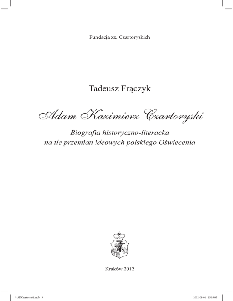 Fundacja xx. Czartoryskich Tadeusz Fr czyk Adam Kazimierz Czartoryski Biografia historyczno-literacka na tle przemian ideowych polskiego O wiecenia Kraków 2012 ^ AKCzartoryski.indb 3 2012-08-01 15:03:03 Spis treści Julian Ma!lanka, Wst!p.................................................................................................. 7 Od redakcji ..................................................................................................................... 15 Z rodu Giedymina .......................................................................................................... 17 Korzenie polskie i europejskie ....................................................................................... 31 Drogi ku Koronie ........................................................................................................... 47 Dantisci natus ................................................................................................................ 57 Pierwsi mistrzowie ......................................................................................................... 71 Edukacja polityczna ....................................................................................................... 97 Turniej panegirystów ..................................................................................................... 115 W wirach konfederacji ................................................................................................... 127 Marsza"ek sejmu konwokacyjnego ................................................................................ 157 Ksi #$ i król ................................................................................................................... 177 „Monitor” ....................................................................................................................... 187 Towarzystwo Literatów w Polszcze Ustanowione (1765-1770).................................... 197 Korpus Kadetów ............................................................................................................ 201 Société Littéraire du prince Adam ................................................................................. 211 Suum cuique. Manifest szkaradny a Suum cuique ......................................................... 225 Pa"ac B"$kitny w o!wieconej Warszawie ....................................................................... 235 Zaciskanie p$tli i wybuch konfederacji barskiej ............................................................ 241 Wyjazd za granic$ .......................................................................................................... 269 Bukiet na szcz$!liwy powrót ......................................................................................... 279 Pozornie ja!niejszy horyzont ......................................................................................... 283 Katechizm kadecki i inne przepisy korpusowe .............................................................. 291 Teatr i dramat kadecki .................................................................................................... 301 Panna na wydaniu.......................................................................................................... 305 Problem Juvenela de Carlancasa .................................................................................... 319 Teatr (1765-1768) .......................................................................................................... 331 Przepisy dla gwardii pieszej Wielkiego Ksi$stwa Litewskiego ..................................... 339 Wyjazd na Zachód (1772-1774) przerwany Canoss petersbursk ............................... 347 ^ AKCzartoryski.indb 5 2012-08-01 15:03:03 6 Spis treści Komisarz Komisji Edukacji Narodowej (1774-1783) ................................................... 353 Spadkobierca polityki ksi$cia kanclerza (1775-1776) ................................................... 363 Wo"czyn – projektowany o!rodek kulturalny (1776-1779) ........................................... 367 Prowizoryczny dzia" dóbr .............................................................................................. 377 Koniec zainteresowa% teatralnych ................................................................................. 385 Pa"ac B"$kitny i jego klientela ....................................................................................... 397 Zniesienie Departamentu Wojskowego i Rady Nieustaj cej (1788-1789) .................... 407 Uchwalanie podatków i formowanie wojska (1789) ..................................................... 415 Prace sejmowe i publicystyczne (1790) ......................................................................... 433 „Ko%czy& – odpowiedzia" ks. Czartoryski – za d"ugo to si$ ju# wlecze” ...................... 449 Ostatni rok Sejmu Wielkiego ......................................................................................... 455 Poselstwo do Drezna ...................................................................................................... 465 Wyjazd do Austrii .......................................................................................................... 471 Kuszenie Targowicy i narodziny insurekcji .................................................................. 475 Sekwestr dóbr i decyzja wys"ania synów do Petersburga .............................................. 481 Listowne po#egnanie z monarch i dumania sieniawskie ............................................. 485 Powrót do Pu"aw ............................................................................................................ 493 Zako%czenie ................................................................................................................... 523 Wykaz ilustracji .............................................................................................................
