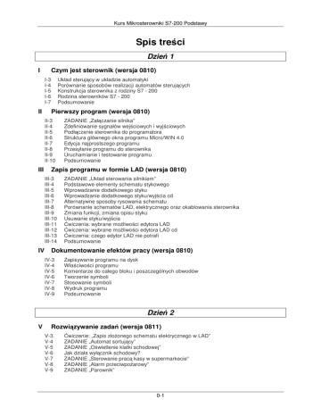 Kurs Mikrosterowniki S7-200 Podstawy Spis tre ci Dzie 1 I Czym jest sterownik (wersja 0810) I-3 I-4 I-5 I-6 I-7 II Układ steruj cy w układzie automatyki Porównanie sposobów realizacji automatów steruj cych Konstrukcja sterownika z rodziny S7 - 200 Rodzina sterowników S7 - 200 Podsumowanie Pierwszy program (wersja 0810) II-3 II-4 II-5 II-6 II-7 II-8 II-9 II-10 III Zapis programu w formie LAD (wersja 0810) III-3 III-4 III-5 III-6 III-7 III-8 III-9 III-10 III-11 III-12 III-13 III-14 IV ZADANIE „Zał czanie silnika” Zdefiniowanie sygnałów wej ciowych i wyj ciowych Podł czanie sterownika do programatora Struktura głównego okna programu Micro/WIN 4.0 Edycja najprostszego programu Przesyłanie programu do sterownika Uruchamianie i testowanie programu Podsumowanie ZADANIE „Układ sterowania silnikiem” Podstawowe elementy schematu stykowego Wprowadzanie dodatkowego styku Wprowadzanie dodatkowego styku/wyj cia cd Alternatywne sposoby rysowania schematu Porównanie schematów LAD, elektrycznego oraz okablowania sterownika Zmiana funkcji, zmiana opisu styku Usuwanie styku/wyj cia wiczenia: wybrane mo liwo ci edytora LAD wiczenia: wybrane mo liwo ci edytora LAD cd wiczenia: czego edytor LAD nie potrafi Podsumowanie Dokumentowanie efektów pracy (wersja 0810) IV-3 IV-4 IV-5 IV-6 IV-7 IV-8 IV-9 Zapisywanie programu na dysk Wła ciwo ci programu Komentarze do całego bloku i poszczególnych obwodów Tworzenie symboli Stosowanie symboli Wydruk programu Podsumowanie Dzie 2 V Rozwi zywanie zada (wersja 0811) V-3 V-4 V-5 V-6 V-7 V-8 V-9 wiczenie: „Zapis zło onego schematu elektrycznego w LAD” ZADANIE „Automat sortuj cy” ZADANIE „O wietlenie klatki schodowej” Jak działa wył cznik schodowy? ZADANIE „Sterowanie prac kasy w supermarkecie” ZADANIE „Alarm przeciwpo arowy” ZADANIE „Parownik” 0-1 Kurs Mikrosterowniki S7-200 Podstawy VI Układy z podtrzymaniem (wersja 0811) VI-3 VI-4 VI-5 VI-6 VI-7 VI-8 VI-9 VI-10 VI-11 VI-12 VI-13 VI-14 VI-15 VII Zasada działania sterownika (wersja 0901) VII-3 VII-4 VII-5 VII-6 VIII Cykliczny sposób działania sterownika 1/2 Rozkazy dost pu bezpo redniego Cykliczny sposób działania sterownika 1/2 Podsumowanie Podział i adresacja pami ci sterownika (wersja 0810) VIII-3 VIII-4 VIII-5 VIII-6 IX ZADANIE „Przeno nik ta mowy” Przeka nikowe układy z podtrzymaniem ZADANIE „Rejestracja zdarze ” Funkcje podtrzymania - realizacja w LAD ZADANIE „Sterowanie kotar ” Impulsatory Przycisk dwustanowy ZADANIE „Kasa sklepowa” Przerzutnik RS Przerzutnik SR ZADANIE „Myjnia półautomatyczna” Elementy wyj ciowe z podtrzymaniem Podsumowanie Zasady adresowania zmiennych w sterownikach S7 - 200 Przestrze adresowa pami ci zmiennych sterownika CPU 224 Obszary o odr bnych zasadach adresacji dla CPU 224 Podsumowanie Obszar danych systemowych (wersja 0810) IX-3 IX-4 IX-5 IX-6 IX-7 Przegl d zawarto ci pami ci specjalnej Znaczenie bitów w bajcie SMB0 SMB6: rejestr identyfikacji CPU Ró ne inne specjalne słowa i bajty Podsumowanie Dzie 3 X Monitorowanie i modyfikacja zmiennych (wersja 0810) X-3 X-4 X-5 X-6 X-7 XI Czynno ci zwi zane z monitorowaniem i modyfikowaniem zmiennych Funkcja Status Chart - wywołanie Funkcja Status Chart - opis Funkcja Status Chart - trendy Podsumowanie Operacje arytmetyczne na liczbach całkowitych (wersja 0811) XI-3 XI-4 XI-5 XI-6 XI-7 XI-8 XI-9 ZADANIE „Kontrola ilo ci towaru w magazynie” Struktura podstawowych operacji arytmetycznych Rodzaje podstawowych operacji arytmetycznych na liczbach całkowitych Działanie operacji MUL oraz DIV Bity pami ci SM zwi zane z operacjami arytmetycznymi Operacje pomocnicze: Zwi kszanie i Zmniejszanie Podsumowanie 0-2 Kurs Mikrosterowniki S7-200 Podstawy XII Kopiowanie danych (wersja 0810) XII-3 XII-4 XII-5 XII-6 XII-7 XII-8 XIII ZADANIE „Kontrola ilo ci towaru w magazynie – zerowanie/zadawanie stanu” Instrukcje kopiowania danych - Zestawienie Operacje kopiowania pojedynczych danych Operacje przenoszenia bloków danych Operacja powielania danych Podsumowanie Operacje porównania (wersja 0810) XIII-3 XIII-4 XIII-5 XIII-6 XIV ZADANIE: „Kontrola stanu magazynowego” Struktura układu porównuj cego Dost pne relacje porównania Podsumowanie Formaty liczb całkowitych (wersja 0810) XIV-3 XIV-4 XIV-5 XIV-6 XIV-7 XIV-8 XIV-9 XIV-10 XIV-11 XIV-12 XIV-13 XIV-14 XV Naturalne formaty danych Podstawowe systemy liczbowe Zakresy liczb całkowitych Zapis liczby ujemnej całkowitej Pomocnicze formaty liczbowe - format HEX i BCD Przykłady konwersji ZADANIE „Konwersja liczb” Struktura konwertera Dost pne konwersje liczb całkowitych Dekoder Enkoder Podsumowanie Zliczanie zdarze (wersja 0810) XV-3 XV-4 XV-5 XV-6 XV-7 XV-8 XV-9 XV-10 XV-11 XV-12 ZADANIE „Zliczanie elementów schodz cych z przeno nika” Funkcje poszczególnych ko cówek licznika CTU Praca licznika CTU - przebiegi czasowe Funkcje poszczególnych ko cówek licznika CTD Praca licznika CTD - przebiegi czasowe ZADANIE „Kontrola ilo ci elementów na przeno niku” Funkcje poszczególnych ko cówek licznika CTUD Praca licznika CTUD - przebiegi czasowe ZADANIE „Sterowanie napełnianiem pojemników” Podsumowanie Dzie 4 XVI Układy czasowe (wersja 0810) XVI-3 XVI-4 XVI-5 XVI-6 XVI-7 XVI-8 XVI-9 XVI-10 XVI-11 XVI-12 XVI-13 XVI-14 XVI-15 ZADANIE „Suszarka do r k” Zasada działania układu czasowego w S7-200 Funkcje poszczególnych ko cówek układu czasowego Układ czasowy TON - przebiegi czasowe Układ czasowy TONR - przebiegi czasowe Timer TOF - przebiegi czasowe Porównanie działania Timerów ZADANIE „Kontrola pracy silnika” ZADANIE „Kontrola długo ci detalu” ZADANIE „Generatory” Uaktualnianie stanu Timerów 100 ms Uaktualnianie stanu Timerów 10 ms Uaktualnianie stanu Timerów 1 ms 0-3 Kurs Mikrosterowniki S7-200 Podstawy XVI-16 Porównanie sposobów uaktualniania stanu Timerów XVI-17 Obsługa zegara czasu rzeczywistego XVI-18 Podsumowanie XVII Podł czanie sterownika (wersja 0904) XVII-3 Specyfik