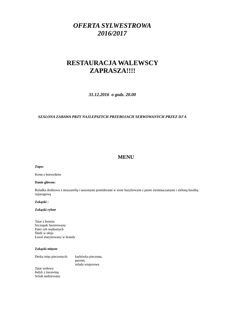 OFERTA SYLWESTROWA 2016/2017 RESTAURACJA WALEWSCY ZAPRASZA!!!! 31.12.2016 o godz. 20.00 SZALONA ZABAWA PRZY NAJLEPSZYCH PRZEBOJACH SERWOWANYCH PRZEZ DJ'A MENU Zupa: Krem z borowików Danie główne: Roladka drobiowa z mozzarellą i suszonymi pomidorami w sosie bazyliowym z puree ziemniaczanymi i zieloną fasolką szparagową Zakąski : Zakąski rybne Tatar z łososia Szczupak faszerowany Pater ryb wędzonych Śledź w oleju Łosoś marynowany w brandy Zakąski mięsne Deska mięs pieczonych: Tatar wołowy Indyk z żurawiną Schab nadziewany karkówka pieczona, pasztet, rolada wieprzowa Sałatki i sery Półmisek serów Sałatka z marynowaną wołowiną i buraczkami konserowymi Sałatka z łososiem z morelą i słonecznikiem Antipasti ( oliwki, suszone pomidory itp. ) Ogórki w sosie chili Sałatka z gruszką marynowaną w sosie żurawinowym Marynaty Desery Ciastka bankietowe Owoce Ciastka francuskie Dania na ciepło serwowane po obiedzie: 22.00 Udka kacze z kluskami śląskimi oraz jarski gulasz z cukinii 1.00 Udka z kurcząt nadziewane pieczarkami oraz golonki pieczone w piwie 3.00 Barszcz Flaki wołowe Napoje, woda, soki, kawa, herbata – bez ograniczeń Wódka , wino, piwo, whisky – bez ograniczeń Szampan – butelka na cztery osoby Cena : 290 pln / osoba Możliwość rezerwacji pokoi. Dla naszych gości sylwestrowych Hotel – 210 pln Dworek – 195 pln Ceny obejmują śniadanie.