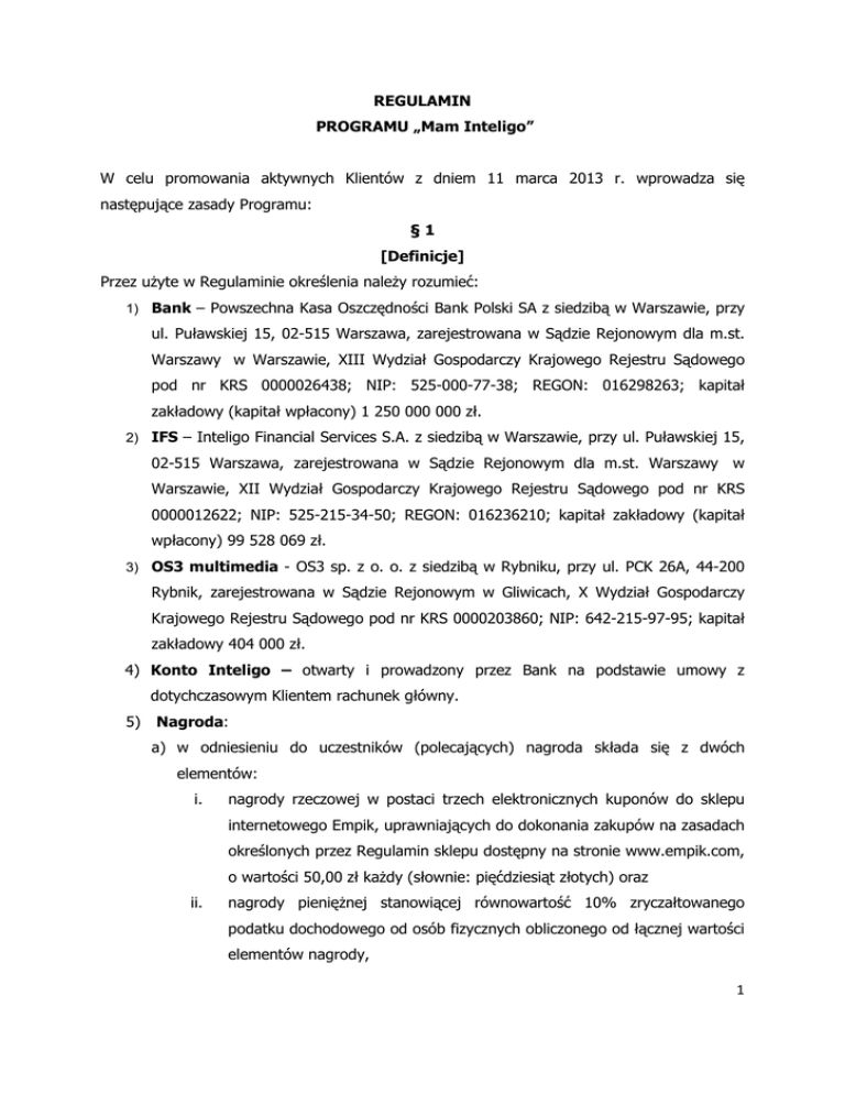 REGULAMIN PROGRAMU „Mam Inteligo” W celu promowania aktywnych Klientów z dniem 11 marca 2013 r. wprowadza się następujące zasady Programu: §1 [Definicje] Przez użyte w Regulaminie określenia należy rozumieć: 1) Bank – Powszechna Kasa Oszczędności Bank Polski SA z siedzibą w Warszawie, przy ul. Puławskiej 15, 02-515 Warszawa, zarejestrowana w Sądzie Rejonowym dla m.st. Warszawy w Warszawie, XIII Wydział Gospodarczy Krajowego Rejestru Sądowego pod nr KRS 0000026438; NIP: 525-000-77-38; REGON: 016298263; kapitał zakładowy (kapitał wpłacony) 1 250 000 000 zł. 2) IFS – Inteligo Financial Services S.A. z siedzibą w Warszawie, przy ul. Puławskiej 15, 02-515 Warszawa, zarejestrowana w Sądzie Rejonowym dla m.st. Warszawy w Warszawie, XII Wydział Gospodarczy Krajowego Rejestru Sądowego pod nr KRS 0000012622; NIP: 525-215-34-50; REGON: 016236210; kapitał zakładowy (kapitał wpłacony) 99 528 069 zł. 3) OS3 multimedia - OS3 sp. z o. o. z siedzibą w Rybniku, przy ul. PCK 26A, 44-200 Rybnik, zarejestrowana w Sądzie Rejonowym w Gliwicach, X Wydział Gospodarczy Krajowego Rejestru Sądowego pod nr KRS 0000203860; NIP: 642-215-97-95; kapitał zakładowy 404 000 zł. 4) Konto Inteligo – otwarty i prowadzony przez Bank na podstawie umowy z dotychczasowym Klientem rachunek główny. 5) Nagroda: a) w odniesieniu do uczestników (polecających) nagroda składa się z dwóch elementów: i. nagrody rzeczowej w postaci trzech elektronicznych kuponów do sklepu internetowego Empik, uprawniających do dokonania zakupów na zasadach określonych przez Regulamin sklepu dostępny na stronie www.empik.com, o wartości 50,00 zł każdy (słownie: pięćdziesiąt złotych) oraz ii. nagrody pieniężnej stanowiącej równowartość 10% zryczałtowanego podatku dochodowego od osób fizycznych obliczonego od łącznej wartości elementów nagrody, 1 b) w odniesieniu do nowych Klientów (polecanych) nagroda składa się z nagrody rzeczowej w postaci dwóch elektronicznych kuponów do sklepu internetowego Empik, uprawniających do dokonania zakupów na zasadach określonych przez Regulamin sklepu dostępny na stronie www.empik.com o wartości 50,00 zł każdy (słownie: pięćdziesiąt złotych) 6) Nagrody specjalne – dodatkowe nagrody przeznaczone dla uczestników, przyznawane na zasadach określonych w § 4 Regulaminu, składające się z dwóch elementów: a) nagrody rzeczowej w postaci: i. Telewizor 3D SAMSUNG UE55ES6800 ii. Kino domowe SAMSUNG HT d6750w iii. Konsola SONY Playstation 3 Super Slim 500 GB Niebieski + 2 kontrolery b) nagrody pieniężnej stanowiącej równowartość 10% zryczałtowanego podatku dochodowego od osób fizycznych obliczonego od łącznej wartości otrzymanych przez uczestnika elementów nagrody specjalnej. 7) nowy Klient– osoba, która: - w dniu przystąpienia do Programu nie posiada Konta Inteligo ani nie jest wobec niej rozpatrywany złożony przed przystąpieniem do Programu wniosek o otwarcie pierwszego Konta Inteligo, oraz - w czasie trwania Programu: a) wejdzie na stronę maminteligo.pl i przejdzie z tej strony na wniosek o otwarcie pierwszego Konta Inteligo oraz wypełni go podając w nim spersonalizowany kod promocyjny otrzymany od dotychczasowego Klienta lub b) złoży wniosek o otwarcie pierwszego Konta Inteligo przez serwis telefoniczny Inteligo i w czasie składania wniosku poda kod promocyjny otrzymany od dotychczasowego Klienta, c) spełni pozostałe warunki określone w niniejszym Regulaminie uprawniające do otrzymania Nagrody. 8) pierwsze Konto Inteligo – Konto Inteligo (indywidualne, wspólne lub firmowe) otwarte w czasie trwania Programu, z wykorzystaniem kodu promocyjnego, jako pierwsze Konto Inteligo dla nowego Klienta. 9) Program „Mam Inteligo”- program, którego zasady określa Regulamin. 2 10) Uczestnik Programu (polecający) – osoba fizyczna, która na dzień rozpoczęcia przystąpienia do Programu jest posiadaczem albo współposiadaczem Konta Inteligo biorąca udział w Programie. 11) kod promocyjny – indywidualny kod polecenia, który otrzymają wszyscy uczestnicy po wyrażeniu zgody na przesyłanie informacji handlowych drogą elektroniczną, który zostanie przesłany na adres e-mail widniejący w danych uczestnika posiadanych przez Bank, z tym że w przypadku kont wspólnych indywidualny kod promocyjny otrzyma każdy ze współposiadaczy. 12) Uczestnik otrzymuje swój indywidualny kod promocyjny na adres e-mail zarejestrowany w Banku, przy czym jeśli uczestnik jest współposiadaczem konta wspólnego każdy ze współposiadaczy otrzyma indywidualny kod promocyjny. Nagrody przyznawane będą nowym Klientom, pod warunkiem spełnienia przez nich warunków otrzymania nagrody, przy czym w przypadku konta wspólnego nagroda będzie przyznawana dla każdego współposiadacza oddzielnie pod warunkiem spełnienia przez niego warunków otrzymania nagrody. §2 [Zasady Programu] 1. Organizatorem Programu jest Bank. 2. Program jest organizowany na obszarze Rzeczypospolitej Polskiej. 3. Program polega na przyznaniu nagrody uczestnikowi oraz nowemu Klientowi na warunkach określonych w niniejszym Regulaminie.. 4. Program przeznaczony jest dla osób fizycznych, które w chwili ustalania przez organizatora prawa do nagrody będą posiadały Konto Inteligo i spełniają łącznie poniższe warunki: 1) w przypadku uczestników: a) na dzień przystąpienia do Programu są posiadaczami albo współposiadaczami Konta Inteligo, b) wyraziły zgodę na przetwarzanie swoich danych osobowych do celów marketingowych oraz na przesyłanie informacji handlowych drogą elektroniczną , c) podały do wiadomości Banku swój adres e-mail, d) polecą nowemu Klientowi Konto Inteligo, na zasadach określonych w niniejszym Regulaminie, 3 e) zarejestrują się w Programie na stronie maminteligo.pl i zaakceptują Regulamin Programu, 2) w przypadku nowych Klientów: a) otworzyły pierwsze Konto Inteligo w czasie trwania Programu, wskazując jako os