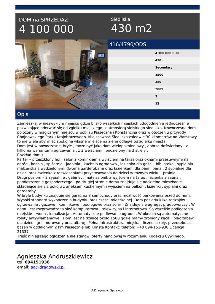 Siedliska DOM na SPRZEDAŻ 430 m2 4 100 000 416/4790/ODS 4 100 000 PLN 430 Secondary 1500 380 2009 2 12 Opis Zamieszkaj w niezwykłym miejscu gdzie blisko wszelkich miejskich udogodnień a jednocześnie pozwalające oderwać się od zgiełku miejskiego, z atmosferą sielskiego siedliska. Nowoczesne dom położony w magicznym miejscu w pobliżu Piaseczna i Konstancina oraz w otoczeniu przyrody Chojnowskiego Parku Krajobrazowego. Miejscowość Siedliska zaledwie 30 kilometrów od Warszawy to nie wiele aby mieć spokojne własne miejsce na ziemi odległe od zgiełku miasta. Dom jest w nowoczesnej bryle , może być jako dom wielopokoleniowy , dobrze doświetlony , z kilkoma wariantami ogrzewania , z 3 wejściami i podzielony na 3 strefy . Rozkład domu Parter – przeszklony hol , salon z kominkiem z wyjściem na taras oraz oknami przesuwnymi na ogród , kochia , spiżarnia , jadalnia , kuchnia ogrodowa , łazienka dla gości , biblioteka , sypialnia małżeńska z wydzielonymi dwoma garderobami oraz łazienkami dla pani i pana , 2 sypialnie dla dzieci oraz łazienka z rozwiązaniami przystosowania do dzieci w różnym wieku , pralnia . Drugi poziom – 2 sypialnie , gabinet , mały salonik z wyjściem na taras , łazienka z sauną , pomieszczenie gospodarczego , po drugiej stronie domu znajduje się oddzielne mieszkanie składające się z z pokoju z aneksem kuchennym i wyjściem na balkon , łazienki , sypialni oraz garderoby . W bryle budynku znajduje się garaż na 3 samochody oraz możliwość parkowania przed domem. Wysoki standard wykończenia budynku oraz części mieszkalnej. Dom posiada kilka rodzajów ogrzewania : gazowe , kominkowe , podłogowe oraz solar . Znajduje się agregat prądotwórczy . W domu jest rozprowadzona sieć komputerowa , telewizyjna i internetowa. Są wszelkie podłączenia miejskie – woda , kanalizacja . Automatyczne podlewanie ogrodu . W oknach są automatyczne rolety antywłamaniowe . Dom jest na działce około 1500 gdzie mamy zrobiony kącik i plac zabaw dla dziec , grill murowany oraz altanę . Pełna infrastruktura miejska - liczne szkoły, przedszkola, basen w oddalonym 2 km Piasecznie lub Konsta Kontakt: telefon: +48 694-151-938 Licencja: 21337 Treść niniejszego ogłoszenia nie stanowi oferty handlowej w rozumieniu Kodeksu Cywilnego. Agnieszka Andruszkiewicz tel. 694151938 email: [email protected] A.Drągowski Sp. z o.o. A.Drągowski Sp. z o.o. Powered by TCPDF (www.tcpdf.org)