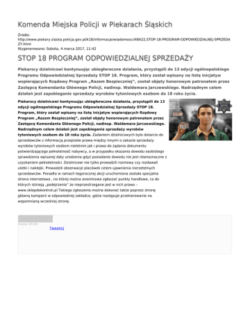 Komenda Miejska Policji w Piekarach Śląskich Źródło: http://www.piekary.slaska.policja.gov.pl/k18/informacje/wiadomosci/48422,STOP-18-PROGRAM-ODPOWIEDZIALNEJ-SPRZEDA ZY.html Wygenerowano: Sobota, 4 marca 2017, 11:42 STOP 18 PROGRAM ODPOWIEDZIALNEJ SPRZEDAŻY Piekarscy dzielnicowi kontynuując ubiegłoroczne działania, przystąpili do 13 edycji ogólnopolskiego Programu Odpowiedzialnej Sprzedaży STOP 18. Program, który został wpisany na listę inicjatyw wspierających Rządowy Program „Razem Bezpieczniej”, został objęty honorowym patronatem przez Zastępcę Komendanta Głównego Policji, nadinsp. Waldemara Jarczewskiego. Nadrzędnym celem działań jest zapobieganie sprzedaży wyrobów tytoniowych osobom do 18 roku życia. Piekarscy dzielnicowi kontynuując ubiegłoroczne działania, przystąpili do 13 edycji ogólnopolskiego Programu Odpowiedzialnej Sprzedaży STOP 18. Program, który został wpisany na listę inicjatyw wspierających Rządowy Program „Razem Bezpieczniej”, został objęty honorowym patronatem przez Zastępcę Komendanta Głównego Policji, nadinsp. Waldemara Jarczewskiego. Nadrzędnym celem działań jest zapobieganie sprzedaży wyrobów tytoniowych osobom do 18 roku życia. Zadaniem dzielnicowych było dotarcie do sprzedawców z informacją przepisów prawa między innymi o zakazie sprzedaży wyrobów tytoniowych osobom nieletnim jak i prawa do żądania dokumentu potwierdzającego pełnoletność nabywcy, a w przypadku okazania dowodu osobistego sprawdzenia wpisanej daty urodzenia gdyż posiadanie dowodu nie jest równoznaczne z uzyskaniem pełnoletności. Dzielnicowi nie tylko prowadzili rozmowy czy rozdawali ulotki i naklejki. Prowadzili obserwacje placówek celem ujawnienia nierzetelnych sprzedawców. Ponadto w ramach tegorocznej akcji uruchomiona została specjalna strona internetowa , na której można anonimowo zgłaszać punkty handlowe, co do których istnieją „podejrzenia” że nieprzestrzegane jest w nich prawo – www.sklepdokontroli.pl Takiego zgłoszenia można dokonać także poprzez stronę główną kampanii w odpowiedniej zakładce, gdzie następuje przekierowanie na wspomnianą wcześniej stronę. Ocena: 0/5 (0) Tweetnij