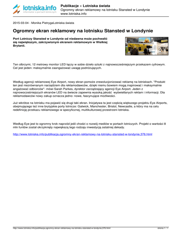Publikacje » Lotniska świata Ogromny ekran reklamowy na lotnisku Stansted w Londynie www.lotniska.info 2015-03-04 - Monika PietrygaLotniska świata Ogromny ekran reklamowy na lotnisku Stansted w Londynie Port Lotniczy Stansted w Londynie od niedawna może pochwalić się największym, zakrzywionym ekranem reklamowym w Wielkiej Brytanii. Ten olbrzymi, 12 metrowy monitor LED łączy w sobie dzieło sztuki z najnowocześniejszym przekazem cyfrowym. Cel jest jeden: maksymalnie zaangażować uwagę podróżujących. Według agencji reklamowej Eye Airport, nowy ekran pomoże zrewolucjonizować reklamę na lotniskach. "Produkt ten jest niezrównanym narzędziem dla reklamodawców, dzięki niemu bowiem mogą inspirować i maksymalnie angażować odbiorców"- mówi Sarah Parkes, dyrektor zarządzający agencji Eye Airport. Jeden z najnowocześniejszych ekranów LED na świecie zapewnia wysoką jakość wyświetlanych reklam i informacji. Dla reklamodawców nowy zakup oznacza jedno: nowe, fascynujące możliwości. Już wkrótce na lotnisku ma pojawić się drugi taki ekran. Inicjatywa ta jest częścią większego projektu Eye Airports, obejmującego też inne brytyjskie porty lotnicze: Gatwick, Manchester, Bristol, Newcastle, a który ma na celu redefinicję przekazu reklamowego w specyficznej, multikulturowej przestrzeni lotniska. Według Eye jest to ogromny krok naprzód jeśli chodzi o rozwój mediów w portach lotniczych. Projekt o wartości 8 mln funtów został okrzyknięty największą tego rodzaju inwestycją ostatniej dekady. http://www.lotniska.info/publikacja,ogromny-ekran-reklamowy-na-lotnisku-stansted-w-londynie,376.html http://www.lotniska.info/publikacja,ogromny-ekran-reklamowy-na-lotnisku-stansted-w-londynie,376.html Powered by TCPDF (www.tcpdf.org) strona 1 / 1