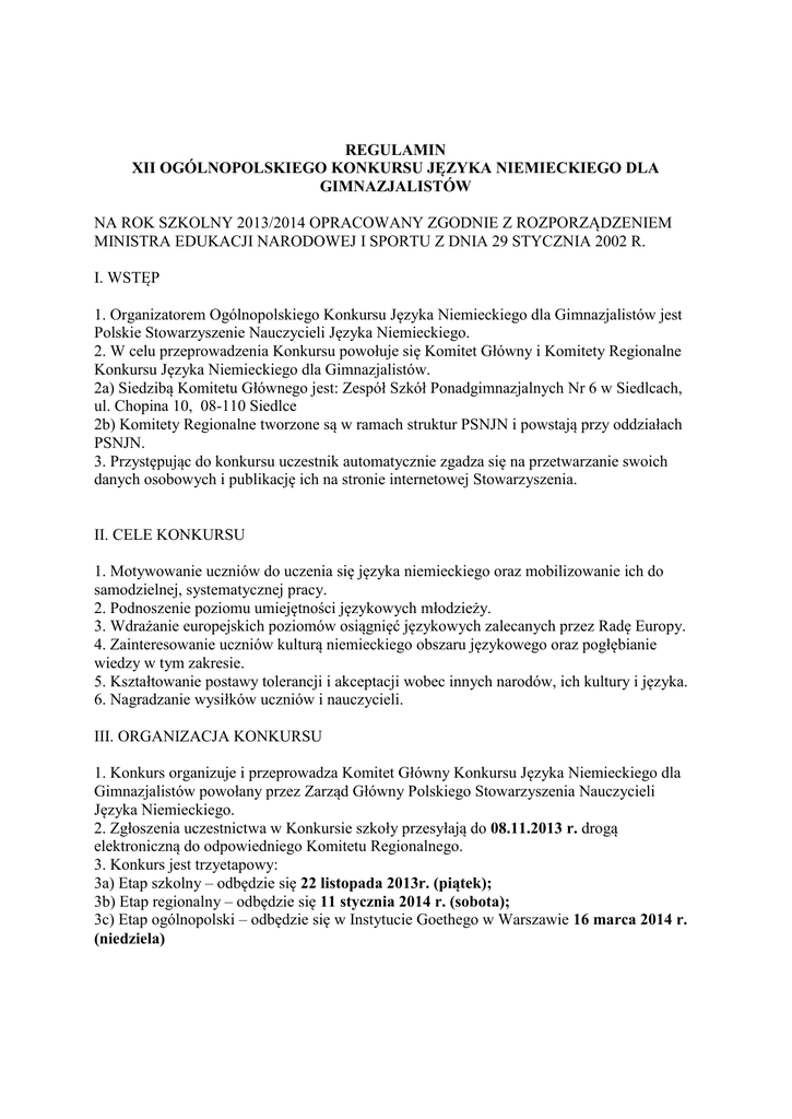 REGULAMIN XII OGÓLNOPOLSKIEGO KONKURSU JĘZYKA NIEMIECKIEGO DLA GIMNAZJALISTÓW NA ROK SZKOLNY 2013/2014 OPRACOWANY ZGODNIE Z ROZPORZĄDZENIEM MINISTRA EDUKACJI NARODOWEJ I SPORTU Z DNIA 29 STYCZNIA 2002 R. I. WSTĘP 1. Organizatorem Ogólnopolskiego Konkursu Języka Niemieckiego dla Gimnazjalistów jest Polskie Stowarzyszenie Nauczycieli Języka Niemieckiego. 2. W celu przeprowadzenia Konkursu powołuje się Komitet Główny i Komitety Regionalne Konkursu Języka Niemieckiego dla Gimnazjalistów. 2a) Siedzibą Komitetu Głównego jest: Zespół Szkół Ponadgimnazjalnych Nr 6 w Siedlcach, ul. Chopina 10, 08-110 Siedlce 2b) Komitety Regionalne tworzone są w ramach struktur PSNJN i powstają przy oddziałach PSNJN. 3. Przystępując do konkursu uczestnik automatycznie zgadza się na przetwarzanie swoich danych osobowych i publikację ich na stronie internetowej Stowarzyszenia. II. CELE KONKURSU 1. Motywowanie uczniów do uczenia się języka niemieckiego oraz mobilizowanie ich do samodzielnej, systematycznej pracy. 2. Podnoszenie poziomu umiejętności językowych młodzieży. 3. Wdrażanie europejskich poziomów osiągnięć językowych zalecanych przez Radę Europy. 4. Zainteresowanie uczniów kulturą niemieckiego obszaru językowego oraz pogłębianie wiedzy w tym zakresie. 5. Kształtowanie postawy tolerancji i akceptacji wobec innych narodów, ich kultury i języka. 6. Nagradzanie wysiłków uczniów i nauczycieli. III. ORGANIZACJA KONKURSU 1. Konkurs organizuje i przeprowadza Komitet Główny Konkursu Języka Niemieckiego dla Gimnazjalistów powołany przez Zarząd Główny Polskiego Stowarzyszenia Nauczycieli Języka Niemieckiego. 2. Zgłoszenia uczestnictwa w Konkursie szkoły przesyłają do 08.11.2013 r. drogą elektroniczną do odpowiedniego Komitetu Regionalnego. 3. Konkurs jest trzyetapowy: 3a) Etap szkolny – odbędzie się 22 listopada 2013r. (piątek); 3b) Etap regionalny – odbędzie się 11 stycznia 2014 r. (sobota); 3c) Etap ogólnopolski – odbędzie się w Instytucie Goethego w Warszawie 16 marca 2014 r. (niedziela) IV. PRZEBIEG KONKURSU A. Ustalenia ogólne 1. W konkursie mogą uczestniczyć uczniowie gimnazjów, uczący się języka niemieckiego w szkole lub poza szkołą. 2. Zawody etapu szkolnego i regionalnego przeprowadzone będą w formie pisemnej, zawody etapu ogólnopolskiego w formie pisemnej i ustnej. 3. Do zawodów etapu regionalnego zakwalifikowani zostaną uczniowie, którzy uzyskali co najmniej 75% punktów możliwych do zdobycia w etapie szkolnym. 4. Do zawodów etapu ogólnopolskiego zakwalifikowani zostaną uczniowie, którzy uzyskali najwyższą liczbę punktów w etapie regionalnym w skali całego kraju. 5. Nie przewiduje się żadnych terminów dodatkowych poszczególnych etapów. 6. Komitet Główny Konkursu Języka Niemieckiego dla Gimnazjalistów może podjąć inne decyzje dotyczące progów kwalifikacyjnych do poszczególnych etapów zawodów, jeżeli zaistnieją ku temu powody. B. Etap szkolny (22.11.2013 - piątek) 1. Etap szkolny organizuje i przeprowadza Szkolna Komisja Konkursu Języka Niemieckiego dla Gimnazjalistów składająca się z minimum 2 nauczycieli, w tym nauczyciela języka niemieckiego. 2. Dopuszcza się tworzenie międzyszkolnych komisji konkursowych w celu przeprowadzenia eliminacji szkolnych. 3. Test na etapie szkolnym sprawdza i ocenia Szkolna Komisja Konkursu Języka Niemieckiego dla Gimnazjalistów: 3a) Test składa się z części leksykalno-gramatycznej i części sprawdzającej rozumienie tekstu czytanego. 3b) Zadania nie wykraczają poza poziom A2 wg europejskich poziomów osiągnięć językowych zalecanych przez Radę Europy (załączniki nr 1 ). 4. Szkoły, które zgłosiły uczestnictwo w Konkursie, otrzymują od Komitetu Regionalnego test przesłany pocztą elektroniczną. 5. Czas trwania eliminacji szkolnych: 60 minut. 6. Praca nie może być pisana ołówkiem i nie wolno używać korektora. 7. Każda praca powinna być sprawdzona, oceniona i czytelnie podpisana przez sprawdzającego – członka Szkolnej Komisji Konkursu Języka Niemieckiego dla Gimnazjalistów. 8. Protokół zbiorczy należy przesłać drogą elektroniczną do właściwego Komitetu Regionalnego w nieprzekraczalnym terminie do 29. listopada 2013 r. Protokół powinien zawierać listę wszystkich uczestników z uzyskaną przez nich ilością punktów. 9. Komitet Regionalny ustala listę uczestników zakwalifikowanych do etapu regionalnego najpóźniej do 08.12.2013 r.. C. Etap regionalny (14.01.2013 - sobota) 1. Eliminacje regionalne przeprowadzają Komitety Regionalne powołane przez Komitet Główny Konkursu Języka Niemieckiego dla Gimnazjalistów. 2. Komitet Regionalny zawiadamia szkoły drogą elektroniczną o zakwalifikowaniu uczniów do etapu regionalnego w terminie do 13 grudnia 2013 r. 3. Uczestnicy etapu regionalnego wnoszą opłatę w wysokości 8 zł przeznaczoną na realizację zadań związanych z organizacją etapu regionalnego i ogólnopolskiego. 4. Komitet Główny przygotowuje na etap regionalny testy sprawdzające wiadomości i umiejętności uczniów w zakresie sprawności językowych i realioznawstwa. Tegoroczna edycja konkursu dotyczyć będzie realioznawstwa Niemiec. Zadania mogą wykraczać poza poziom A2. 5. Czas trwania eliminacji regionalnych: 90 minut. 6. Praca nie może być pisana ołówkiem i nie wolno używać korektora. 7. Komitet Regionalny sporządza protokół z przebiegu zawodów i przesyła go do Komitetu Głównego Konkursu do dnia 19 stycznia 2014 r. oraz publikuje go na stronie internetowej oddziału regionalnego PSNJN. 8. Komitet Główny zatwierdza wyniki zawodów etapu regionalnego i ustala listę osób zakwalifikowanych do etapu ogólnopolskiego. Do etapu ogólnopolskiego zakwalifikują się uczestnicy z najwyższą liczbą punktów. Liczba uczestników etapu ogólnopolskiego zostanie ustalona przez Komitet Główny. 9. Lista uczestników zakwalifikowanych do etapu ogólnopolskiego zostaje op