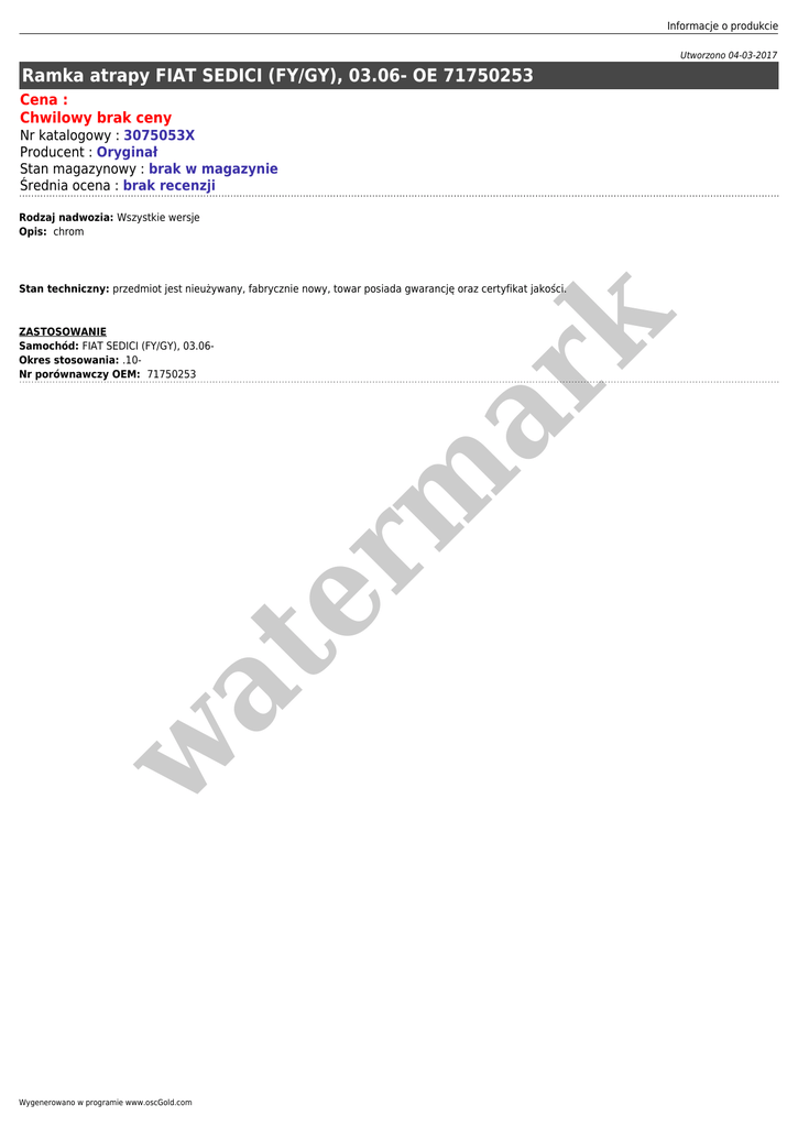 Informacje o produkcie Utworzono 04-03-2017 Ramka atrapy FIAT SEDICI (FY/GY), 03.06- OE 71750253 Cena : Chwilowy brak ceny Nr katalogowy : 3075053X Producent : Oryginał Stan magazynowy : brak w magazynie Średnia ocena : brak recenzji Rodzaj nadwozia: Wszystkie wersje Opis: chrom w at ZASTOSOWANIE Samochód: FIAT SEDICI (FY/GY), 03.06Okres stosowania: .10Nr porównawczy OEM: 71750253 er m ar k Stan techniczny: przedmiot jest nieużywany, fabrycznie nowy, towar posiada gwarancję oraz certyfikat jakości. Wygenerowano w programie www.oscGold.com