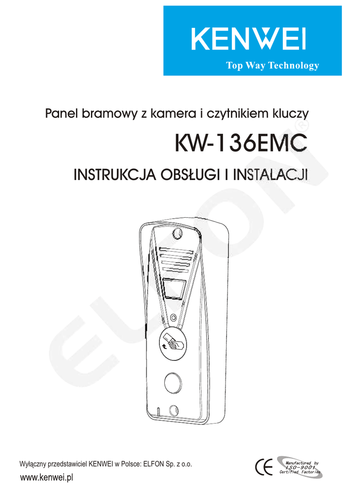 Panel bramowy z kamera i czytnikiem kluczy KW-136EMC INSTRUKCJA OBSŁUGI I INSTALACJI Wyłączny przedstawiciel KENWEI w Polsce: ELFON Sp. z o.o. Uwagi wstępne Przed podłączeniem i użytkowaniem urządzenia prosimy o dokładne zapoznanie się z niniejszą Instrukcją Obsługi i Instalacji. Importer nie odpowiada za uszkodzenia mogące wyniknąć z nieprawidłowego montażu czy eksploatacji urządzenia oraz za dokonywanie samodzielnych napraw i modyfikacji. Nie wolno otwierać obudowy. W razie potrzeby należy skontaktować się z Serwisem. Wszelkie zmiany ustawień wewnątrz urządzenia należy zlecać tylko wykwalifikowanemu personelowi. Zaleca się stosowanie akcesoriów przewidzianych do użytkowania przez Importera. Charakterystyka ogólna - trwała wandaloodporna obudowa wykonana ze stopów cynku - dyskretna pinholowa kamera - przetwornik kamery CCD o dużej czułości - zapewnia dźwięk i obraz wysokiej jakości - podświetlanie kamery diodami IR - czytnik elektronicznych kluczy zbliżeniowych - prosty, natynkowy montaż - niewielkie rozmiary 60.5mm 36mm 1 2 9 10 157.5mm 4 5 11 6 12 7 1 8 Gumowa podkładka Śruby mocujące Klucz imbusowy 1.śruby mocujące 2.głośnik 4.diody podświetlenia IR 5.obiektyw kamery 6.czytnik kluczy elektronicznych Śruby montażowe Kołki rozporowe Klucz elektroniczny w postaci breloka 7.przycisk wywołania 8.mikrofon 9.regulacja wzmocnienia głośnika panelu 10.przełączniki czytnika 11.dioda sygnalizująca czytnika czerwona/zielona 12.regulacja wzmocnienia mikrofonu panelu W przypadku złej jakości dźwięku należy dokonać regulacji za pomocą potencjometrów 9 i 12. Zlecaj montaż i instalacje tylko wykwalifikowanemu personelowi, gdyż nieprawidłowe ustawienie wzmocnień może znacznie pogorszyć jakość dźwięku. strona 2 84mm 6mm 1.Wyciągnij przewody z puszki w ścianie. Wywierć otwory w pionowej osi puszki w odległości od siebie 84 mm, jak pokazano na rysunku. Pamiętaj że kamera panelu bramowego powinna się znajdować na wysokości 150-160cm od podłoża. 2.Przeciągnij przewody panelu bramowego przez daszek montażowy i gumową podkładkę, a następnie połącz przewody zgodnie ze schematem montażowym 3.Schowaj nadmiar przewodów w puszce montażowej. Przykręć daszek montażowy do powierzchni za pomocą kołków rozporowych. Następnie przykręć panel do daszka używając klucza imbusowego. Uwaga! Puszka instalacyjna nie jest dołączona do panelu bramowego można stosować dowolną puszkę o szerokości nie przekraczającej 60mm. 4.Opcjonalnie panel bramowy występuje z podkładką montażową mocującą panel pod kątem 30 stopni do powierzchni. Montaż w przypadku użycia podkładki wykonuje się tak samo jak opisano powyżej z tą różnicą, że daszek przykręcamy do podkładki. strona 6 Zbliż brelok serwisowy do czytnika Zbliż (nowy) brelok użytkownika do czytnika Zbliż brelok serwisowy do czytnika 3. Kasowanie breloków serwisowych. 3.1 Ustaw przełącznik 3 w pozycji OFF pozostałe przełączniki pozostaw w pozycji ON. Przerwij zasilanie panelu bramowego na kilka sekund. Po ponownym włączeniu zasilania usłyszysz długi sygnał brzęczka, a dioda mignie raz na czerwono. Wszystkie breloki serwisowe zostały skasowane. 3.2 Aby zakończyć kasowanie ustaw wszystkie przełączniki w pozycję ON i przerwij zasilanie panelu bramowego na kilka sekund. Dioda zaświeci się na zielono po ponownym zasileniu. Ustaw przełącznik 3 w pozycji OFF ON 1 2 3 4 Odłącz zasilanie czytnika na kilka sek. następnie ponownie podłącz Ustaw przełącznik 3 w pozycji ON ON 1 2 3 4 OFF Odłącz zasilanie czytnika na kilka sek. następnie ponownie podłącz OFF 4. Kasowanie breloków użytkownika 4.1 Ustaw przełącznik 2 w pozycji OFF pozostałe przełączniki pozostaw w pozycji ON. Przerwij zasilanie panelu bramowego na kilka sekund. Po ponownym włączeniu zasilania usłyszysz długi sygnał brzęczka, a dioda mignie raz na czerwono. Wszystkie breloki użytkownika zostały skasowane. 4.2 Aby zakończyć kasowanie ustaw wszystkie przełączniki w pozycję ON i przerwij zasilanie panelu bramowego na kilka sekund. Dioda zaświeci się na zielono po ponownym zasileniu. Ustaw przełącznik 2 w pozycji OFF ON 1 2 3 4 Odłącz zasilanie czytnika na kilka sek. następnie ponownie podłącz Ustaw przełącznik 2 w pozycji ON ON 1 2 3 4 OFF Odłącz zasilanie czytnika na kilka sek. następnie ponownie podłącz OFF 5. Kasowanie wszystkich breloków 5.1 Ustaw przełącznik 1 w pozycji OFF pozostałe przełączniki pozostaw w pozycji ON. Przerwij zasilanie panelu bramowego na kilka sekund. Po ponownym włączeniu zasilania usłyszysz długi sygnał brzęczka, a dioda mignie raz na czerwono. Wszystkie breloki(serwisowe i użytkownika) zostały skasowane. 5.2 Aby zakończyć kasowanie ustaw wszystkie przełączniki w pozycję ON i przerwij zasilanie panelu bramowego na kilka sekund. Dioda zaświeci się na zielono po ponownym zasileniu. Ustaw przełącznik 1 w pozycji OFF ON 1 2 3 4 OFF Ustaw przełącznik 1 w pozycji ON Odłącz zasilanie czytnika na kilka sek. następnie ponownie podłącz ON 1 2 3 4 Odłącz zasilanie czytnika na kilka sek. następnie ponownie podłącz OFF 6. Otwieranie drzwi za pomocą breloka użytkownika Zbliż brelok użytkownika do czytnika, poprawny odczyt potwierdzony zostanie zaświeceniem się diody na czerwono, i długim sygnałem brzęczka. Elektrozaczep zwolniony zostanie na czas 3 sekund. Po tym czasie dioda znowu zaświeci się na zielono, sygnalizując stan gotowości. Błędny odczyt lub nieprawidłowy brelok zasygnalizowany zostanie trzema krótkimi sygnałami brzęczka i trzykrotnym mignięciem diody na czerwono. Uwagi: Tylko breloki użytkownika mogą otwierać drzwi. Breloki serwisowe służą tylko do wczytywania nowych breloków użytkownika. Wczytanie nowego breloka użytkownika punkt 2 nie wymaga demontażu panelu bramowego, jeśli posiadamy brelok serwisowy. strona 4 Obsługa Montaż modułu kame
