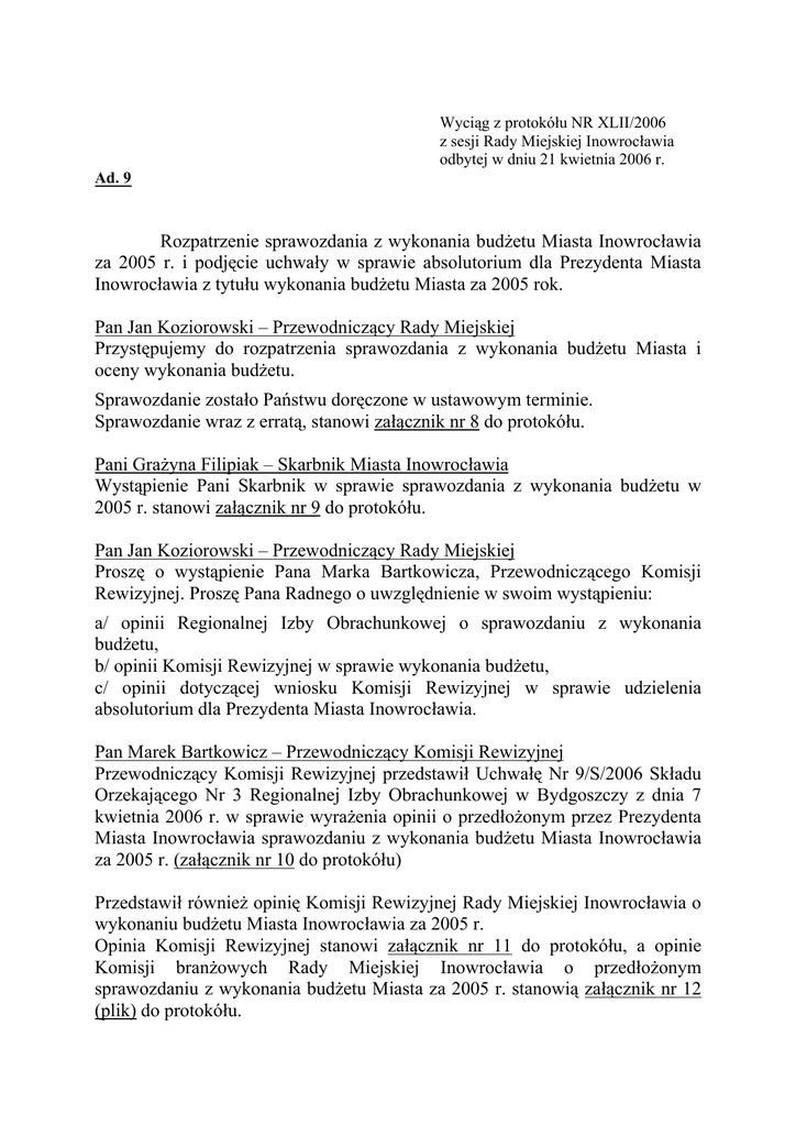 Wyciąg z protokółu NR XLII/2006 z sesji Rady Miejskiej Inowrocławia odbytej w dniu 21 kwietnia 2006 r. Ad. 9 Rozpatrzenie sprawozdania z wykonania budżetu Miasta Inowrocławia za 2005 r. i podjęcie uchwały w sprawie absolutorium dla Prezydenta Miasta Inowrocławia z tytułu wykonania budżetu Miasta za 2005 rok. Pan Jan Koziorowski – Przewodniczący Rady Miejskiej Przystępujemy do rozpatrzenia sprawozdania z wykonania budżetu Miasta i oceny wykonania budżetu. Sprawozdanie zostało Państwu doręczone w ustawowym terminie. Sprawozdanie wraz z erratą, stanowi załącznik nr 8 do protokółu. Pani Grażyna Filipiak – Skarbnik Miasta Inowrocławia Wystąpienie Pani Skarbnik w sprawie sprawozdania z wykonania budżetu w 2005 r. stanowi załącznik nr 9 do protokółu. Pan Jan Koziorowski – Przewodniczący Rady Miejskiej Proszę o wystąpienie Pana Marka Bartkowicza, Przewodniczącego Komisji Rewizyjnej. Proszę Pana Radnego o uwzględnienie w swoim wystąpieniu: a/ opinii Regionalnej Izby Obrachunkowej o sprawozdaniu z wykonania budżetu, b/ opinii Komisji Rewizyjnej w sprawie wykonania budżetu, c/ opinii dotyczącej wniosku Komisji Rewizyjnej w sprawie udzielenia absolutorium dla Prezydenta Miasta Inowrocławia. Pan Marek Bartkowicz – Przewodniczący Komisji Rewizyjnej Przewodniczący Komisji Rewizyjnej przedstawił Uchwałę Nr 9/S/2006 Składu Orzekającego Nr 3 Regionalnej Izby Obrachunkowej w Bydgoszczy z dnia 7 kwietnia 2006 r. w sprawie wyrażenia opinii o przedłożonym przez Prezydenta Miasta Inowrocławia sprawozdaniu z wykonania budżetu Miasta Inowrocławia za 2005 r. (załącznik nr 10 do protokółu) Przedstawił również opinię Komisji Rewizyjnej Rady Miejskiej Inowrocławia o wykonaniu budżetu Miasta Inowrocławia za 2005 r. Opinia Komisji Rewizyjnej stanowi załącznik nr 11 do protokółu, a opinie Komisji branżowych Rady Miejskiej Inowrocławia o przedłożonym sprawozdaniu z wykonania budżetu Miasta za 2005 r. stanowią załącznik nr 12 (plik) do protokółu. Następnie Przewodniczący Komisji Rewizyjnej przedstawił Uchwałę NR 9/Kr/2006 Składu Orzekającego Nr 3 Regionalnej Izby Obrachunkowej w Bydgoszczy z dnia 7 kwietnia 2006 r. dotyczącą zaopiniowania wniosku Komisji Rewizyjnej w sprawie udzielenia absolutorium dla Prezydenta Miasta Inowrocławia za 2005 r. Uchwała stanowi załącznik nr 13 do protokółu. Pan Jan Koziorowski – Przewodniczący Rady Miejskiej Przystępujemy do dyskusji nad przedstawionym sprawozdaniem. Czy ktoś z Państwa chciałby zabrać głos odnośnie przedstawionego, a doręczonego Państwu miesiąc temu, sprawozdania z wykonania budżetu? Pan Ryszard Rosiński – Radny Rady Miejskiej Chciałbym zauważyć, że mało brakowało, a doszłoby do złamania prawa. Zgodnie z przepisami prawa, sprawozdanie z wykonania budżetu, nie może być przyjmowane przez niemą sesją Rady Gminy. Tak stanowią przepisy prawa. Nie ma chętnych do zabrania głosu w tak ważnej sprawie dla mieszkańców Inowrocławia. Po raz ostatni w tej kadencji Rady Miejskiej podejmujemy debatę i próbę oceny budżetu. Już więcej, w tym składzie Rady Miejskiej, nie będziemy mieli okazji rozmawiać na tak poważne tematy, najważniejsze dla miasta Inowrocławia. Byłem przez sekundę, bardzo zdziwiony i zaskoczony tą absolutną ciszą na sesji Rady Miejskiej, kiedy padło pytanie, czy ktoś chce zabrać głos w dyskusji. Wobec takiej sytuacji, ja chciałbym zabrać głos w dyskusji nad przedłożonym sprawozdaniem w imieniu Klubu Radnych SLD i UP. Budżet 2005 r. był jednym z trudniejszych budżetów. Szczęśliwie się złożyło, że udało się nam jako Miastu, uzyskać określone środki finansowe zewnętrzne pochodzące ze zintegrowanego operacyjnego programu rozwoju regionalnego na skutek złożonych wniosków. Te środki zasiliły budżet Miasta Inowrocławia W przeciwnym razie, byłby problem z pełną realizacją budżetu, choć nadal jest jeszcze pewien problem. Twierdzę z przekonaniem, że tzw. „słupki” w budżecie Miasta Inowrocławia są zgodne z przepisami prawa finansowego, samorządowego, z uchwałą budżetową. Zostały też pozytywnie ocenione przez Skład Orzekający Regionalnej Izby Obrachunkowej w Bydgoszczy. Podstawą do udzielenia lub nie udzielenia absolutorium Prezydentowi Miasta, nie może być jednak wyłącznie ocena samego sprawozdania. Rozpatrzenie sprawozdania, to nie to samo, co ocena wykonania budżetu. Akcentuję tu wyrok Najwyższego Sądu Administracyjnego w Katowicach z 24 marca 1997 r. Już wtedy, te tematy były postrzegane nieco inaczej niż to zostało sformułowane w końcowym protokóle Komisji Rewizyjnej Rady Miejskiej Inowrocławia oraz w opinii Regionalnej Izby Obrachunkowej w Bydgoszczy, która wyłącznie odnosi się do treści sprawozdania. Nie odnosi się natomiast do treści merytorycznych, jaką jest wykonanie budżetu Miasta Inowrocławia. Jak można uznać wykonanie budżetu za pozytywne w rozumieniu cytowanego przeze mnie wyroku NSA z 1997 r., skoro ponad 6 mln zł. wydatków nie wygasających przenieśliśmy decyzją z grudnia 2005 r. na 2006 rok. Nie znaczy to wcale, że uda się je w ten sposób wykorzystać. Podczas pracy w Komisji Budżetu i Finansów, mieliśmy już okazję dowiedzieć się, że niektóre terminy z tych wydatków wygasających już minęły, a zadania nie zostały zrealizowane. Zatem w związku z zasadami prawa finansowego, środki takie muszą być wprowadzone do następnego budżetu, czyli do 2006 r. W związku z tym, nie jest możliwe uznanie, że budżet 2005 r. w zakresie opisanym w tym załączniku na ponad 6 mln zł., został zrealizowany. Przed chwilą usłyszeliśmy z ust Pani Skarbnik, że w 2005 r. przygotowano kwotę 1.234.000 zł. na remonty starej substancji mieszkaniowej w Inowrocławiu. Problem ten jest wieloletni, bardzo trudny, wymagający intensywnych, stałych działań przez każdy Samorząd. Pani Skarbnik powiedziała później, że 1