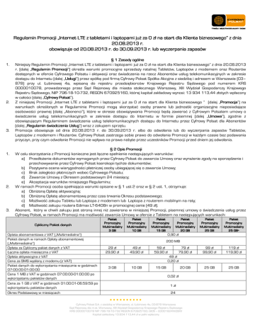 Regulamin Regulamin Promocji „Internet „Internet LTE z tabletami i laptopami już za 0 zł na start dla Klienta biznesowego” biznesowego” z dnia 20.08 20.08.2013 .08.2013 r. obowiązuje od 20.08 20.08.2013 .08.2013 r. do 30.09.2013 30.09.2013 r. lub wyczerpania zapasów 1. 2. 3. 1. 2. 3. § 1 Zasady ogólne Niniejszy Regulamin Promocji „Internet LTE z tabletami i laptopami już za 0 zł na start dla Klienta biznesowego” z dnia 20.08.2013 r. (dalej „Regulamin Regulamin Promocji”) Promocji określa warunki promocyjne sprzedaży ratalnej Tabletów, Laptopów z modemem oraz Routerów dostępnych w ofercie Cyfrowego Polsatu i aktywacji oraz świadczenia na rzecz Abonentów usług telekomunikacyjnych w zakresie dostępu do Internetu (dalej „Usługi Usługi”) Usługi przez spółkę pod firmą Cyfrowy Polsat Spółka Akcyjna z siedzibą i adresem w Warszawie (03– 878) przy ul. Łubinowej 4a, wpisaną do rejestru przedsiębiorców Krajowego Rejestru Sądowego pod numerem KRS 0000010078, prowadzonego przez Sąd Rejonowy dla miasta stołecznego Warszawy, XIII Wydział Gospodarczy Krajowego Rejestru Sądowego, NIP 796-18-10-732, REGON 670925160, której kapitał zakładowy wynosi: 13 934 113,44 złotych wpłacony w całości (dalej „Cyfrowy Cyfrowy Polsat”). Polsat Z niniejszej Promocji „Internet LTE z tabletami i laptopami już za 0 zł na start dla Klienta biznesowego ” (dalej „Promocja Promocja”) Promocja na warunkach określonych w Regulaminie Promocji mogą skorzystać osoby prawne lub jednostki organizacyjne nieposiadające osobowości prawnej (dalej „Abonenci”), które w okresie obowiązywania Promocji będą zawierać z Cyfrowym Polsatem umowy o świadczenie usług telekomunikacyjnych w zakresie dostępu do Internetu w formie pisemnej (dalej „Umowa Umowa”), Umowa zgodnie z obowiązującym Regulaminem świadczenia usług telekomunikacyjnych dostępu do Internetu przez Cyfrowy Polsat dla Abonentów (dalej „Regulamin Regulamin świadczenia Usług”) Usług wraz z zakupem sprzętu. Promocja obowiązuje od dnia 20.08.2013 r. do 30.09.2013 r. albo do odwołania lub do wyczerpania zapasów Tabletów, Laptopów z modemem i Routerów. Cyfrowy Polsat zastrzega sobie prawo do odwołania Promocji w każdym czasie bez podawania przyczyn, przy czym odwołanie Promocji nie wpływa na prawa nabyte przez uczestników Promocji przed dniem jej odwołania. § 2 Opis Promocji W celu skorzystania z Promocji konieczne jest łączne spełnienie następujących warunków: a) Przedłożenie dokumentów wymaganych przez Cyfrowy Polsat do zawarcia Umowy oraz wyrażenie zgody na sporządzenie i przechowywanie przez Cyfrowy Polsat kserokopii tychże dokumentów; b) Pozytywna ocena wiarygodności płatniczej osoby ubiegającej się o zawarcie Umowy; c) Brak zaległości płatniczych wobec Cyfrowego Polsatu; d) Zawarcie Umowy z Okresem podstawowym 24 miesięcy; e) Akceptacja warunków niniejszego Regulaminu; W ramach Promocji osoba spełniająca warunki opisane w § 1 ust 2 oraz w § 2 ust. 1, otrzymuje: a) Obniżoną Opłatę aktywacyjną; b) Obniżoną Opłatę abonamentową przez czas trwania Okresu podstawowego; c) Możliwość zakupu Tabletu lub Laptopa z modemem lub Laptopa z routerem mobilnym na raty; d) Możliwość zakupu routera Edimax LT-6408n w promocyjnej cenie (49 zł). Abonent, który w chwili zakupu jest stroną innej niż zawierana w niniejszej Promocji, pisemnej umowy o świadczenia usług przez Cyfrowy Polsat, w ramach Promocji ma możliwość zawarcia Umowy w ofercie z Tabletem na następujących warunkach: Cykliczny Pakiet danych Oplata abonamentowa z VAT („Multimedialna”) Pakiet danych w ramach Opłaty abonamentowej („Multimedialna”) Opłata za Cykliczny pakiet danych z VAT Łączna opłata miesięczna z VAT Opłata aktywacyjna z VAT Cena za SMS wysłany z modemu (z VAT) Pakiet danych do wykorzystania miesięcznie w godzinach 07:00:00-01:00:00 Cena 1 MB z VAT w godzinach 07:00:00-01:00:00 po wykorzystaniu pakietów danych Cena za 1 GB z VAT w godzinach 01:00:01-06:59:59 po wykorzystaniu pakietów danych Okres Podstawowy w miesiącach Pakiet Promocyjny Multimedialny 3 GB Pakiet Promocyjny Multimedialny 10 GB Pakiet Promocyjny Promocyjny Multimedialny 15 GB Pakiet Promocyjny Multimedialny 20 GB Pakiet Promocyjny Multimedialny 25 GB Pakiet Promocyjny Multimedialny 25 GB 99 zł 99,90 zł 119 zł 119,90 zł 25 GB 25 GB 6) 0,90 zł 200 MB 29 zł 29,90 zł 49 zł 49,90 zł 59 zł 59,90 zł 79 zł 79,90 zł 49 zł 0,20 zł 3 GB 10 GB 15 GB 20 GB 0,02 zł 1 zł 24 Cyfrowy Polsat S.A. z siedzibą w Warszawie, ul. Łubinowa 4a, 03-878 Warszawa Sąd Rejonowy dla m.st. Warszawy, XIII Wydział Gospodarczy Krajowego Rejestru Sądowego KRS 0000010078 NIP 796-18-10-732 REGON 670925160, GIOŚ – E0001824WZBW Kapitał zakładowy 13.934.113,44 zł w pełni wpłacony Cena Tabletu Samsung Galaxy Tab 8.9 LTE Cena Tabletu Huawei MediaPad 10.1 LTE 150 Cena Tabletu Samsung Galaxy Tab II 7.0 P3100 Dostępna liczba rat do wyboru dla Tabletu Samsung Galaxy Tab. 8.9 LTE Dostępna liczba rat do wyboru dla Tabletu Huawei MediaPad 10.1 LTE 150 Dostępna liczba rat do wyboru dla Tabletu Samsung Galaxy Tab II 7.0 P3100 Opłata początkowa dla Tabletu Samsung Galaxy Tab 8.9 LTE Opłata początkowa dla Tabletu Huawei MediaPad 10.1 LTE 150 Opłata początkowa dla Tabletu Samsung Galaxy Tab II 7.0 P3100 1 440 zł 1 980 zł 1 080 zł 8) 8) 8) od 9 do 37 od 12 do 37 od 9 do 37 0 zł 7) 0 zł 7) 0 zł 7) Kategorie ruchu bez limitu / dodatkowy limit wysłanych i odebranych danych do wykorzystania na określone kategorie ruchu. nie wliczane do limitu pakietu danych. 3) Cykliczny pakiet danych 3 GB 10 GB 15 GB 20 GB Bez limitu Halo, www.cyfrowypolsat.pl - Serwisy społecznościowe Bez limitu - Przeglądanie stron www 25 GB 25 GB 3) 3) Bez limitu 3) IPLA, HBO GO 3 GB 5 GB5) Bez limitu3) Wideo Darmowe Noce Brak2) BEZPŁATNIE Pakiet 50 GB do wykorzystania w godzinach 01:00:01-06:59:59. Nie doty