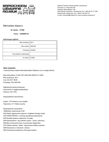 Mojsiuk Centrum Samochodów Używanych Szczecin ul. Pomorska 88 Koszalin Stare Bielice 128 Samochody Osobowe / Dostawcze: tel: (+48) 94 34 77 356 Samochody Ciężarowe: tel: (+48) 91 48 08 715 e-mail: [email protected], www.uzywane.mojsiuk.pl Mercedes klasa-s Nr oferty: 27296 Cena: 164900PLN Informacje ogólne: Rok produkcji: 2011 Moc silnika: 258 KM Przebieg: 203000 Typ pojazdu osobowego: Nr oferty: 27296 Opis pojazdu: Autoryzowany dealer Mercedes-Benz Mojsiuk ma w swojej ofercie: Mercedes-Benz S 350 CDI (256 KM) 4MATIC LONG Rok produkcji: 2011 I rej. 04.2011 ROK Przebieg: 203 000 KM Ogłoszenie grzecznościowe. samochód w ciągłej eksploatacji. Faktura VAT 23% Wyposażenie samochodu: Lakier: 775 Srebrny iryd metalik Tapicerka: 211 Skóra czarny Wyposażenie opcjonalne Reflektory ksenonowe 0,00 223 Elektr.regulowane oparcia i zagłówki kanapy tylnej 230 PARKTRONIC z funkcją asystenta parkowania 236 Światła dzienne włączone na stałe 249 Samościemn. się lusterko wewn. i zewn. kierowcy 260 Bez oznaczenia typu na pokrywie bagażnika 275 Pakiet pamięci, elektr. regulowane fotele przednie 289 Kierownica w drewnie i skórze 294 Poduszka powietrzna chroniąca kolana 401 Klimatyzowane fotele przednie (nawiew i ogrzew.) 414 Dach szklany sterowany elektrycznie 427 Automatyczna skrzynia biegów (7) 474 Filtr cząstek stałych 477 Układ sygnalizacji spadku ciśnienia w oponach 481 Osłona silnika 538 Attention Assist 540 Sterowana elektrycznie roleta szyby tylnej 573 Mocowanie fotelika dziecięcego z tyłu - ISOFIX 581 Komfortowa klimatyzacja THERMOTRONIC 58U podsufitka materiałowa - szara 600 Ciśnieniowe spryskiwacze reflektorów 682 Montaż gaśnicy 690 Koło dojazdowe (minispare) 814 Zmieniarka płyt DVD (x6), MP3 876 Oświetlenie AMBIENTE 883 Automatyczne domykanie drzwi 968 Dokument COC B12 Zestaw narzędzi D0A Gaśnica D0C Handling Mercedes-Benz D0D Transport do dealera H15 Wykoń. wnętrza w ciemnym drewnie eukaliptusowym K11 Adaptacyjne światła hamowania (migające) P35 Pakiet oświetlenia 608 Automatyczne sterowanie światłami drogowymi 622 ILS - Inteligentne reflektory bi-ksenonowe P48 Pakiet komfortowych przednich foteli 432 Aktywny fotel kierowcy i pasażera 436 Komfortowe zagłówki kierowcy i pasażera P54 Pakiet przeciwkradzieżowy 551 Alarm antywłamaniowy (EDW) 882 Zabezpieczenie wnętrza pojazdu P70 Pakiet Nawigacji 513 System rozpoznawania znaków drogowych 527 COMAND APS z systemem multimedialnym R96 18-calowe obręcze kół z matali lekkich 5-ramienne U01 Wskaźnik zapięcia pasów tylnych U12 Dywaniki welurowe U60 Ochrona pieszych Bezwypadkowy Serwisowany Zadbany Jeden właściciel Niniejsze ogłoszenie jest wyłącznie informacją handlową i nie stanowi oferty w myśl art. 66, § 1. Kodeksu Cywilnego. Sprzedający nie odpowiada za ewentualne błędy lub nieaktualność ogłoszenia. KONTAKT HANDLOWY: TEL. 692-409-582 TEL. 795-142-622 - Jeżeli w naszej ofercie nie ma samochodu który Państwa interesuje proszę o kontakt telefoniczny pod nr tel. 795-142-622 lub przybycie do siedziby naszej firmy Mercedes-Benz Mojsiuk przy ul. Pomorskiej 88. Istnieje możliwość wyszukania indywidualnej oferty na samochód używany. 795-142-622 Jest to informacja handlowa nie stanowiąca oferty w rozumieniu prawa cywilnego, kolory na zdjęciach mogą być inne niż w rzeczywistości. Oferta nie przedstawia rzeczywistych stanów magazynowych