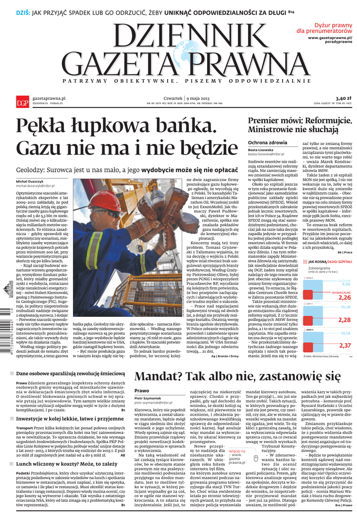 DZIŚ: JAK PRZYJĄĆ SPADEK LUB GO ODRZUCIĆ, ŻEBY UNIKNĄĆ ODPOWIEDZIALNOŚCI ZA DŁUGI B14 Dyżur prawny dla prenumeratorów www.gazetaprawna.pl/ poradyprawne P A T R Z Y M Y O B I E K T Y W N I E . gazetaprawna.pl DZIENNIK.PL P I S Z E M Y Czwartek FORSAL.PL O D P O W I E D Z I A L N I E 3,40 zł 9 maja 2013 NR 89 (3479 W2) ROK 19 ISSN 2080-6744, NR INDEKSU 348 066 Pękła łupkowa bańka. Gazu nie ma i nie będzie Geolodzy: Surowca jest u nas mało, a jego wydobycie może się nie opłacać Optymistyczne szacunki amerykańskich ekspertów z lat 2009–2011 zakładały, że pod polską ziemią kryją się gigantyczne zasoby gazu łupkowego rzędu od 3 do 5,3 bln m sześc. Dzisiaj mówi się o kilkudziesięciu miliardach metrów sześciennych. To różnica zasadnicza – gdyby sprawdził się optymistyczny scenariusz, mielibyśmy zasoby wystarczające na pokrycie krajowych potrzeb przez minimum 200 lat, przy wariancie pesymistycznym gaz skończy się po kilku latach. – Rząd zaczął budować scenariusze wzrostu gospodarczego, wymyślono fundusz pokoleń, który miałby gromadzić zyski z wydobycia, roztaczano wizje niezależności energetycznej – mówi Hubert Kiersnowski, geolog z Państwowego Instytutu Geologicznego (PIG). Sugeruje, że politycy niepotrzebnie rozbudzali nadzieje związane z eksploatacją surowca. I dodaje: – Pierwotne szacunki spowodowały nie tylko masowy napływ zagranicznych inwestorów zainteresowanych poszukiwaniami, ale także wywarły duży wpływ na działania rządu. Według niego politycy podeszli jednak do tematu zbyt optymistycznie, a teraz gazowa JACEK SZYDŁOWSKI/FORUM Michał Duszczyk [email protected] bańka pęka. Geolodzy nie ukrywają, że zasoby niekonwencjonalnego surowca są po prostu małe, a jego wydobycie będzie bardziej kosztowne niż w USA, gdzie nastąpił łupkowy boom. – Być może produkcja gazu w naszym kraju nigdy nie bę- Dane osobowe sparaliżują rewolucję śmieciową Prawo Zdaniem generalnego inspektora ochrony danych osobowych gminy wymagają od mieszkańców ujawnienia w deklaracjach śmieciowych zbyt wielu informacji. O możliwość blokowania gminnych uchwał w tej sprawie pytają już wojewodowie. Tym samym wielkie zmiany w systemie utylizacji odpadów mogą wejść w życie z dużymi komplikacjami. I po czasie. B1 Inwestycje w kolej lekkie, łatwe i przyjemne Transport Przez kilka kolejnych lat ponad połowa unijnych pieniędzy przeznaczonych dla kolei ma być zainwestowana w rewitalizacje. To upraszcza działanie, bo nie wymaga uzgodnień środowiskowych i budowlanych. Spółka PKP Polskie Linie Kolejowe w pośpiechu próbuje wydać unijne dotacje z lat 2007–2013, z których trzeba się rozliczyć do 2015 r. Z puli 20 mld zł zagrożonych jest nadal od 4 do 5 mld zł. A8 Lunch wliczony w koszty? Może, to zależy Podatki Przedsiębiorca, który chce uzyskać użyteczną inter- pretację podatkową w zakresie wydatków na lunch i spotkania biznesowe w restauracjach, musi napisać, z kim się spotyka, co zamawia i ile płaci w restauracji. Musi określić status kontrahenta i rangę restauracji. Dopiero wtedy można ocenić, czy jego koszty są wytworne i okazałe. Tak wynika z ostatniego orzeczenia NSA, który od lata zmaga się z problematyką kosztów reprezentacji. B1 dzie opłacalna – zaznacza Kiersnowski. – Według naszego pesymistycznego scenariusza mamy 34–76 mld m sześc. gazu z łupków. Te szacunki potwierdzili Amerykanie. To jednak bardzo prawdopodobne, bo wczoraj kolej- ne dwie zagraniczne firmy poszukujące gazu łupkowego ogłosiły, że wycofują się z Polski. To kanadyjski Talisman i amerykański Marathon Oil. Wcześniej zrobił to już ExxonMobil. Jak tłumaczy Paweł Pudłowski, dyrektor w Marathonie, spółka nie znalazła pokładów gazu nadających się do komercyjnej eksploatacji. Koncerny mają też inny problem. Tomasz Gryżewski z Talismanu wyjaśnia, że na decyzję o wyjściu z Polski wpływ miał również brak uregulowań sprzyjających branży wydobywczej. Według Grażyny Piotrowskiej-Oliwy, byłej prezes PGNiG i wiceprezydent Pracodawców RP, wycofanie się kolejnych firm potwierdza, że bez przepisów zachęcających i ułatwiających wydobycie trudno myśleć o sukcesie. – Prace nad regulacjami łupkowymi trwają od dwóch lat, a dotąd nie przybrały realnego kształtu. Ostatnią wersję branża zgodnie skrytykowała. W Polsce zebranie wszystkich pozwoleń i załatwienie spraw administracyjnych ciągnie się miesiącami. W USA formalności dla jednego odwiertu trwają… 21 dni. A9 | Branże i firmy CENA GAZETY (W TYM 8% VAT) Premier mówi: Reformujcie. Ministrowie nie słuchają Ochrona zdrowia Beata Lisowska [email protected] Szefowie resortów nie realizują sztandarowej reformy rządu. Nie zamierzają masowo zmieniać swoich szpitali w spółki kapitałowe. Około 50 szpitali jeszcze w tym roku przestanie funkcjonować jako samodzielne publiczne zakłady opieki zdrowotnej (SPZOZ). Wśród przekształcanych zabraknie jednak lecznic resortowych. Jest ich w Polsce 34. Rządowe SPZOZ mogą się stać samodzielnymi podmiotami, chociaż jak na razie taka decyzja zapadła jedynie w przypadku jednej placówki podległej resortowi zdrowia. W formie spółki działa szpital w Polanicy-Zdroju. I na tym reformatorskie zapędy Ministerstwa Zdrowia się zatrzymały. Jak nieoficjalnie dowiedział się DGP, żaden inny szpital należący do tego resortu nie jest obecnie szykowany do zmiany formy organizacyjno-prawnej. To oznacza, że Śląskie Centrum Chorób Serca w Zabrzu pozostanie SPZOZ. Także pozostali ministrowie nie wykazują zbyt dużego entuzjazmu dla rządowej reformy szpitali. Z 17 lecznic podlegających MSW formę prawną może zmienić tylko jedna, a i to stoi pod znakiem zapytania. Nie zapadła ostateczna decyzja w tej sprawie. – Nie przekształciliśmy dotychczas żadnego naszego szpitala i niech tak pozostanie. Jeżeli ma się to wią- zać tylko ze zmianą for