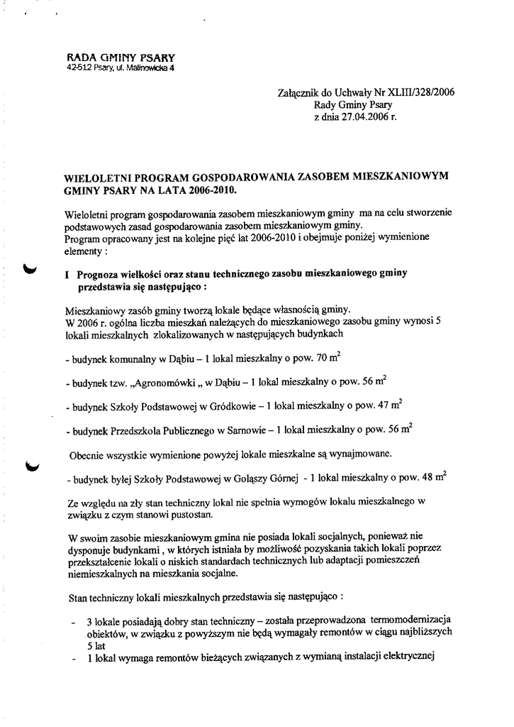 RADA GMINY PSARY 42-612 Psary, uf. Mallnowteka 4 Zalacznik do Uchwaty Nr XLIII/328/2006 Rady Gminy Psary z dnia 27.04.2006 r. WIELOLETNI PROGRAM GOSPODAROWANIA ZASOBEM MIESZKANIOWYM GMINY PSARY NA LATA 2006-2010. Wieloletni program gospodarowania zasobem mieszkaniowym gminy ma na celu stworzenie podstawowych zasad gospodarowania zasobem mieszkaniowym gminy. Program opracowany jest na kolejne pie_c lat 2006-2010 i obejmuje ponizej wymienione elementy : I Prognoza ivielkosci oraz staiiu technicznego zasobu mieszkaniowego gminy przedstawia sif nastfpujqco: Mieszkaniowy zasob gminy tworza^ lokale bedace wlasnoscia^ gminy. W 2006 r. ogolna liczba mieszkan nalezacych do mieszkaniowego zasobu gminy wynosi 5 lokali mieszkalnych zlokalizowanych w naste_pujacych budynkach - budynek komunalny w Dabiu - 1 lokal mieszkalny o pow. 70 m - budynek tzw. ,,Agronom6wki „ w Dabiu - 1 lokal mieszkalny o pow. 56 m - budynek Szkoly Podstawowej w Grodkowie - 1 lokal mieszkalny o pow. 47 m2 - budynek Przedszkola Publicznego w Saraowie - 1 lokal mieszkalny o pow. 56 m2 Obecnie wszystkie wymienione powyzej lokale mieszkalne sa^wynajmowane. - budynek byiej Szkoly Podstawowej w Golaszy Gornej -1 lokal mieszkalny o pow. 48 m2 Ze wzgl^du na zly stan techniczny lokal nie spetnia wymogow lokalu mieszkalnego w zwiazku z czym stanowi pustostan. W swoim zasobie mieszkaniowym gmina nie posiada lokali socjalnych, poniewaz nie dysponuje budynkami, w ktorych istniala by mozliwosc pozyskania takich lokali poprzez przeksztalcenie lokali o niskich standardach technicznych lub adaptacji pomieszczen niemieszkalnych na mieszkania socjalne. Stan techniczny lokali mieszkalnych przedstawia si? nast?pujaco : - - 3 lokale posiadaja^dobry stan techniczny - zostala przeprowadzona termomodemizacja obiektow, w zwiazku z powyzszym nie b?da. wymagaty remontow w ci^gu najbli^szych 5 lat 1 lokal wymaga remontow bieza^cych zwiazanych z wymian^ instalacji elektrycznej -2- 1 lokal znajduja^cy si? w budynku bytej Szkohy Podstawowej w Golaszy Gornej wymaga ca&owitego remontu w zwiazku z tym planuje si?, ze wraz z budynkiem szkoh/ zostanie przeznaczony do wynaje_cia na dzialalnosc statutowa_ lub gospodarcza^ organizacji spolecznych. Prognoza wielkosci zasobu mieszkaniowego gminy w kolejnych 5 latach: ILOSC MESZKAN ILOSC MIESZKAN ILOSC MIESZKAN OGOLEM CZYNSZOWYCH SOCJALNYCH 2006 4 4 - 2007 4 4 - 2008 4 4 - 2009 4 4 - 2010 4 4 - ROK Biorac pod uwag? ograniczone mozliwosci finansowe gminy nie jest planowana budowa nowych budynkow celem zwi?kszenia zasobu lokali mieszkalnych. II. Plan remontow i modernizacji wynikaj^cy ze stanu technicznego budynkow i lokali. W latach 2006-2010 nie planuje si? znacznych remontow w lokalach mieszkalnych wchodzacych w sktad mieszkaniowego zasobu gminy. Budynki w ktorych znajduja^ si? lokale mieszkalne w cia^u ostatnich lat byhy modernizowane i sq. w dobrym stanie technicznym. W latach obj?tych programem planuje si? wymian? instalacji elektrycznej w jednym z lokali mieszkalnych. III. Planowana sprzedaz lokali. Ze wzgl?du na zbyt ograniczony zasob mieszkaniowy w kolejnych pi?ciu latach nie planuje si? sprzedazy lokali pod warunkiem ,ze obecni najemcy nie wystapia^ z wnioskiem wykupu wynajmowanych mieszkan. IV. Zasady polityki czynszowej. 1. 2. Stawke_ bazowq. czynszu za 1 m2 powierzchni uzytkowej lokalu mieszkamego ustala Wojt. Okreslajac stawk? bazowa, czynszu powierzchni uzytkowej lokali Wojt obowiazany jest do uwzgl?dniania czynnikow podwyzszaja_cych i obnizajacych wartosc uzytkowa, lokali tj. - wyposazenie budynkow i lokali w urzadzenia techniczne i instalacje - ogolny stan budynku z uwzgl?dnieniem wieku budynku. 3. Podwyzka stawek czynszu b?dzie dokonywana nie cz?sciej niz jeden raz do roku. 4. Podwyzka czynszu nie moze przekraczac 3 % wartosci odtworzeniowej lokalu w skali roku. -3- Wysokosc wskaznika przeliczeniowego kosztow odtworzenia 1 m powierzchni uzytkowej budynkow mieszkalnych ustalana jest w obwieszczeniu Wojewody Sla^skiego co 6 miesi?cy. W przypadku pozyskania lokali socjalnych stawka czynszu wynosid bedzie potow? stawki czynszu w mieszkaniowym zasobie gminy. V. Sposob i zasady zarz^dzaoia lokalami i budynkami wchodzqcymi w sklad mieszkaniowego zasqbu gminy. Gminnym zasobem nieruchomosci gospodaruje Wojt. Gospodarowanie zasobem gminnym polega mi^dzy innymi na zabezpieczaniu nieruchomosci przed uszkodzeniem lub zniszczeniem, wykonywaniu czynnosci zwiazanych z naliczaniem czynszu i windykacja tych naleznosci, wykonywanie remontow biezaj;ych i modernizacji. Mieszkania wchodzace w sklad mieszkaniowego zasobu gminy moga. bye sprzedawane najemcom lub w drodze przetargu. VI. Zrodfa finansowania gospodarki mieszkaniowej w kolejnych latacb. Podstawowym zrodlem finansowania gospodarki mieszkaniowej z przeznaczeniem na biezacq. eksploatacj? i remonty sa, wplywy z czynszow za wynajem lokali mieszkalnych i czynszow za wynajem lokali uzytkowych oraz wplywy z dzierzaw.