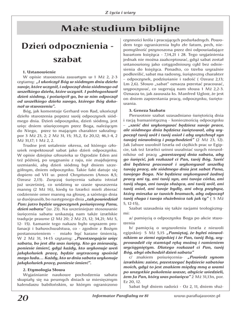 Z życia i wiary Małe studium biblijne Dzień odponienia szabat 1. Ustanowienie W opisie stwoenia zawaym w 1 Mż 2, 2-3 ytamy: „I ukońył Bóg w siódmym dniu dzieło swoje, które uynił, i odpoął dnia siódmego od wszelkiego dzieła, które uynił. I pobłogosławił dzień siódmy, i poświęcił go, bo w nim odpoął od wszelkiego dzieła swego, którego Bóg dokonał w stwoeniu”. Bóg, jak komentuje Gerhard von Rad, ukońył dzieło stwoenia popez swój odpoynek siódmego dnia. Dzień odpoynku, dzień siódmy, jest więc dniem uświęconym pez Boga, należącym do Niego, pez to mającym charakter sakralnypor 3 Mż 23, 2; 2 Mż 31, 15; 35,2, Ez 20,12; 46,1-4, 2 Mż 31,17; 1 Mż 2, 2. Trudne jest ustalenie okresu, od którego łowiek reektował sabat jako dzień odpoynku. W opisie dziejów łowieka w Ogrodzie Eden ani też później, po wygnaniu z raju, nie znajdujemy wzmianki, aby dzień siódmy był dniem szególnym, dniem odpoynku. Takie fakt datuje się dopiero od VII w. ped Chrystusem (Amos 8,5; Ozeasz 2,13). Zwyaj święcenia sabatu istniał już weśniej, co widzimy w asie uszenia manny (2 Mż 16), kiedy to Izrælici mieli zbierać codziennie omer manny na głowę, a szóstego dnia w dwójnasób, bo następnego dnia „tak powiedział Pan: jutro będzie wypoynek poświęcony Panu, dzień sabatu” (w. 23). Na weśniejsze stosowanie święcenia sabatu wskazują nam także izrælskie tradycje prawne (2 Mż 20; 2 Mż 23, 12; 34,21; Mż 5, 12- 15). Łamanie tego nakazu było wyrazem profanacji i bałwochwalstwa, co - zgodnie z Bożym postanowieniem - miało być karane śmiercią. W 2 Mż 31, 14-15 ytamy: „Pestegajcie więc sabatu, bo jest dla was święty. Kto go znieważy, poniesie śmierć, gdyż każdy, kto wykonuje weń jakąkolwiek pracę, będzie wytracony ośród mego ludu… Każdy, kto w dniu sabatu wykonuje jakąkolwiek pracę, poniesie śmierć”. 2. Etymologia Słowa Wyjaśnianie naukowe pochodzenia sabatu skupiały się na pewnych dniach w miesięnym kalendau babilońskim, w którym ograniono 20 ynności króla i pracujących podwładnych. Powodem tego ogranienia było złe fatum, pech, niepomyślność pynoszona pez dni odpowiadające kwaom księżyca - 7,14,21 i 28. Tego wyjaśnienia jednak nie można zaakceptować, gdyż sabat został ustanowiony jako cotygodniowy cykl bez odniesienia do księżyca. Ponadto, co teba wyraźnie podkreślić, sabat ma radosny, świąteny charakter – odpoynek, podziwianie i radość ( Ozeasz 2,13; Lm 2,6). Słowo „sabat” oznaa pestać pracować, wypoywać, co sugerują nam słowa 1 Mż 2,2-3. Oznaa to, jak zauważa ks. Manfred Uglo, że jest on dniem zapestania pracy, odpoynku, świętowania. 3. Geneza Szabatu Pierwotnie szabat uzasadniano świętością dnia i racją humanistyną - konienością odpoynku – „sześć dni wykonywać będziesz swoje prace, ale siódmego dnia będziesz świętował, aby wypoął twój wół i twój osioł i aby wytchnął syn twojej niewolnicy i pychodzień” (2 Mż 23, 12). Jak Jahwe uwolnił Izræla od ciężkich prac w Egipcie, tak też Izrælici winni uwalniać swych niewolników od pracy „pestegaj dnia sabatu, aby go święcić, jak rozkazał ci Pan, twój Bóg. Sześć dni będziesz pracował i wykonywał wszelką twoją pracę, ale siódmego dnia jest sabat Pana, twojego Boga. Nie będziesz wykonywał żadnej pracy ani ty, ani twój syn, ani twoja córka, ani twój sługa, ani twoja służąca, ani twój wół, ani twój osioł, ani twoje bydlę, ani obcy pybysz, który mieszka w twoich bramach, aby odpoął twój sługa i twoja służebnica tak jak ty” ( 5 Mż 5, 12-15), Szabat uzasadnia się także racjami teologinymi: a/ pamięcią o odpoynku Boga po akcie stwoenia b/ pamięcią o wyzwoleniu Izræla z niewoli egipskiej- 5 Mż 5,15 „Pamiętaj, że byłeś niewolnikiem w ziemi egipskiej i że Pan, twój Bóg, wyprowadził cię stamtąd ręką możną i ramieniem wyciągniętym. Dlatego rozkazał ci Pan, twój Bóg, abyś obchodził dzień sabatu” c/ znakiem poświęcenia- „Powiedz synom izrælskim: zaiste, pestegać będziecie sabatów moich, gdyż to jest znakiem między mną a wami po wszystkie pokolenia wasze, abyście wiedzieli, żem Ja Pan, który was poświęca” 2 Mż 31,13n, por. Ez 20, 12. Sabat był dniem radości - Oz 2, 11, dniem służ- Informator Paraalny nr 81 www.parafiajawoe.pl Z życia i wiary by dla Boga – 4 Mż 28,9n, a także poueniem o równości wszelkiego stwoenia, gdyż tego dnia miał odpoywać zarówno pan, jak i niewolnik, a nawet zwieę. W 2 Mż 23,10-11, 3 Mż 25,1-7 znajdujemy także zalecenie, by w każdym siódmym roku nie obsiewać pola, nie zbierać winorośli, gdyż ziemia ma wtedy sabat. Także co siódmy rok należy umoyć długi- 5 Mż 15,2 4. Święcenie Szabatu W Dekalogu III pykazanie – nakaz świętowania sabatu jest najbardziej rozbudowanym pykazaniem: „Pamiętaj o dniu sabatu, aby go święcić. Sześć dni będziesz pracował i wykonywał wszelką swoją pracę. Ale siódmego dnia jest sabat Pana boga twego: nie będziesz wykonywał żadnej pracy ani ty, ani twój syn, ani twoja córka, ani twój sługa, ani twoja służebnica, ani twoje bydło, ani obcy pybysz, który mieszka w twoich bramach. Gdyż w sześciu dniach uynił Pan niebo i ziemię, moe i wszystko, co w nich jest, a siódmego dnia odpoął. Dlatego Pan pobłogosławił dzień sabatu i poświęcił go.”(2 Mż 20,8-11) Pykazanie to, jak wyżej peytaliśmy, zawiera w sobie nakaz świętowania sabatu, zakaz pracy, świętość sabatu. Po powrocie z niewoli babilońskiej za asów Ezdrasza i Nehemiasza sabat stał się głównym pykazaniem Izrælitów, którego pesteganie oparli pede wszystkim na zakazie pracy. Rabini poświęcili dwa traktaty Miszny święceniu szabatu, w której wyliają 39 prac zakazanych w sabat. W Biblii ytamy m.in. o następujących zakazach dotyących tego dnia: - zakaz handlu Neh 10, 32; Neh 13, 15nn - penoszenia ciężarów Jr 17,