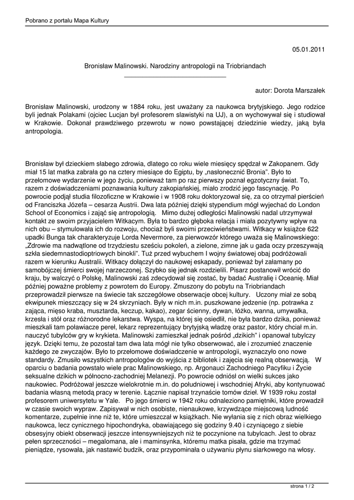 Pobrano z portalu Mapa Kultury 05.01.2011 Bronisław Malinowski. Narodziny antropologii na Triobriandach ____________________________ autor: Dorota Marszałek Bronisław Malinowski, urodzony w 1884 roku, jest uważany za naukowca brytyjskiego. Jego rodzice byli jednak Polakami (ojciec Lucjan był profesorem slawistyki na UJ), a on wychowywał się i studiował w Krakowie. Dokonał prawdziwego przewrotu w nowo powstającej dziedzinie wiedzy, jaką była antropologia. Bronisław był dzieckiem słabego zdrowia, dlatego co roku wiele miesięcy spędzał w Zakopanem. Gdy miał 15 lat matka zabrała go na cztery miesiące do Egiptu, by „nasłonecznić Bronia”. Było to przełomowe wydarzenie w jego życiu, ponieważ tam po raz pierwszy poznał egzotyczny świat. To, razem z doświadczeniami poznawania kultury zakopiańskiej, miało zrodzić jego fascynację. Po powrocie podjął studia filozoficzne w Krakowie i w 1908 roku doktoryzował się, za co otrzymał pierścień od Franciszka Józefa – cesarza Austrii. Dwa lata później dzięki stypendium mógł wyjechać do London School of Economics i zająć się antropologią. Mimo dużej odległości Malinowski nadal utrzymywał kontakt ze swoim przyjacielem Witkacym. Była to bardzo głęboka relacja i miała pozytywny wpływ na nich obu – stymulowała ich do rozwoju, chociaż byli swoimi przeciwieństwami. Witkacy w książce 622 upadki Bunga tak charakteryzuje Lorda Nevermore, za pierwowzór którego uważa się Malinowskiego: „Zdrowie ma nadwątlone od trzydziestu sześciu pokoleń, a zielone, zimne jak u gada oczy przeszywają szkła siedemnastodioptriowych binokli”. Tuż przed wybuchem I wojny światowej obaj podróżowali razem w kierunku Australii. Witkacy dołączył do naukowej eskapady, ponieważ był załamany po samobójczej śmierci swojej narzeczonej. Szybko się jednak rozdzielili. Pisarz postanowił wrócić do kraju, by walczyć o Polskę, Malinowski zaś zdecydował się zostać, by badać Australię i Oceanię. Miał później poważne problemy z powrotem do Europy. Zmuszony do pobytu na Triobriandach przeprowadził pierwsze na świecie tak szczegółowe obserwacje obcej kultury. Uczony miał ze sobą ekwipunek mieszczący się w 24 skrzyniach. Były w nich m.in. puszkowane jedzenie (np. potrawka z zająca, mięso kraba, musztarda, keczup, kakao), zegar ścienny, dywan, łóżko, wanna, umywalka, krzesła i stół oraz różnorodne lekarstwa. Wyspa, na której się osiedlił, nie była bardzo dzika, ponieważ mieszkali tam poławiacze pereł, lekarz reprezentujący brytyjską władzę oraz pastor, który chciał m.in. nauczyć tubylców gry w krykieta. Malinowski zamieszkał jednak pośród „dzikich” i opanował tubylczy język. Dzięki temu, że pozostał tam dwa lata mógł nie tylko obserwować, ale i zrozumieć znaczenie każdego ze zwyczajów. Było to przełomowe doświadczenie w antropologii, wyznaczyło ono nowe standardy. Zmusiło wszystkich antropologów do wyjścia z bibliotek i zajęcia się realną obserwacją. W oparciu o badania powstało wiele prac Malinowskiego, np. Argonauci Zachodniego Pacyfiku i Życie seksualne dzikich w północno-zachodniej Melanezji. Po powrocie odniósł on wielki sukces jako naukowiec. Podróżował jeszcze wielokrotnie m.in. do południowej i wschodniej Afryki, aby kontynuować badania własną metodą pracy w terenie. Łącznie napisał trzynaście tomów dzieł. W 1939 roku został profesorem uniwersytetu w Yale. Po jego śmierci w 1942 roku odnaleziono pamiętniki, które prowadził w czasie swoich wypraw. Zapisywał w nich osobiste, nienaukowe, krzywdzące miejscową ludność komentarze, zupełnie inne niż te, które umieszczał w książkach. Nie wyłania się z nich obraz wielkiego naukowca, lecz cynicznego hipochondryka, obawiającego się godziny 9.40 i czyniącego z siebie obsesyjny obiekt obserwacji jeszcze intensywniejszych niż te poczynione na tubylcach. Jest to obraz pełen sprzeczności – megalomana, ale i maminsynka, któremu matka pisała, gdzie ma trzymać pieniądze, rysowała, jak nastawić budzik, oraz przypominała o używaniu płynu siarkowego na włosy. strona 1 / 2 Pobrano z portalu Mapa Kultury Tropikalna pogoda i brak warunków higienicznych doprowadziły go na skraj obłędu. Wstrzykiwał sobie arszenik (popularny wówczas jako lekarstwo na słabe nerwy), by się uleczyć z wymyślonych chorób. Z drugiej jednak strony po powrocie do Europy, kiedy pisał na podstawie notatek opracowania naukowe, umiał zdobyć się na empatię wobec badanych i spoglądał na nich jak naukowiec, jako pierwszy próbował ich zrozumieć. Może notatki z dziennika pokazują, jakie koszty musiał ponieść, by tyle osiągnąć jako badacz? strona 2 / 2