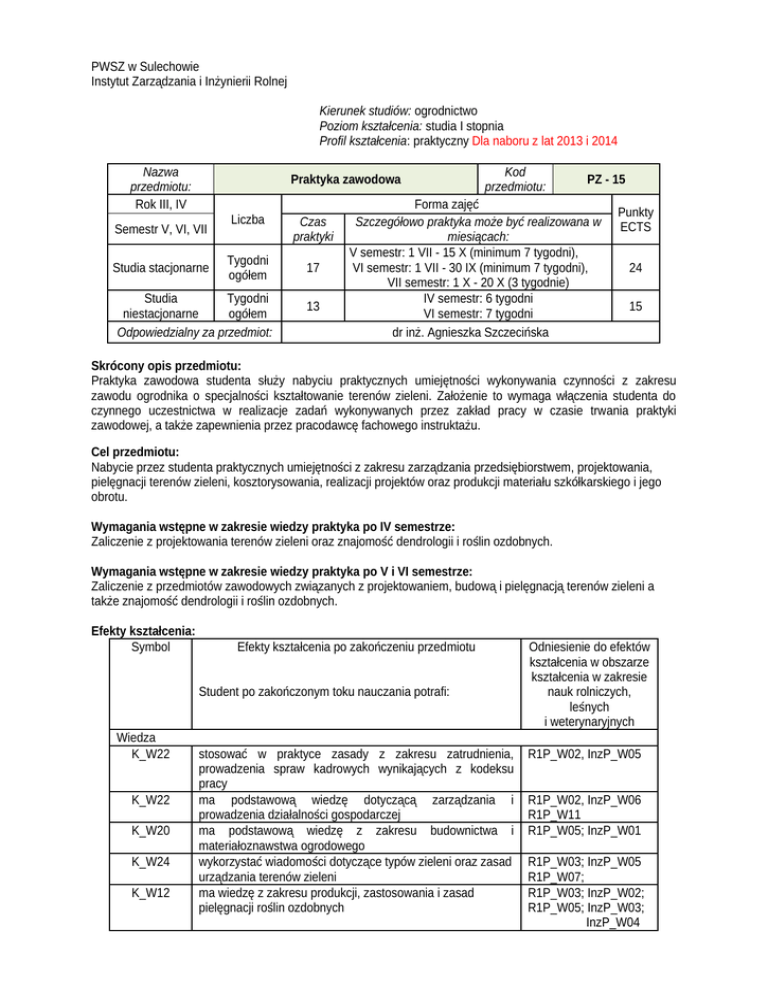 PWSZ w Sulechowie Instytut Zarządzania i Inżynierii Rolnej Kierunek studiów: ogrodnictwo Poziom kształcenia: studia I stopnia Profil kształcenia: praktyczny Dla naboru z lat 2013 i 2014 Nazwa przedmiotu: Rok III, IV Praktyka zawodowa Semestr V, VI, VII Studia stacjonarne Liczba Tygodni ogółem Studia Tygodni niestacjonarne ogółem Odpowiedzialny za przedmiot: Czas praktyki 17 13 Kod przedmiotu: PZ - 15 Forma zajęć Szczegółowo praktyka może być realizowana w miesiącach: V semestr: 1 VII - 15 X (minimum 7 tygodni), VI semestr: 1 VII - 30 IX (minimum 7 tygodni), VII semestr: 1 X - 20 X (3 tygodnie) IV semestr: 6 tygodni VI semestr: 7 tygodni dr inż. Agnieszka Szczecińska Punkty ECTS 24 15 Skrócony opis przedmiotu: Praktyka zawodowa studenta służy nabyciu praktycznych umiejętności wykonywania czynności z zakresu zawodu ogrodnika o specjalności kształtowanie terenów zieleni. Założenie to wymaga włączenia studenta do czynnego uczestnictwa w realizacje zadań wykonywanych przez zakład pracy w czasie trwania praktyki zawodowej, a także zapewnienia przez pracodawcę fachowego instruktażu. Cel przedmiotu: Nabycie przez studenta praktycznych umiejętności z zakresu zarządzania przedsiębiorstwem, projektowania, pielęgnacji terenów zieleni, kosztorysowania, realizacji projektów oraz produkcji materiału szkółkarskiego i jego obrotu. Wymagania wstępne w zakresie wiedzy praktyka po IV semestrze: Zaliczenie z projektowania terenów zieleni oraz znajomość dendrologii i roślin ozdobnych. Wymagania wstępne w zakresie wiedzy praktyka po V i VI semestrze: Zaliczenie z przedmiotów zawodowych związanych z projektowaniem, budową i pielęgnacją terenów zieleni a także znajomość dendrologii i roślin ozdobnych. Efekty kształcenia: Symbol Efekty kształcenia po zakończeniu przedmiotu Student po zakończonym toku nauczania potrafi: Wiedza K_W22 K_W22 K_W20 K_W24 K_W12 stosować w praktyce zasady z zakresu zatrudnienia, prowadzenia spraw kadrowych wynikających z kodeksu pracy ma podstawową wiedzę dotyczącą zarządzania i prowadzenia działalności gospodarczej ma podstawową wiedzę z zakresu budownictwa i materiałoznawstwa ogrodowego wykorzystać wiadomości dotyczące typów zieleni oraz zasad urządzania terenów zieleni ma wiedzę z zakresu produkcji, zastosowania i zasad pielęgnacji roślin ozdobnych Odniesienie do efektów kształcenia w obszarze kształcenia w zakresie nauk rolniczych, leśnych i weterynaryjnych R1P_W02, InzP_W05 R1P_W02, InzP_W06 R1P_W11 R1P_W05; InzP_W01 R1P_W03; InzP_W05 R1P_W07; R1P_W03; InzP_W02; R1P_W05; InzP_W03; InzP_W04 K_W08 Umiejętności K_U13 K_U16 K_U26 K_U28 uzasadnić wybór związany z zastosowaniem określonego rozwiązania technologicznego przy realizacji prac z branży zieleni R1P_W03; InzP_W02; R1P_W05; R1P_W06; tworzyć projekt wykonawczy założenia zieleni oraz specyfikację techniczną wykonania i odbioru prac z zakresu budowy i pielęgnacji terenów zieleni z uwzględnieniem zestawień materiału roślinnego tworzyć przedmiar i harmonogram prac w kolejności technologicznej stosuje zasady bezpieczeństwa i higieny pracy rozwiązuje praktyczne zadania inżynierskie na podstawie doświadczenia zdobytego w przedsiębiorstwach ogrodniczych R1P_U02; InzP_U03; R1P_U11; InzP_U05; R1P_U12; InzP_U06; InzP_U10 R1P_U01; InzP_U06; R1P_U08; R1P_U05 R1P_U08; InzP_U09; InzP_U12; Kompetencje K_K03 organizuje pracę grupy podczas powierzonych mu zadań K_K07 K_)K10 organizuje miejsce pracy odznacza się odpowiedzialnością, dokładnością i uczciwością przy realizacji zleconych zadań R1P_K02; InzP_K02; R1P_K03 R1P_K08; InzP_K02; R1P_K03; InzP_K01; R1P_K04; R1P_K05 Treści programowe: 1. Zapoznanie się studenta ze strukturą organizacyjną i podstawowymi dokumentami (aktami prawnymi) regulującymi zasady funkcjonowania zakładu pracy; 2. Przyswojenie podstawowych zasad z zakresu zatrudnienia, prowadzenia spraw kadrowych wynikających z kodeksu pracy; 3. Zapoznanie się z prowadzoną dokumentacją planistyczną i finansowo – księgową z zakresu: a) planu finansowo – ekonomicznego zakładu pracy, b) zasad prowadzonej księgowości, c) analizy kosztów, d) zasad współpracy z urzędem skarbowym, organami samorządu i sporządzaną sprawozdawczością finansową; 4. Zapoznanie się z procesem projektowania, realizacją projektów, pracami pielęgnacyjnymi zieleni oraz produkcją materiału do realizacji projektów oraz jego obrotu, a w szczególności: a) z wymogami i koniecznymi uzgodnieniami z urzędem gminy, starostwem powiatowym i innymi instytucjami na etapie projektowania i realizacji projektu, b) z zasadami wykonywania prac w zakresie małej architektury, c) z zasadami przygotowania gleby, doboru materiału szkółkarskiego, tworzenia kompozycji, itp., d) z technologią produkcji materiału szkółkarskiego, e) z zasadami przygotowania produkcji i jej sprzedaży oraz zaopatrzenia w środki do produkcji, f) z zasadami marketingu, g) z zasadami wykonywania prac związanych z zakładaniem i pielęgnacją terenów zieleni zgodnie ze sztuką ogrodniczą, h) z zasadami kosztorysowania: prac projektowych, prac związanych z budową i zakładaniem terenów zieleni oraz prac związanych z prawidłowym utrzymaniem terenów zieleni. Zaliczenie praktyki Zaliczenie praktyki odbywa się na podstawie złożonej przez studenta Karty praktyki zawodowej. Wzór Karty praktyki zawodowej określa załącznik nr 4 do Regulaminu studenckich praktyk zawodowych. Student w Karcie praktyki zawodowej dokonuje opisu przebiegu praktyki i zakresu wykonywanych podczas jej trwania obowiązków. Student ma obowiązek na bieżąco wypełniać Kartę praktyki a wpis powinien być potwierdzony na koniec każdego tygodnia przez organizatora praktyki. Organizator praktyki w Karcie praktyki zawodowej dokonuje opisowej oceny pracy studenta. Zaliczenia praktyki zawodowej dokonuje opiekun praktyk sprawujący nadzór dydaktyczno-wychowawczy nad studen