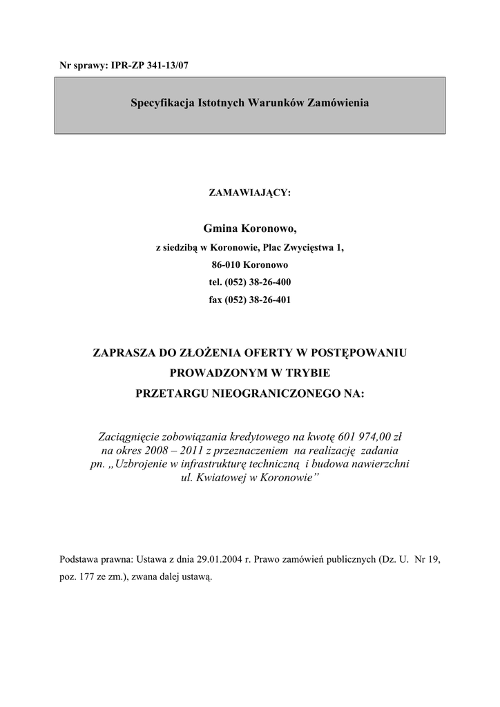 Nr sprawy: IPR-ZP 341-13/07 Specyfikacja Istotnych Warunków Zamówienia ZAMAWIAJĄCY: Gmina Koronowo, z siedzibą w Koronowie, Plac Zwycięstwa 1, 86-010 Koronowo tel. (052) 38-26-400 fax (052) 38-26-401 ZAPRASZA DO ZŁOŻENIA OFERTY W POSTĘPOWANIU PROWADZONYM W TRYBIE PRZETARGU NIEOGRANICZONEGO NA: Zaciągnięcie zobowiązania kredytowego na kwotę 601 974,00 zł na okres 2008 – 2011 z przeznaczeniem na realizację zadania pn. „Uzbrojenie w infrastrukturę techniczną i budowa nawierzchni ul. Kwiatowej w Koronowie” Podstawa prawna: Ustawa z dnia 29.01.2004 r. Prawo zamówień publicznych (Dz. U. Nr 19, poz. 177 ze zm.), zwana dalej ustawą. Spis treści I. Postanowienia ogólne. 1. Informacja o Zamawiającym 2. Osoby uprawnione do porozumiewania się z Wykonawcami. 3. Tryb udzielenia zamówienia. 4. Zasady uczestnictwa w postępowaniu. 5. Sposób porozumiewania się Zamawiającego z Wykonawcami. II. Przedmiot zamówienia i termin jego realizacji 1. Przedmiot zamówienia 2. Koszt kredytu 3. Liczba dni niezbędna do zawiadomienia o terminie i wysokości transzy kredytu. 4. Zabezpieczenie kredytu. 5. Termin realizacji zamówienia, warunki uruchomienia i terminy spłaty Kredytu. III. Warunki udziału w postępowaniu oraz dokumenty wymagane od Wykonawcy. 1. Opis warunków udziału w postępowaniu. 2. Dokumenty i oświadczenia wymagane w postępowaniu. 3. Oświadczenia oraz dokumenty potwierdzające spełnianie warunków, o których mowa w pkt III.2 przez Wykonawców krajowych. 4. Oświadczenia oraz dokumenty potwierdzające spełnianie warunków, o których mowa w pkt II.2 przez Wykonawców zagranicznych. 5. Oferta wspólna. IV. Zasady przygotowania oferty. 1. Wymogi formalne. 2. Opakowanie oferty. 3. Koszt przygotowania oferty. 4. Sposób udzielania wyjaśnień dotyczących specyfikacji. 5. Modyfikacje treści specyfikacji. 6. Sposób obliczenia ceny oferty. 7. Waluty obce. V. Tryb i zasady wyboru najkorzystniejszej oferty. 1. Tryb oceny ofert. 2. Kryteria oceny ofert. 3. Zasady oceny ofert wg ustalonych kryteriów. VI. Informacje o trybie składania i otwarcia ofert. 1. Miejsce i termin składania ofert. 2. Miejsce i termin otwarcia ofert. 3. Publiczne otwarcie ofert. 4. Termin związania ofertą. 5. Zmiana i wycofanie oferty. VII. Postanowienia dotyczące umowy. 1. Termin płatności. 2. Wzór umowy. 3. Informacja o formalnościach dotyczących zawarcia umowy. VIII. Postanowienia końcowe. 1. Ogłoszenie o wyniku postępowania. 2. Osoby po stronie Zamawiającego uczestniczące w przygotowaniu postępowania. 3. Pouczenie o środkach ochrony prawnej. 4. Inne postanowienia. 5. Wykaz załączników. Część I - Postanowienia ogólne. 1. Informacja o Zamawiającym. Gmina Koronowo ul. Plac Zwycięstwa 1 86-010 Koronowo NIP 554 25 54 358 REGON 092350665 2. Osoby uprawnione do porozumiewania się z Wykonawcami. Osobami uprawnionymi do kontaktu z Wykonawcami są: 1) w zakresie dotyczącym przedmiotu zamówienia : Aleksandra Szyszka tel. 052 38 26 413 2) w zakresie dotyczącym zagadnień formalno-prawnych : Elżbieta Szalska tel 052 38 26 459 3. Tryb udzielenia zamówienia. Postępowanie o udzielenie zamówienia publicznego prowadzone jest na podstawie przepisów ustawy z dnia 29 stycznia 2004 r. Prawo zamówień publicznych (Dz. U. Nr 19, poz. 177 ze zm.), zwaną dalej ustawą, w trybie przetargu nieograniczonego. 4. Generalne zasady uczestnictwa w postępowaniu. 1. Ofertę może złożyć podmiot uprawniony do udzielania kredytów na podstawie ustawy z dnia 29 sierpnia 1997 r. Prawo bankowe (tj. Dz. U. z 2002 r. Nr 72, poz. 665 ze zm.) oraz w niniejszej specyfikacji istotnych warunków zamówienia, zwaną dalej specyfikacją lub w skrócie SIWZ. 2. Każdy wykonawca może złożyć tylko jedną ofertę. 3. Zamawiający nie przewiduje udzielenia zamówień uzupełniających, o których mowa q art. 67 ust. 1 pkt 6 ustawy. 4. Zamawiający nie dopuszcza składania ofert wariantowych. 5. Zamawiający nie dopuszcza składania ofert częściowych. Złożenie oferty obejmującej całość przedmiotu zamówienia stanowi jeden z warunków ważności oferty. 5. Sposób porozumiewania się Zamawiającego z Wykonawcami. 1) Wszelką korespondencję do Zamawiającego związaną z niniejszym postępowaniem należy kierować na adres : Gmina Koronowo ul. Plac Zwycięstwa 1 86-010 Koronowo 2) Wszelkie dokumenty, oświadczenia, zawiadomienia, wnioski oraz informacje przekazywane są w formie pisemnej. Zamawiający dopuszcza przesyłanie oświadczeń, zawiadomień, wniosków oraz informacji w formie telefax. 3) Oświadczenia, zawiadomienia, wnioski przekazane do Zamawiającego za pomocą telefaksu uważa się za złożone w terminie, jeżeli ich treść dotrze do Zamawiającego na adres podany w pkt 5,1) specyfikacji przed upływem terminu i zostanie niezwłocznie potwierdzona na piśmie przez przekazującego. 4) Nr faxu : 052 38 26 401 5) Oferty należy złożyć w formie pisemnej pod rygorem nieważności. Część II - Przedmiot zamówienia i termin jego realizacji. 1. Przedmiot zamówienia Przedmiotem zamówienia jest pozyskanie przez Zamawiającego kredytu bankowego w kwocie 601 974,00, który zostanie spłacony w latach 2008-2011, z przeznaczeniem na realizację zadania pn. „Zaciągnięcie zobowiązania kredytowego na kwotę 601 974,00 zł na okres 2008 – 2011 z przeznaczeniem na realizację zadania pn. „Uzbrojenie w infrastrukturę techniczną i budowa nawierzchni ul. Kwiatowej w Koronowie”. Zamawiający oczekuje złożenia oferty w pełni spełniającej wymagania określone w niniejszej specyfikacji oraz zgodne z załączonym wzorem umowy, uwzględniającej w szczególności wykorzystanie Kredytu w transzach, w terminach i kwotach określonych każdorazowo przez Zamawiającego. Przedmiot zamówienia został zakwalifikowany jako numer 66130000-0 we Wspólnym Słowniku Zamówień. (CPV). Warunki udzielenia kredytu regulowane są umową kredytową, której wzór stanowi załącznik nr 2 do SIWZ.