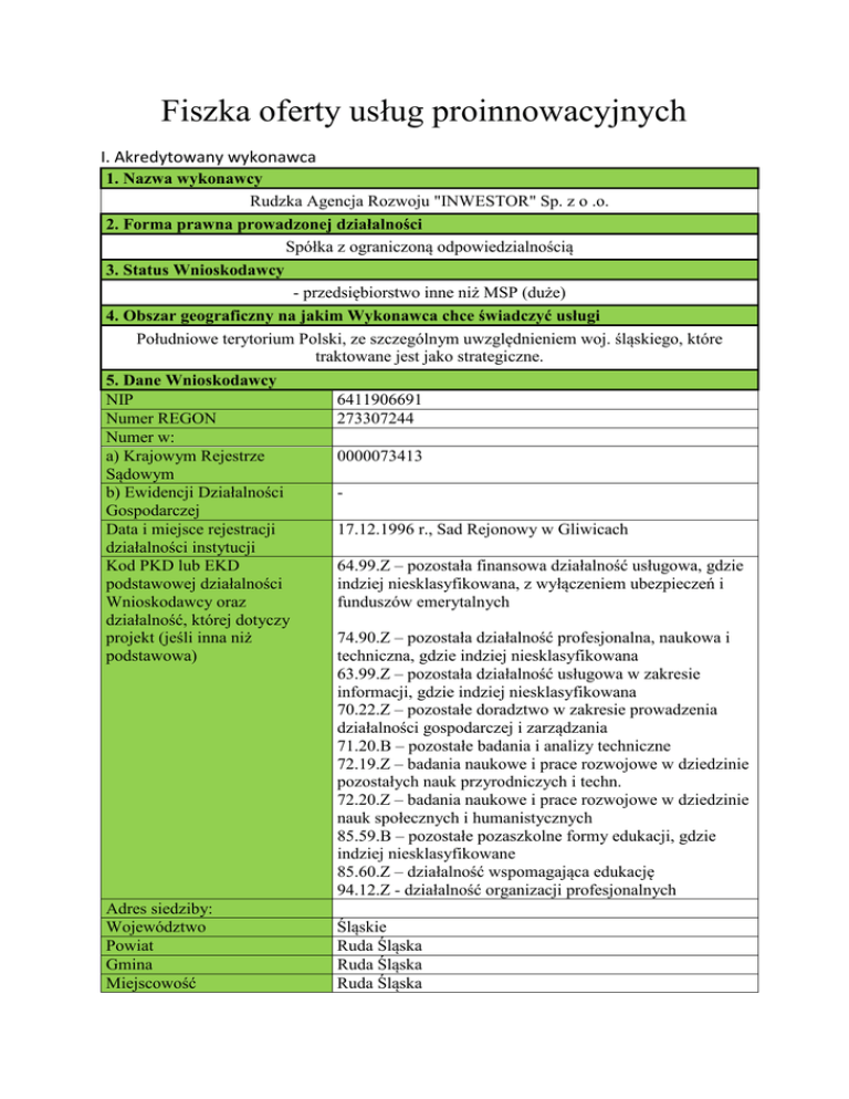 Fiszka oferty usług proinnowacyjnych I. Akredytowany wykonawca 1. Nazwa wykonawcy Rudzka Agencja Rozwoju "INWESTOR" Sp. z o .o. 2. Forma prawna prowadzonej działalności Spółka z ograniczoną odpowiedzialnością 3. Status Wnioskodawcy - przedsiębiorstwo inne niż MSP (duże) 4. Obszar geograficzny na jakim Wykonawca chce świadczyć usługi Południowe terytorium Polski, ze szczególnym uwzględnieniem woj. śląskiego, które traktowane jest jako strategiczne. 5. Dane Wnioskodawcy NIP Numer REGON Numer w: a) Krajowym Rejestrze Sądowym b) Ewidencji Działalności Gospodarczej Data i miejsce rejestracji działalności instytucji Kod PKD lub EKD podstawowej działalności Wnioskodawcy oraz działalność, której dotyczy projekt (jeśli inna niż podstawowa) Adres siedziby: Województwo Powiat Gmina Miejscowość 6411906691 273307244 0000073413 17.12.1996 r., Sad Rejonowy w Gliwicach 64.99.Z – pozostała finansowa działalność usługowa, gdzie indziej niesklasyfikowana, z wyłączeniem ubezpieczeń i funduszów emerytalnych 74.90.Z – pozostała działalność profesjonalna, naukowa i techniczna, gdzie indziej niesklasyfikowana 63.99.Z – pozostała działalność usługowa w zakresie informacji, gdzie indziej niesklasyfikowana 70.22.Z – pozostałe doradztwo w zakresie prowadzenia działalności gospodarczej i zarządzania 71.20.B – pozostałe badania i analizy techniczne 72.19.Z – badania naukowe i prace rozwojowe w dziedzinie pozostałych nauk przyrodniczych i techn. 72.20.Z – badania naukowe i prace rozwojowe w dziedzinie nauk społecznych i humanistycznych 85.59.B – pozostałe pozaszkolne formy edukacji, gdzie indziej niesklasyfikowane 85.60.Z – działalność wspomagająca edukację 94.12.Z - działalność organizacji profesjonalnych Śląskie Ruda Śląska Ruda Śląska Ruda Śląska Ulica Nr budynku Nr lokalu Kod pocztowy Numer telefonu Numer faksu Adres poczty elektronicznej Adres strony internetowej Wolności 6 41-700 32 248 77 86 32 248 77 86 [email protected] www.rarinwestor.pl II. Potencjał Wykonawcy 6. Krótka historia działalności Wykonawcy Rudzka Agencja Rozwoju "INWESTOR" Sp. z o .o. (dalej RAR) od 19 lat funkcjonuje jako Instytucja Otoczenia Biznesu. Powstała pod koniec 1996 r. na podstawie Kontraktu Regionalnego – umowy społecznej zawartej przez przeszło 60 największych organizacji i instytucji z województwa z Rządem RP celem rozwoju regionu. Głównym udziałowcami RAR są Urząd Miasta Ruda Śląska (77,92%), Fundusz Górnośląski S.A. (7,47%) i Urząd Marszałkowski Województwa Śląskiego (6,59%). Od początku funkcjonowania swoją działalność RAR zaczęła koncentrować na szeroko pojętym rozwoju lokalnym i regionalnym, w szczególności na budowaniu potencjału społeczno – gospodarczego regionu. Swoją aktywność RAR opiera na realizacji działań z zakresu m.in.: - inicjowania i organizowania przedsięwzięć wspierających rozwój istniejących oraz powstawania nowych MŚP w regionie, - udzielania pożyczek dla MŚP na inwestycje przyczyniające się do rozwoju przedsiębiorczości i innowacyjności, - aktywizacji zawodowej i integracji społecznej osób bezrobotnych oraz zagrożonych wykluczeniem społecznym, - świadczenia szeroko pojętych usług doradczych i szkoleniowych, w szczególności dla podmiotów gospodarczych, osób pozostających bez pracy oraz prowadzących bądź zamierzających uruchomić własną działalność gospodarczą. W 2003 r. RAR została członkiem - założycielem Śląskiego Konsorcjum Instytucji Wsparcia Rozwoju Przedsiębiorczości będącego siecią wsparcia rozwoju przedsiębiorczości i samozatrudnienia, transferu i komercjalizacji nowych technologii oraz poprawy konkurencyjności MŚP. Jest również jednostką Krajowego Systemu Usług dla Małych i Średnich Przedsiębiorstw przy PARP z zakresie: usług finansowych (udzielanie pożyczek), usług doradczych o charakterze ogólnym, usług szkoleniowych oraz usług informacyjnych. Oznacza to, iż spełnia odpowiednie wymogi, m.in. potencjał ekonomiczny, infrastrukturę i zasoby ludzkie. Jakość ww. usług świadczonych przez RAR potwierdza certyfikat spełniania normy PN-EN ISO 9001:2009. RAR jest m.in. laureatem i posiadaczem złotego godła w konkursie „Najwyższa Jakość Quality International 2011 w kategorii „QI Service” – usługi najwyższej jakości (usługi szkoleniowe i finansowe) oraz laureatem III edycji konkursu „Stawiamy na jakość” organizowanego przez Regionalną Izbę Gospodarczą w Katowicach. Od kilkunastu lat realizuje projekty mające na celu rozwój społeczno – gospodarczy regionu – począwszy od przedakcesyjnych programów Phare, poprzez SPO WKP, SPO RZL, ZPORR, POKL itp. Do najważniejszych projektów zrealizowanych w ciągu ostatnich lat można zaliczyć m.in.: - od 1998 r. działający do chwili obecnej Fundusz Pożyczkowy, w ramach którego zostało udzielone ponad 600 pożyczek dla mikro, małych i średnich przedsiębiorstw, - 2013-2015 r. – POKL 7.2.2 „Ośrodek Wsparcia Ekonomii Społ. Subregionu Centralnego” – wsparciem zostało objęte 3900 osób i 900 podmiotów ekonomii społecznej. Celem projektu było wzmocnienie sektora ekonomii społecznej w woj. śląskim, - 2012-2014 r. – POKL 8.2.1 „Transfer wiedzy i praktyki” we współpracy z Centrum Innowacji Transferu Technologii przy Politechnice Śląskiej – celem projektu było zwiększenie transferu wiedzy i wzmocnienia powiązań strefy B+R z przedsiębiorcami poprzez realizację 66 staży dla pracowników naukowych w przedsiębiorstwach, - 2012-2013 r. – POKL. 2.2.1 „Punkt Konsultacyjny KSU” („Zapewnienie usług z zakresu rozwoju firmy dla przedsiębiorców oraz osób zamierzających rozpocząć działalność gospodarczą w formule one-stop-shops”) – w ramach projektu udzielono ponad 1600 usług informacyjnych i 227 usług doradczych dla MŚP oraz osób planujących działalność gosp. - 2009-2014 r. 