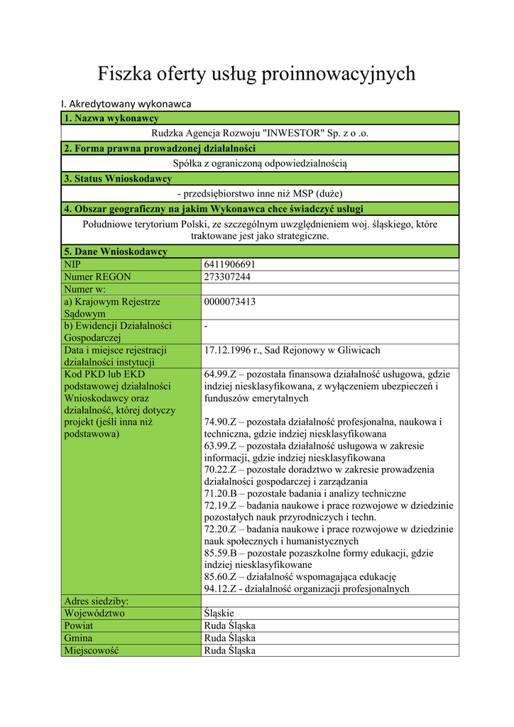 Fiszka oferty usług proinnowacyjnych RAR INWESTOR