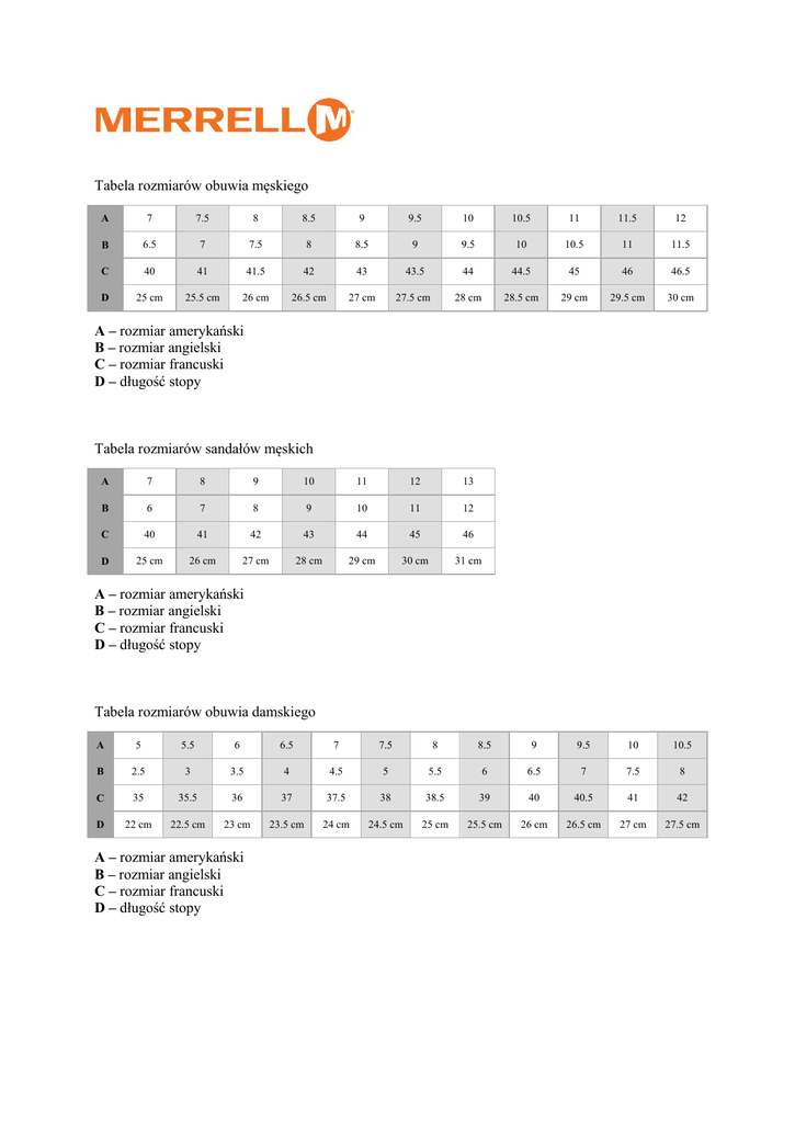 Tabela rozmiarów obuwia męskiego A 7 7.5 8 8.5 9 9.5 10 10.5 11 11.5 12 B 6.5 7 7.5 8 8.5 9 9.5 10 10.5 11 11.5 C 40 41 41.5 42 43 43.5 44 44.5 45 46 46.5 D 25 cm 25.5 cm 26 cm 26.5 cm 27 cm 27.5 cm 28 cm 28.5 cm 29 cm 29.5 cm 30 cm A – rozmiar amerykański B – rozmiar angielski C – rozmiar francuski D – długość stopy Tabela rozmiarów sandałów męskich A 7 8 9 10 11 12 13 B 6 7 8 9 10 11 12 C 40 41 42 43 44 45 46 D 25 cm 26 cm 27 cm 28 cm 29 cm 30 cm 31 cm A – rozmiar amerykański B – rozmiar angielski C – rozmiar francuski D – długość stopy Tabela rozmiarów obuwia damskiego A 5 5.5 6 6.5 7 7.5 8 8.5 9 9.5 10 10.5 B 2.5 3 3.5 4 4.5 5 5.5 6 6.5 7 7.5 8 C 35 35.5 36 37 37.5 38 38.5 39 40 40.5 41 42 D 22 cm 22.5 cm 23 cm 23.5 cm 24 cm 24.5 cm 25 cm 25.5 cm 26 cm 26.5 cm 27 cm 27.5 cm A – rozmiar amerykański B – rozmiar angielski C – rozmiar francuski D – długość stopy Tabela rozmiarów sandałów damskich A 5 6 7 8 9 10 11 B 3 4 5 6 7 8 9 C 36 37 38 39 40 41 42 D 22 cm 23 cm 24 cm 25 cm 26 cm 27 cm 28 cm A – rozmiar amerykański B – rozmiar angielski C – rozmiar francuski D – długość stopy